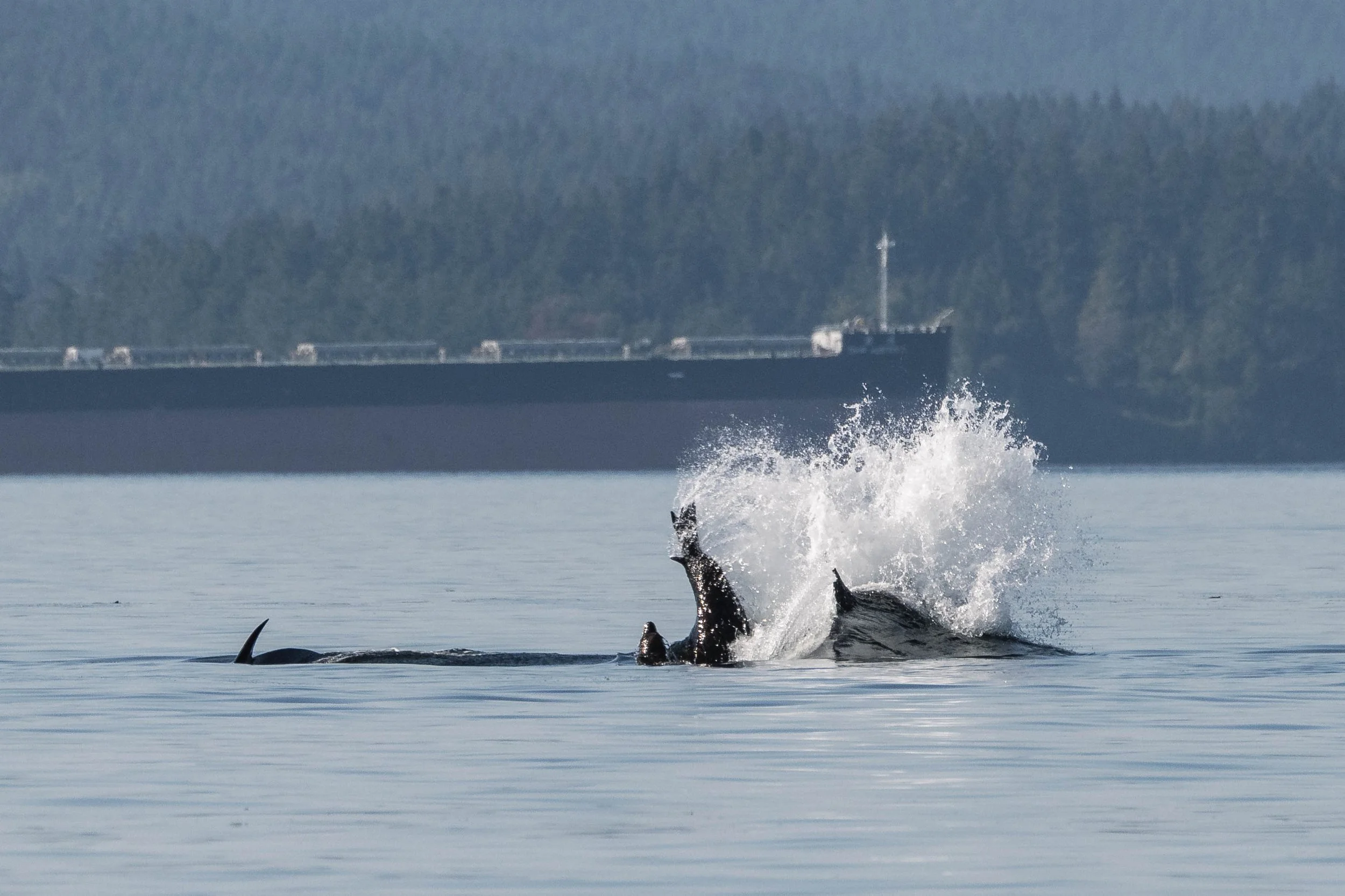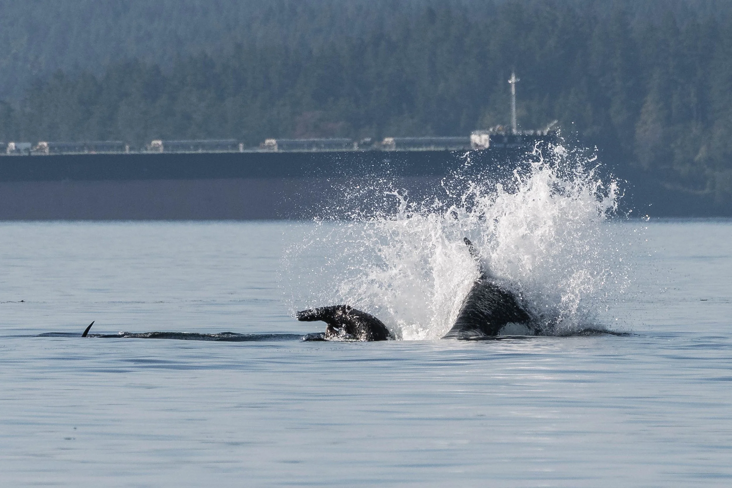 They began porpoising (shallowly jumping out of the water), rapidly picking up speed, a far cry from the slow travel they were doing minutes before. Our cameras were clicking away as we began to capture the unfolding action in front of us. The T099s and T036A1s were hunting. Their hunt was so efficient that while on scene, we were not entirely sure what they were hunting. After reviewing photos, it became clear that these orca had caught a sea lion. After a quick stop to divide up the catch, the members of the pods began celebrating. They began porpoising, breaching, tail-slapping, and pectoral fin-slapping at the surface, very excited to have full bellies. Hunts such as this one are vital for young orca to learn the best (and safest) ways to take down prey, especially for females who may one day leave their mother’s side to have a matriline of their own.