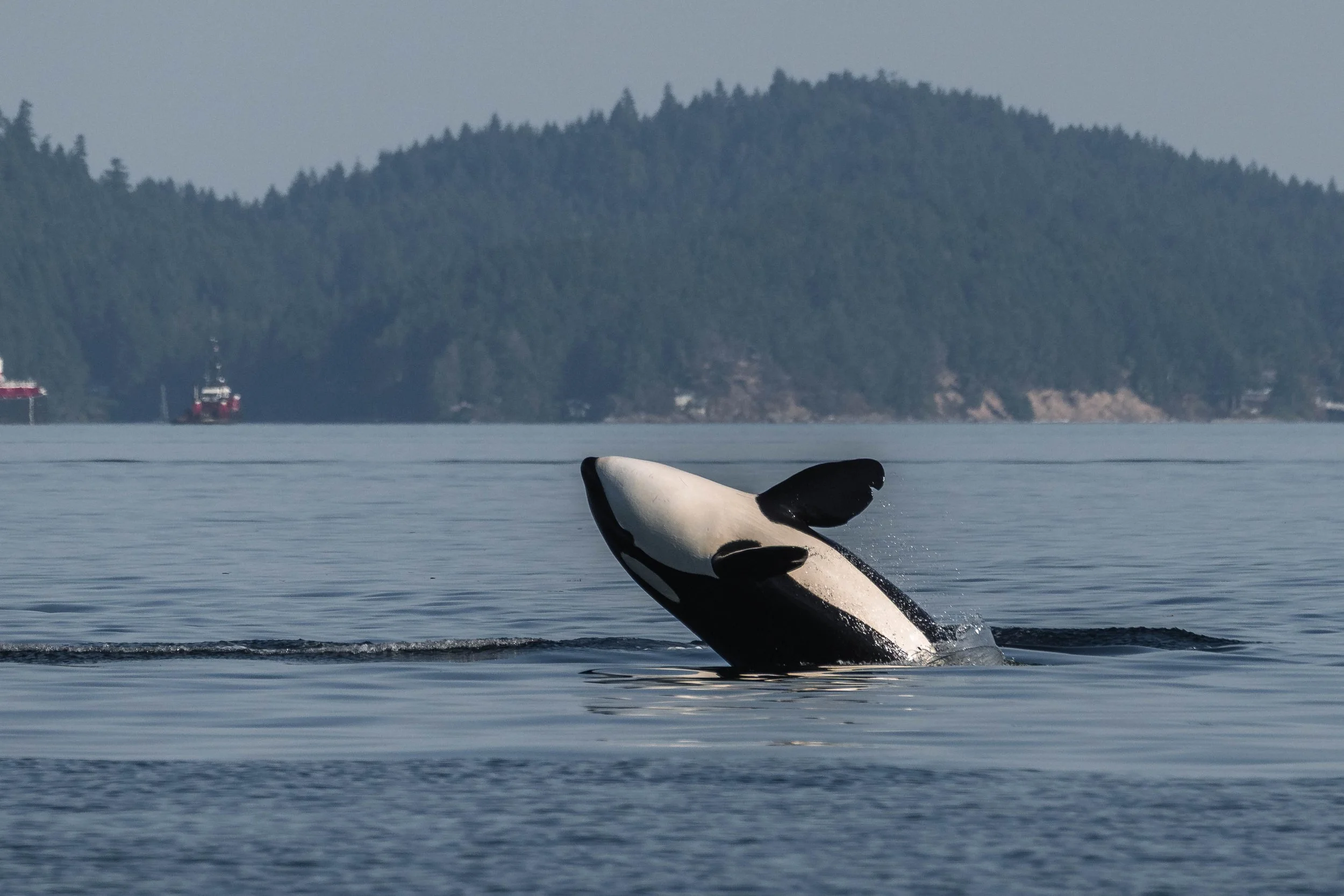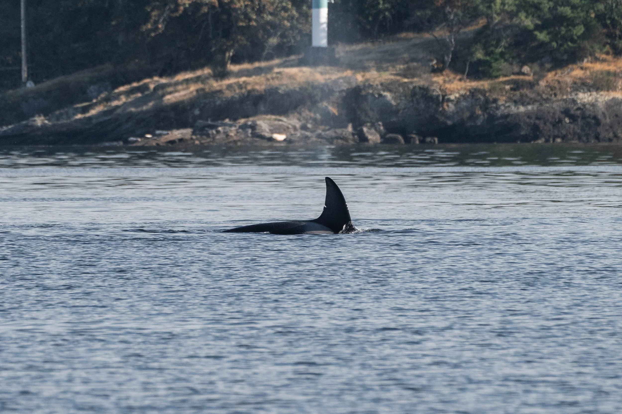 After our pocket full of humpback encounters, we started venturing into the Southern Gulf Islands. We had gotten word that there was an interesting encounter occurring off of Vancouver Island’s coast, and we were eager to go check it out ourselves. As we approached, beautifully backlit blows were cast into the air as several orca surfaced simultaneously. The Naturalists excitedly started snapping photos, this time relying mostly on dorsal fin photos and saddle patch photos, and confirmed these whales as the T036A1s and T099s: