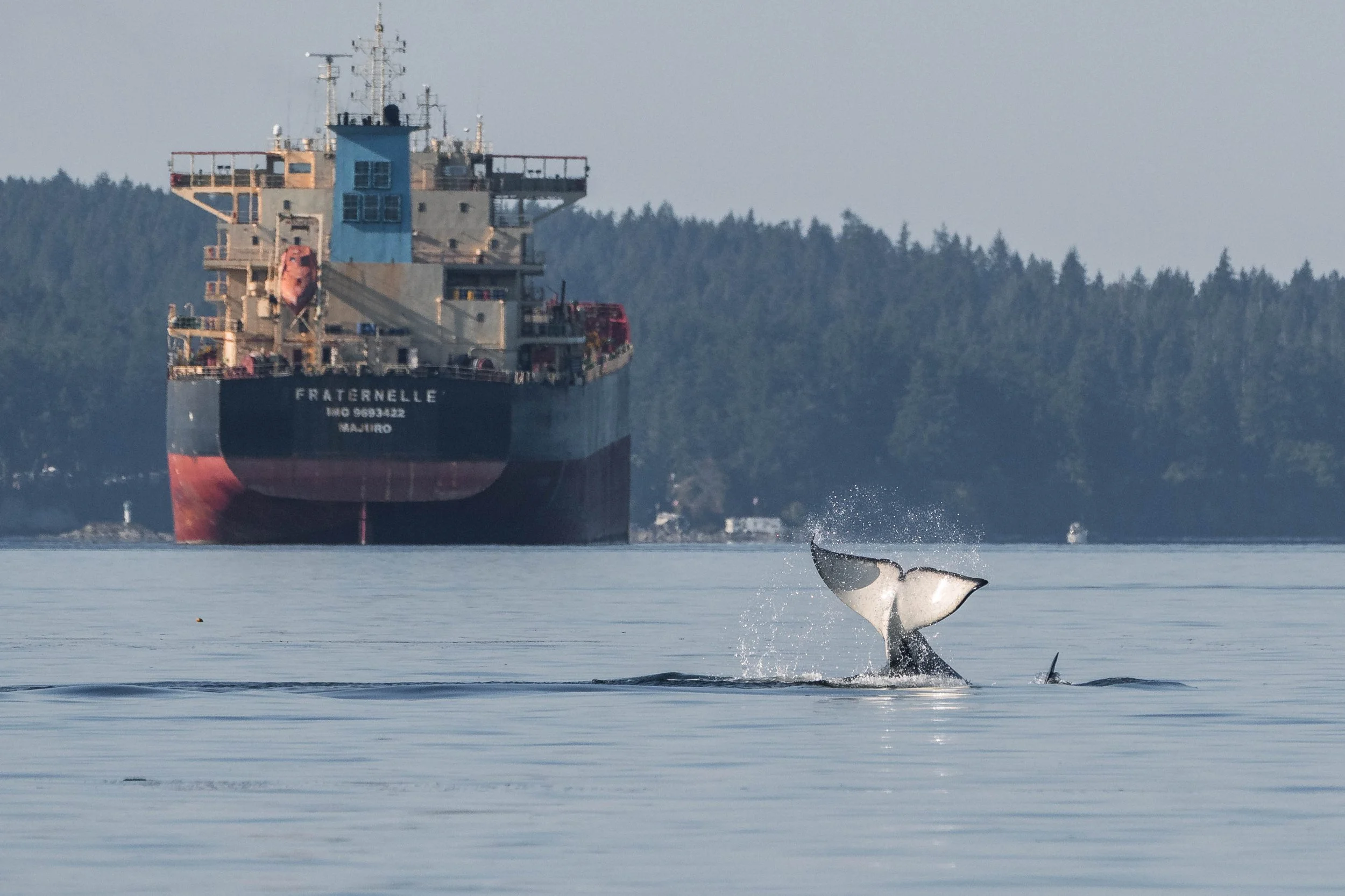It was a gorgeous mid-September afternoon as we set off, eyeing the waters for whales. With the full fleet out and about, we spread out, covering a large area of water as we began looking around. We didn’t have to venture far, though, as a pair of blows and flukes were spotted off Gabriola Island, just outside our harbour. This pair was travelling close together, surfacing and diving synchronously as we watched. As they dove, our onboard Naturalists began snapping photos to identify the individuals with. These two were confirmed as Frankenstein (BCX1358) and Yogi (BCY0409). We watched these two regularly dive and float along, potentially having short naps with ‘snack breaks’ in between. After staying with the pair for a bit, our vessels bid them farewell and headed onward.