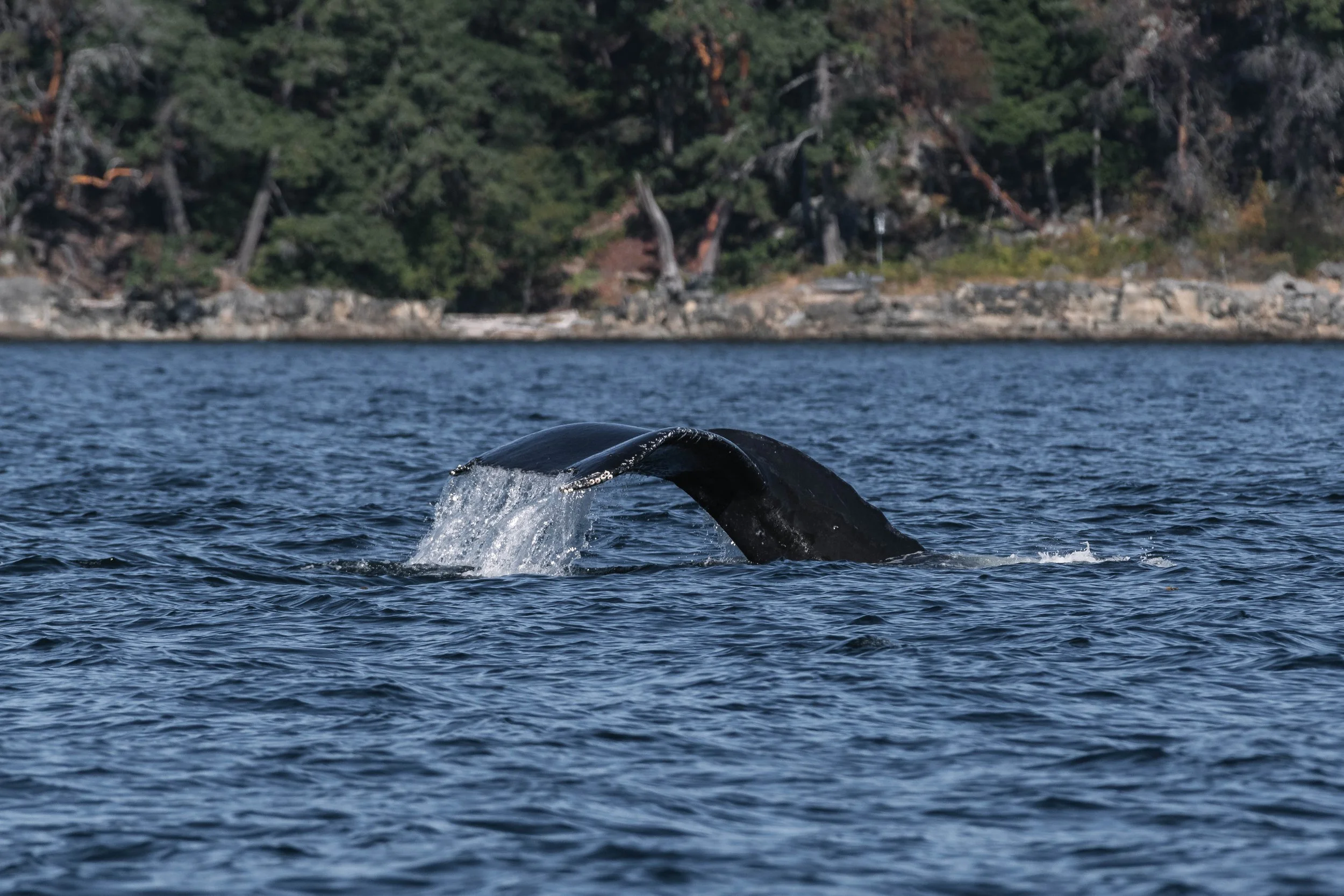 Luckily for us, just as those thoughts began to cross our minds, one of our boats spotted the telltale sign of a humpback whale: a large, bushy blow in the distance! We headed closer and soon saw more of the whale breaking the surface, travelling through Trincomali Channel, between Thetis and Valdes Islands. We watched as the whale surfaced several times, its distinctly hooked dorsal fin slicing through the calm water, before lifting its massive, nearly 20-foot-wide tail high into the air to begin a deep feeding dive.