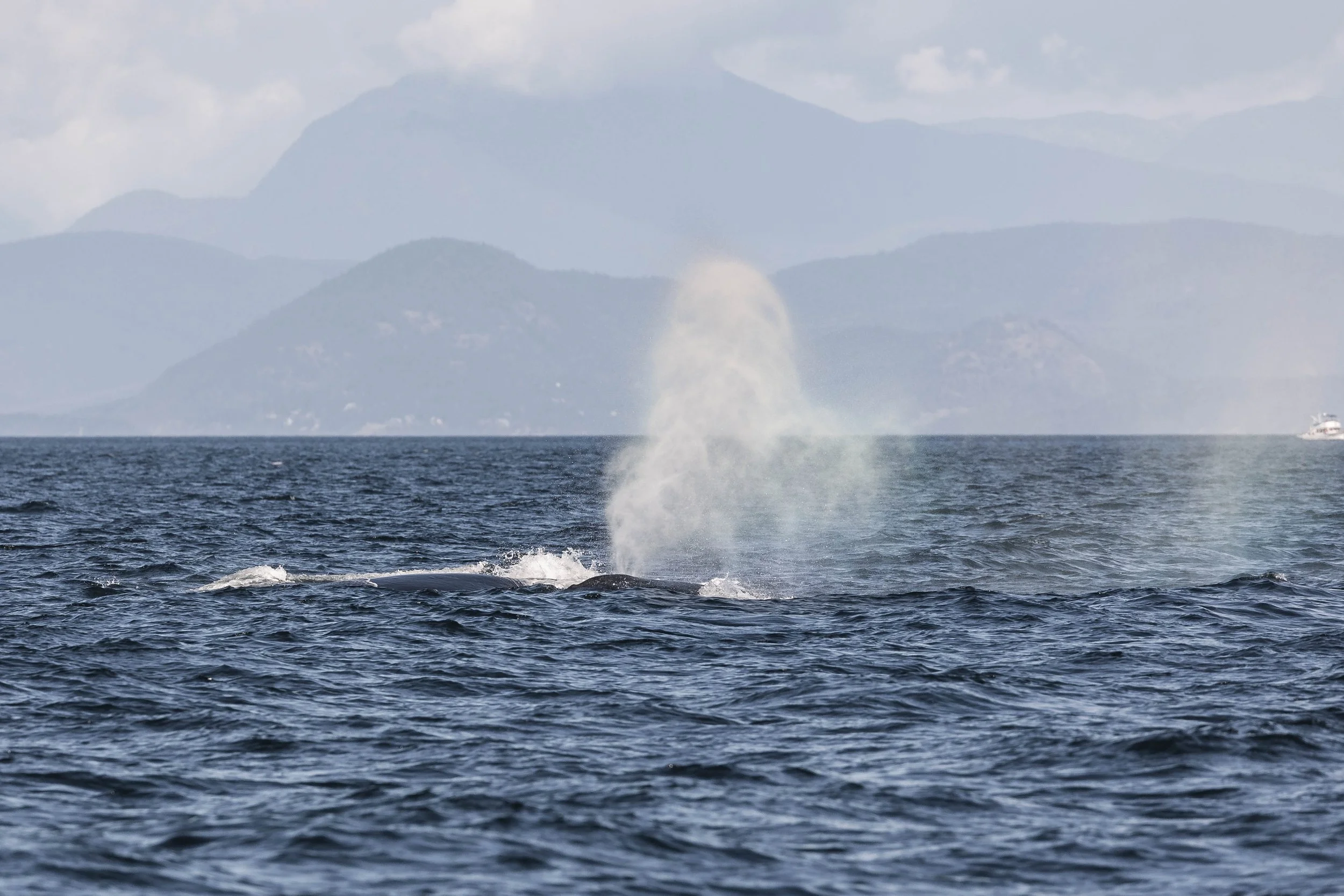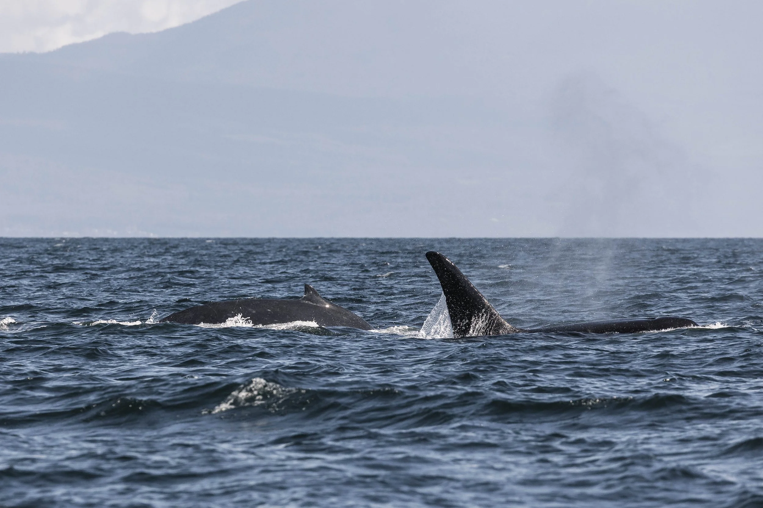 As we were approaching, it was an interesting sight to behold, as we saw both the tall, bushy blows indicating there were humpbacks present, as well as the black dorsal fins of orca in the mix. It seems that we stumbled across an interspecific interaction unfolding!