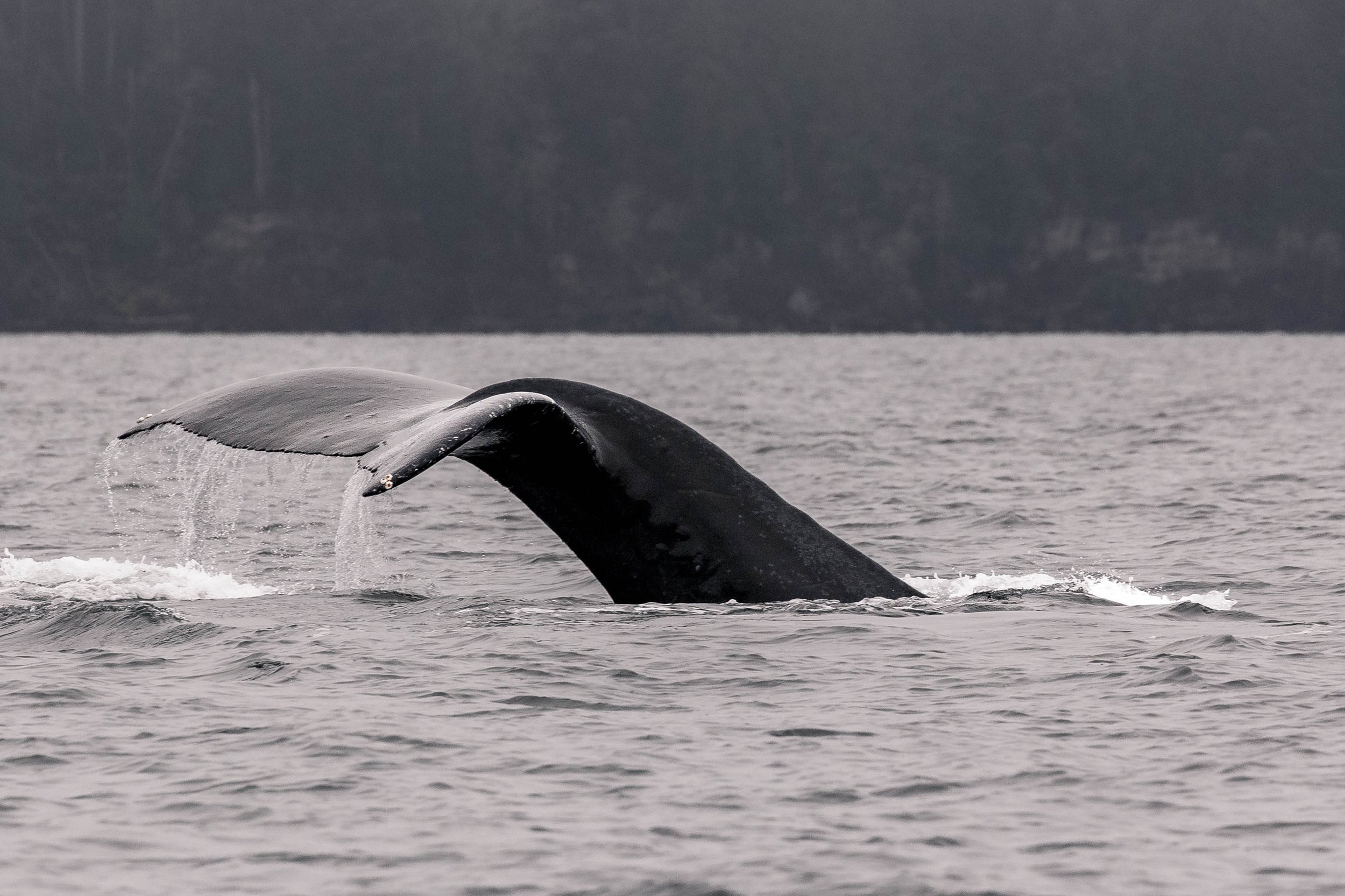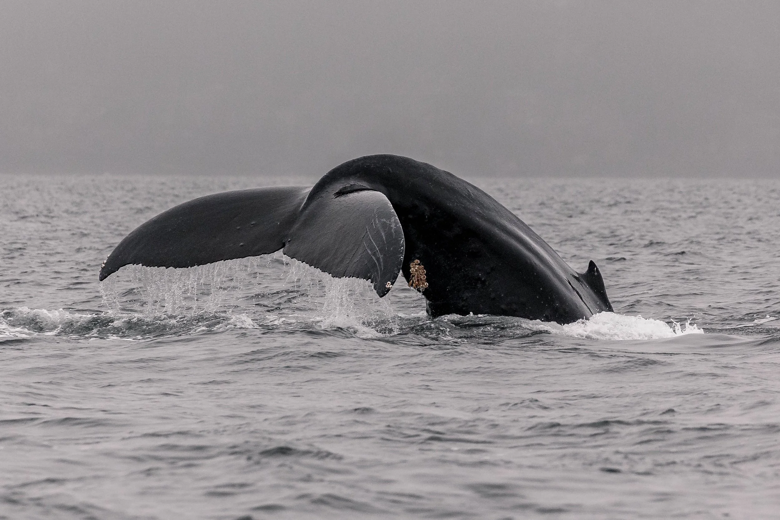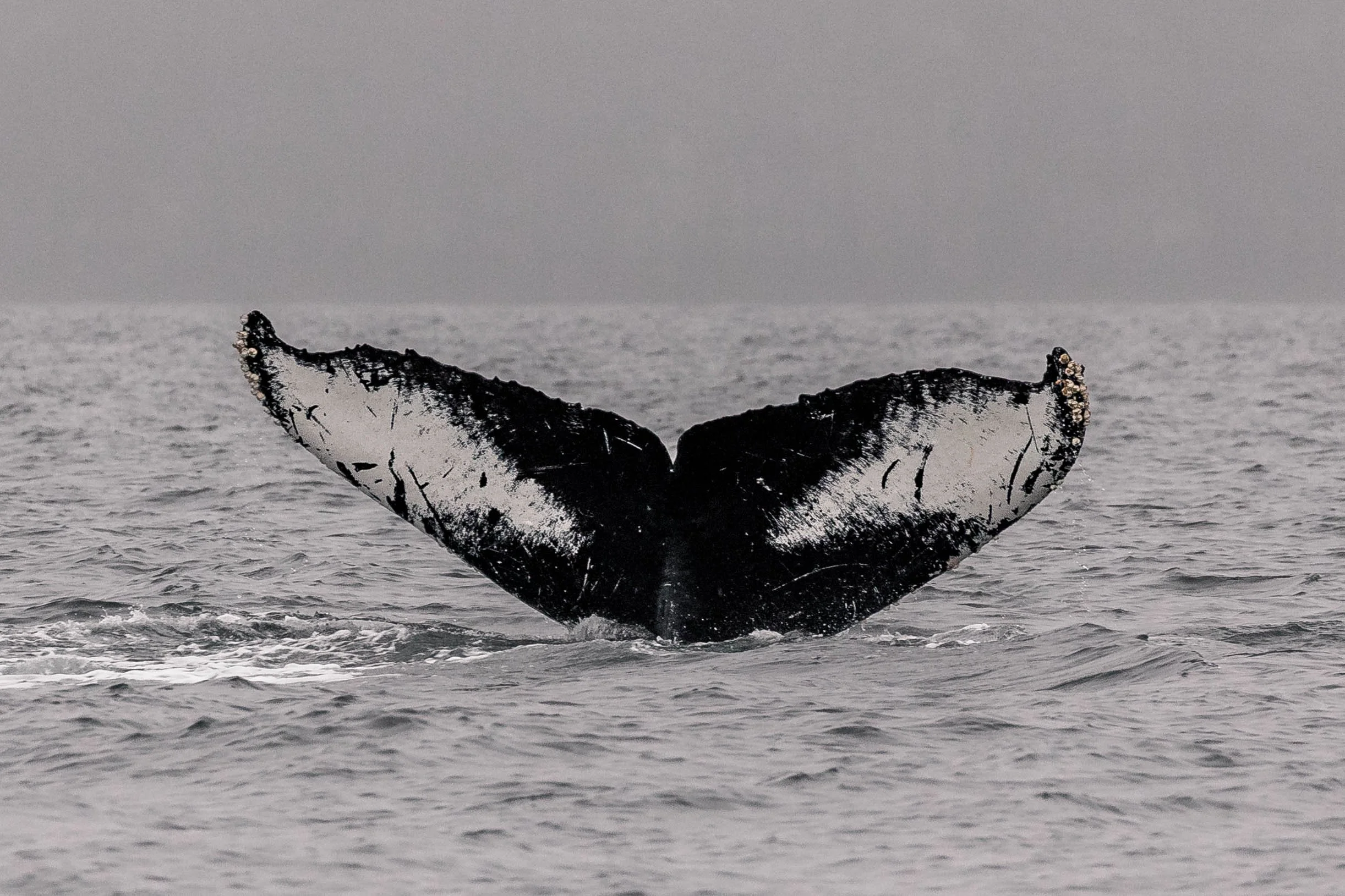 Once we were on scene, the next challenge began - identifying which whales we were with. Thankfully, all three of these whales were highly cooperative, and we soon captured photos of each of their flukes. The underside of a humpback’s flukes, or its tail, is a unique pattern of pigmentation, scars, scratches, lumps and bumps that is used as the primary identification method for this species. After taking these photos, we confirmed that the whales were Tempest (BCX0837), Graphite (BCX2077), and Kraken/Monarch/Pyramid (BCZ0180).