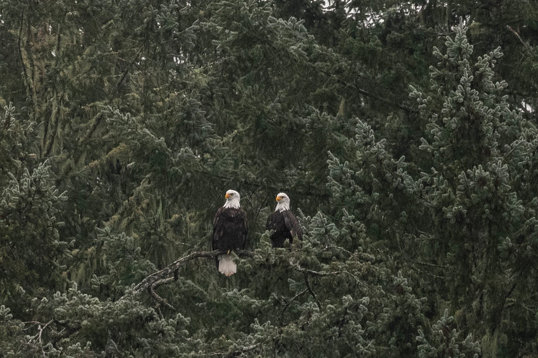 Near the end of our journey, another exciting wildlife species was spotted - a pair of Bald Eagles was perched high up in the trees, side-by-side. These two are likely a bonded pair. Bald Eagles are a monogamous species, and usually bond for life with their chosen partner. These pairs travel huge distances to return to their same breeding areas year after year, and often use the same nest every season as well. Because of this, every season these nests get bigger and bigger, and sometimes they can reach an impressive 5 to 6 feet (1.5-1.8 meters) in diameter!
