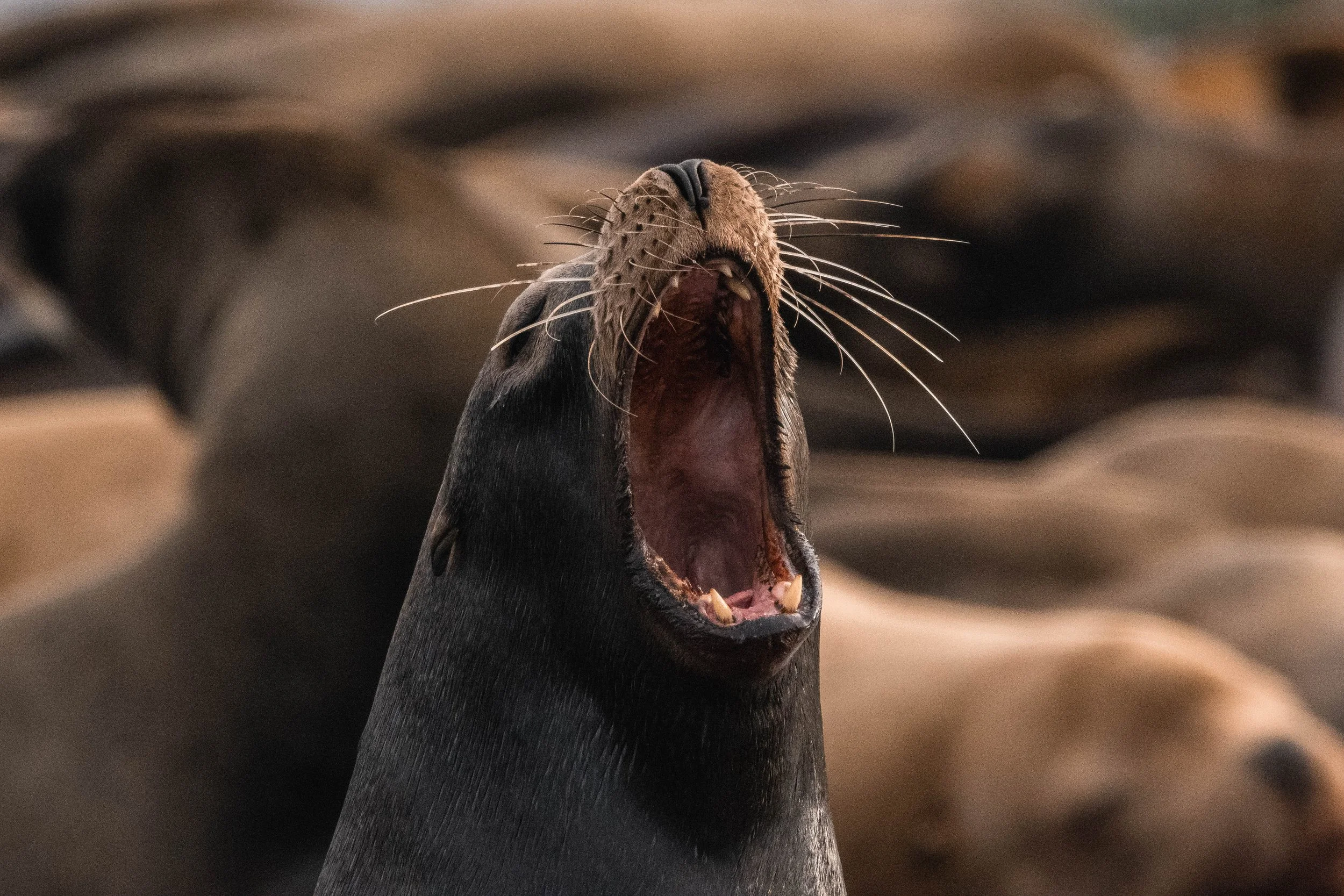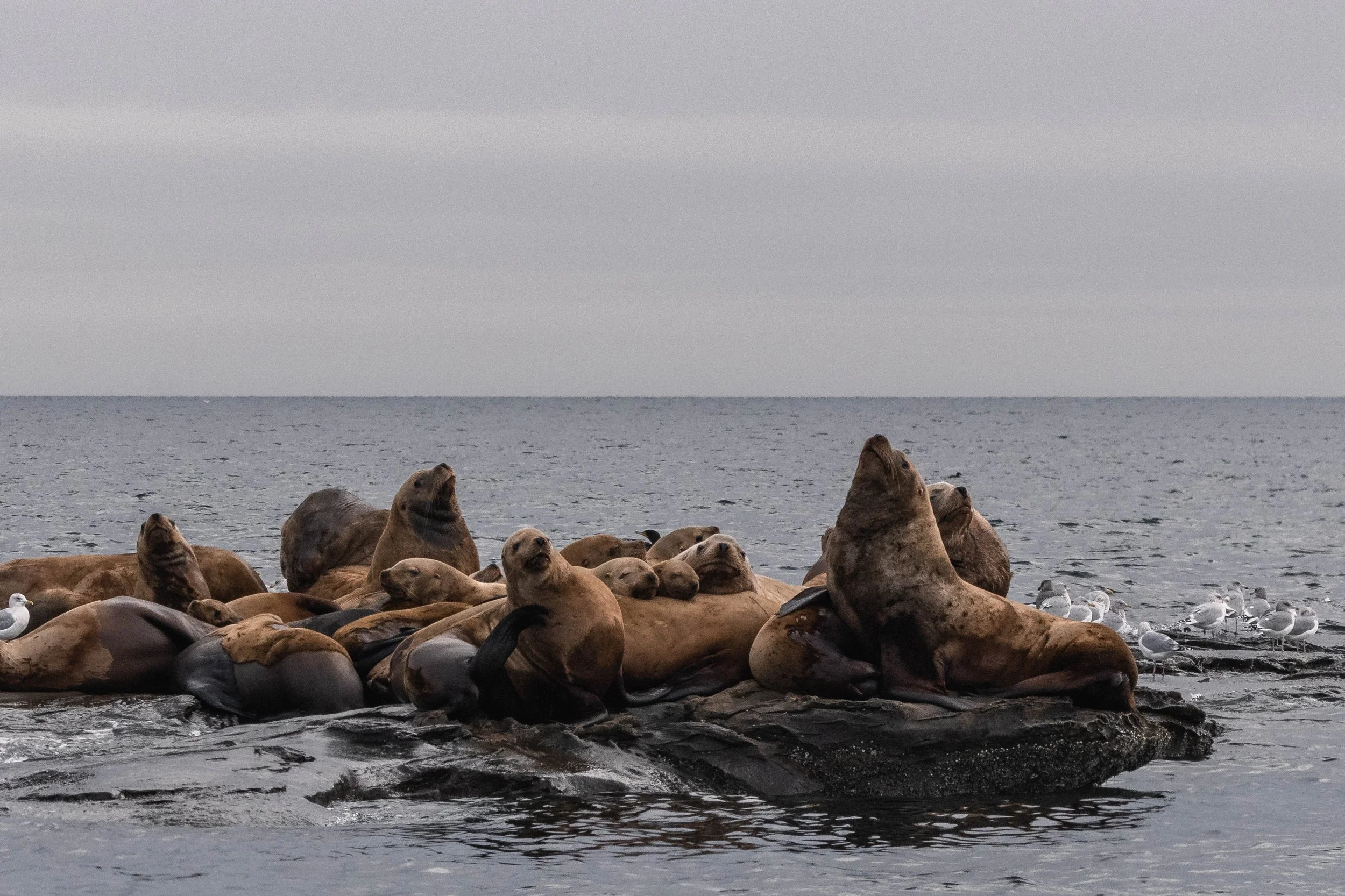 Steller Sea Lions migrate to our region from as far away as Alaska to take advantage of the rich feeding opportunities the Salish Sea provides. Haul-outs like Stinky Rocks play a crucial role in their daily rhythm; they use them to rest, digest their meals, socialize, and warm up after hours spent hunting in the cold Pacific waters. These impressive animals can weigh over 2500 pounds, yet somehow always manage to stack themselves into neat layers on surprisingly small rocks.