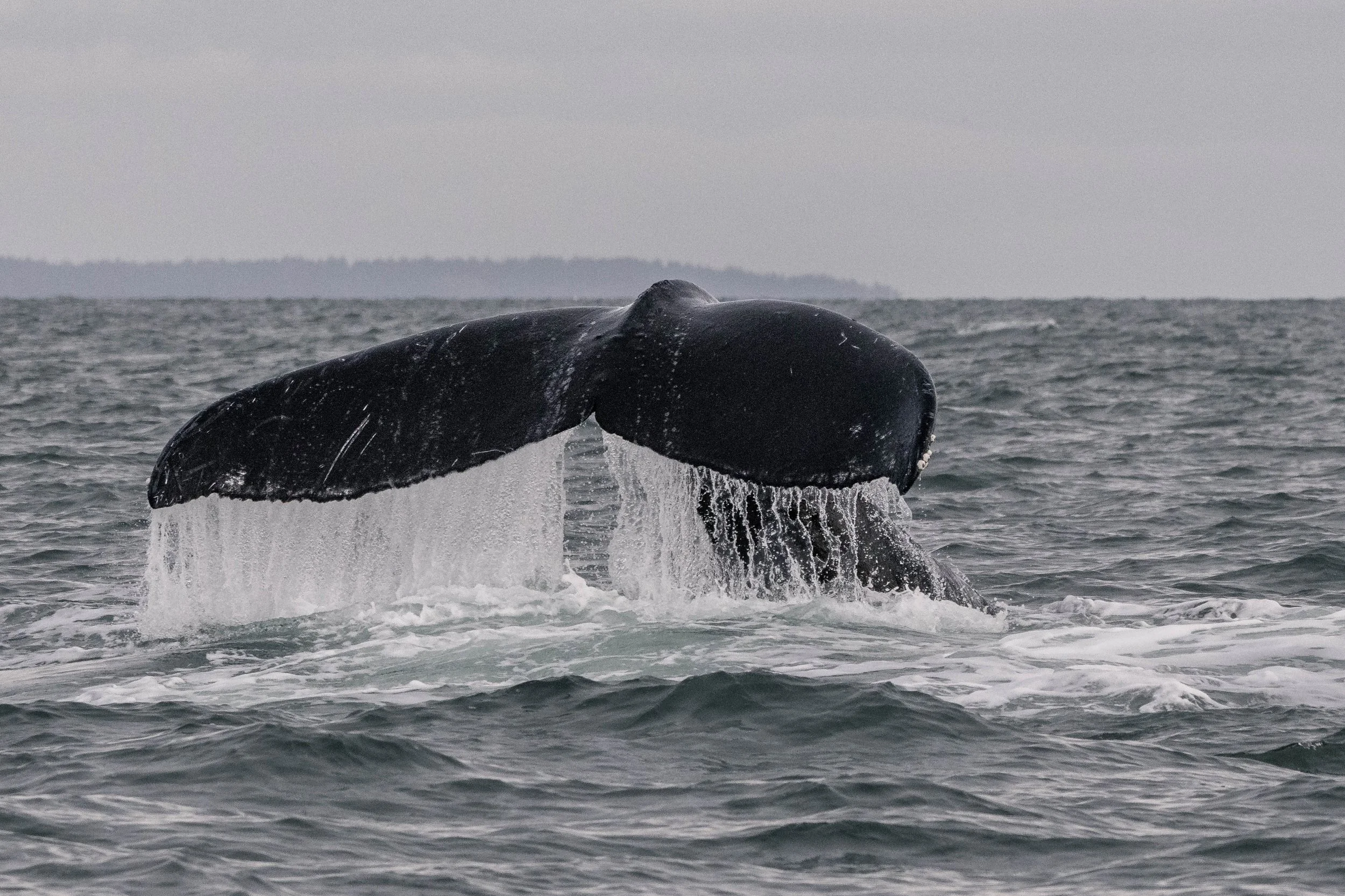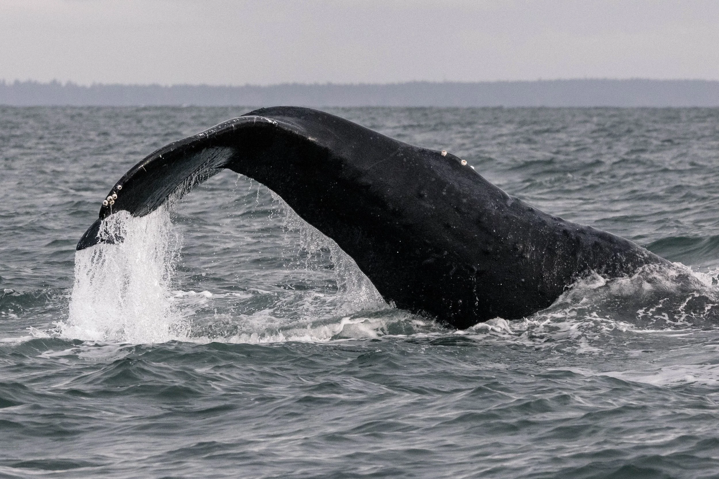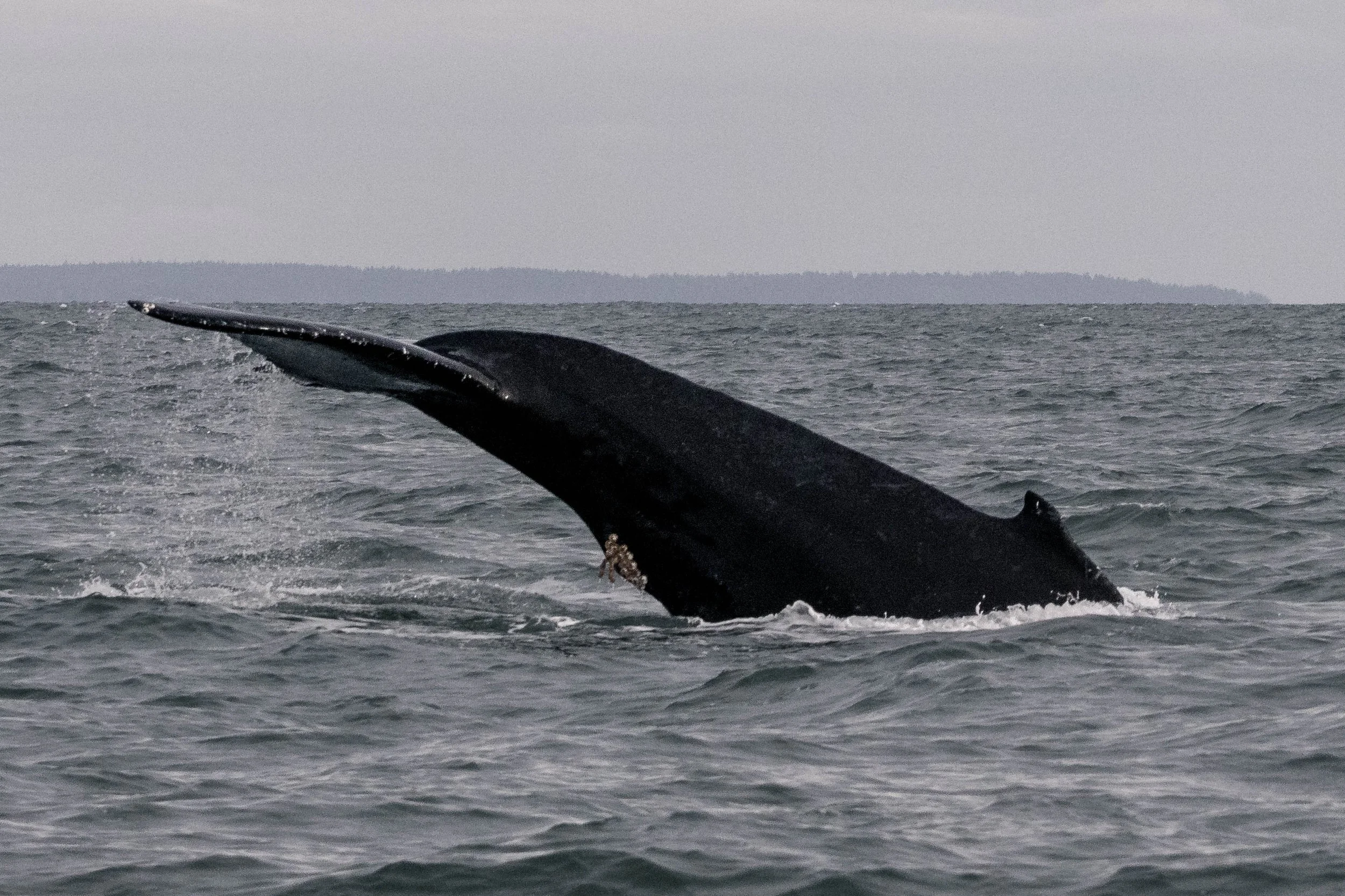The two tail-shy whales were identified as Dandelion (BCY1107) and Scuba (BCY1225). The third individual present was much more cooperative, fluking high, creating many opportunities for a clear ID shot. This whale was identified as Graphite (BCX2077). While the trio was initially travelling together, they soon broke apart, and Scuba and Dandelion continued on their way, with Graphite staying by himself. After the trio split up, Kula continued travelling with Graphite. Soon after that, Graphite excitedly started splashing around, quickly diving and tail lobbing away. These acrobatics are always amazing, mainly because scientists aren’t entirely sure why they do them. Slapping away constantly at the surface consumes a lot of calories, which is the exact opposite of what our humpbacks want to be doing just before their migration starts. Right now, they should be gobbling up as much as they can, getting in their last few meals before they depart, as they will not regularly feed again until they return to our area next summer. So, why would Graphite decide to be slap-happy instead of focusing on conserving energy? The leading theories are that the quick slaps at the surface could help pull debris or parasites off the skin, relieving them of potentially itchy ‘hitchhikers’, or that it could be for communication to call other whales over, to either help group feed on a large school of fish/krill, or to warn other whales of potential dangers. Another reason Graphite could be slapping at the surface with his tail is to stun potential prey, leading to an easier time feeding - though that tends to be shorter slap-sessions than what was witnessed today!