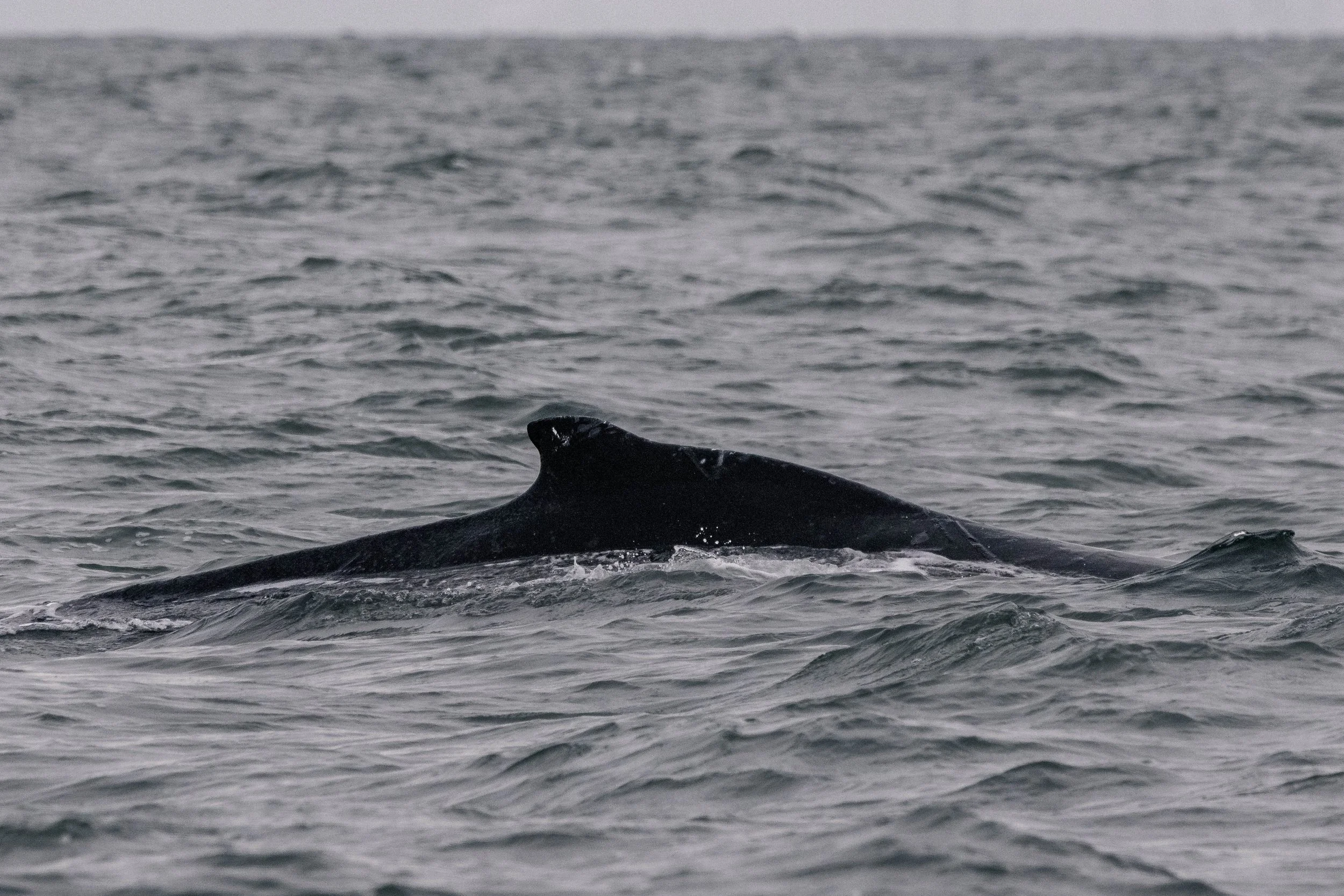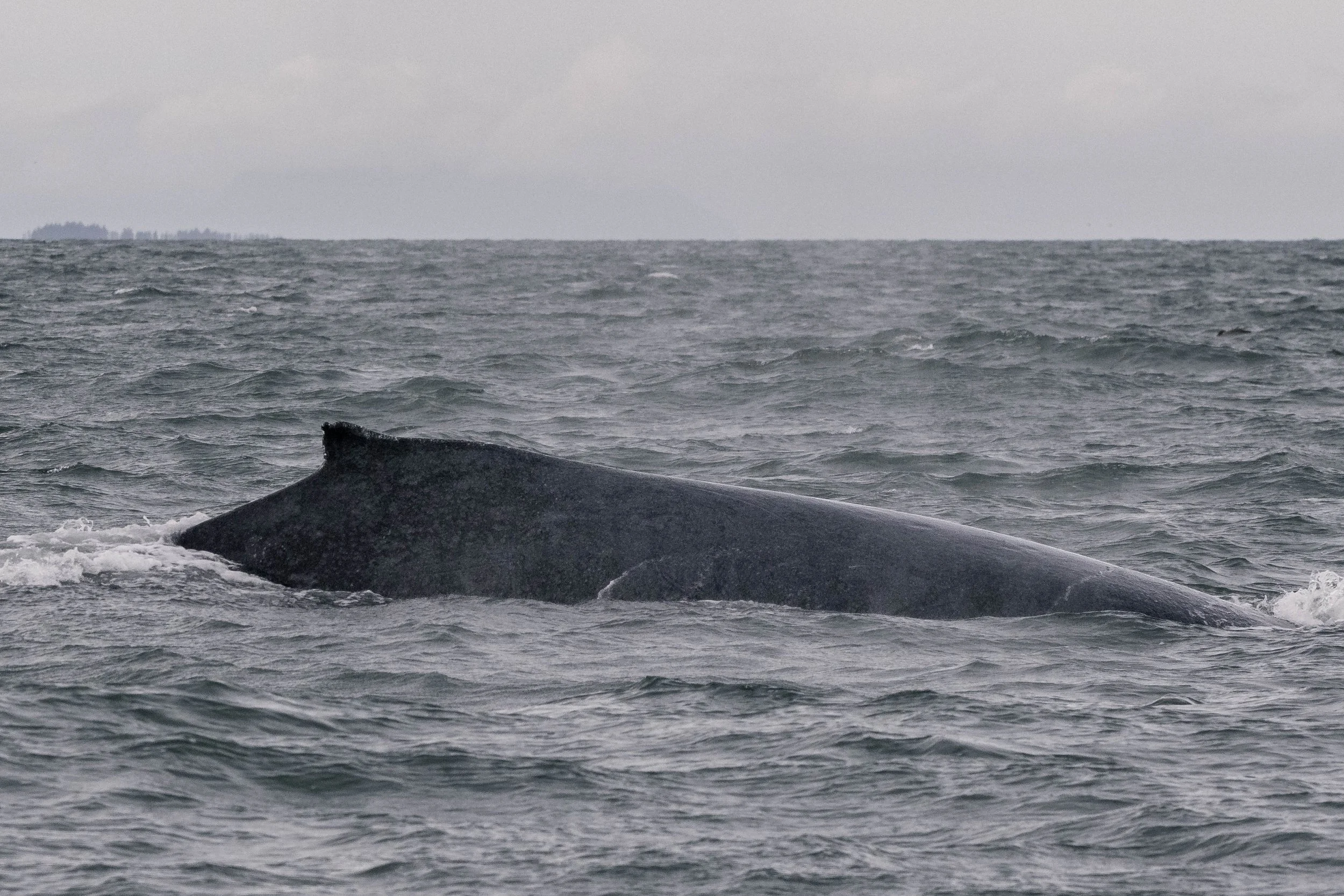 The trip took them southbound, to the waters off of Porlier Pass. This area has been packed with humpback sightings lately, and we were eager to try our luck. Peering around, we began searching until we found our first humpbacks of the day: a trio of humpbacks associating and travelling together! After our initial sighting, the team began getting into position, and our onboard Naturalist started working on identifying who they were with. For humpback whales, we usually use the underside of their tail to identify them individually. The ventral side of the flukes has a unique combination of pigmentation, alongside barnacles, scratches, bumps, scrapes, and sometimes notches, resulting in a highly distinctive pattern. With a photo of this, you can compare it to the ID catalogues for the area (for our area, we recommend the Keta Coastal Conservation Catalogue), and figure out who’s who! However, today the whales were being a bit tricky. Two of the individuals were rarely fluking, which can complicate identity confirmation. Thankfully, both of their dorsal fins (the fins on the top edge of their backs) were unique enough to confirm who they were.