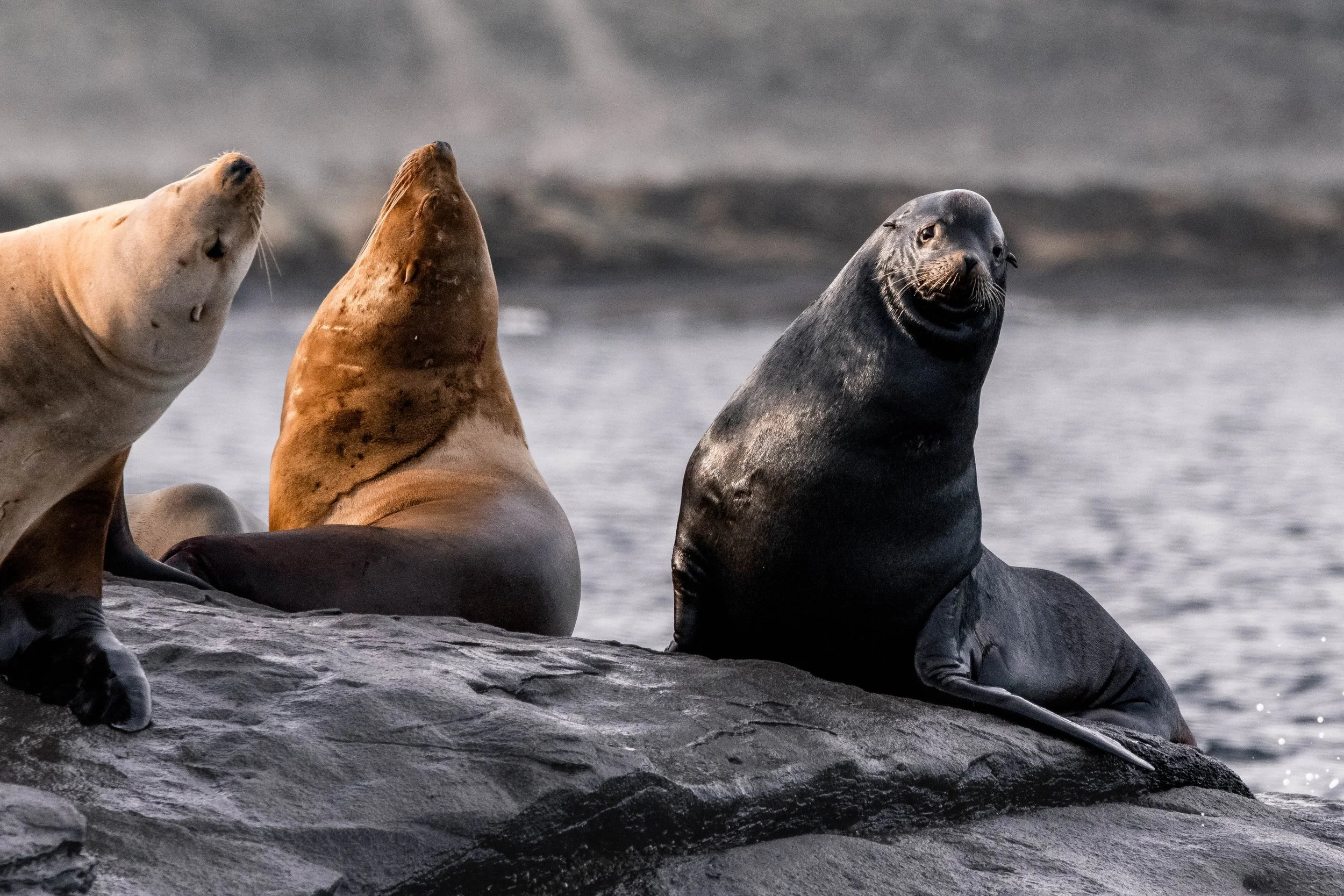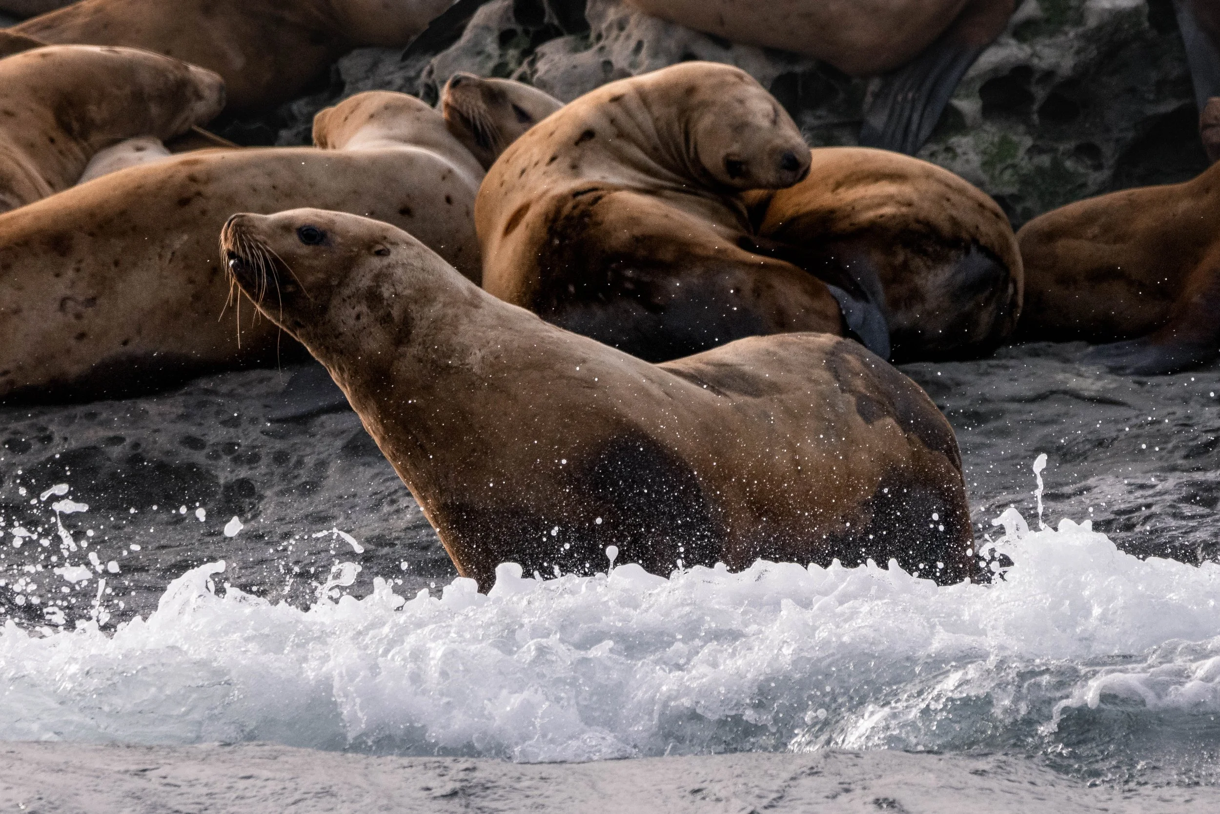 The first stop of the day was at “Stinky Rocks”, a well-known haulout. Here, many sea lions rest high up on the rocks, out of the frigid waters of the sea. Stinky Rocks has become very popular for our sea lions in the last couple of years, and it’s easy to see why: Stinky Rocks is a relatively large rocky outcropping, with multiple separated rocks available for them to sleep or rest on. The stones are also tall enough that, even during the highest tides, there typically is still a bit of rock poking out, meaning it is a haulout that is usable at all times of the day. If you rest on a rock that is only above water during low tide, every time the tide comes in, you’d end up getting washed off and needing to find another place to rest, resulting in more calories burned and less time to relax. After watching our sea lions for a bit, they headed out, beginning to search around the open waters of the Strait of Georgia.