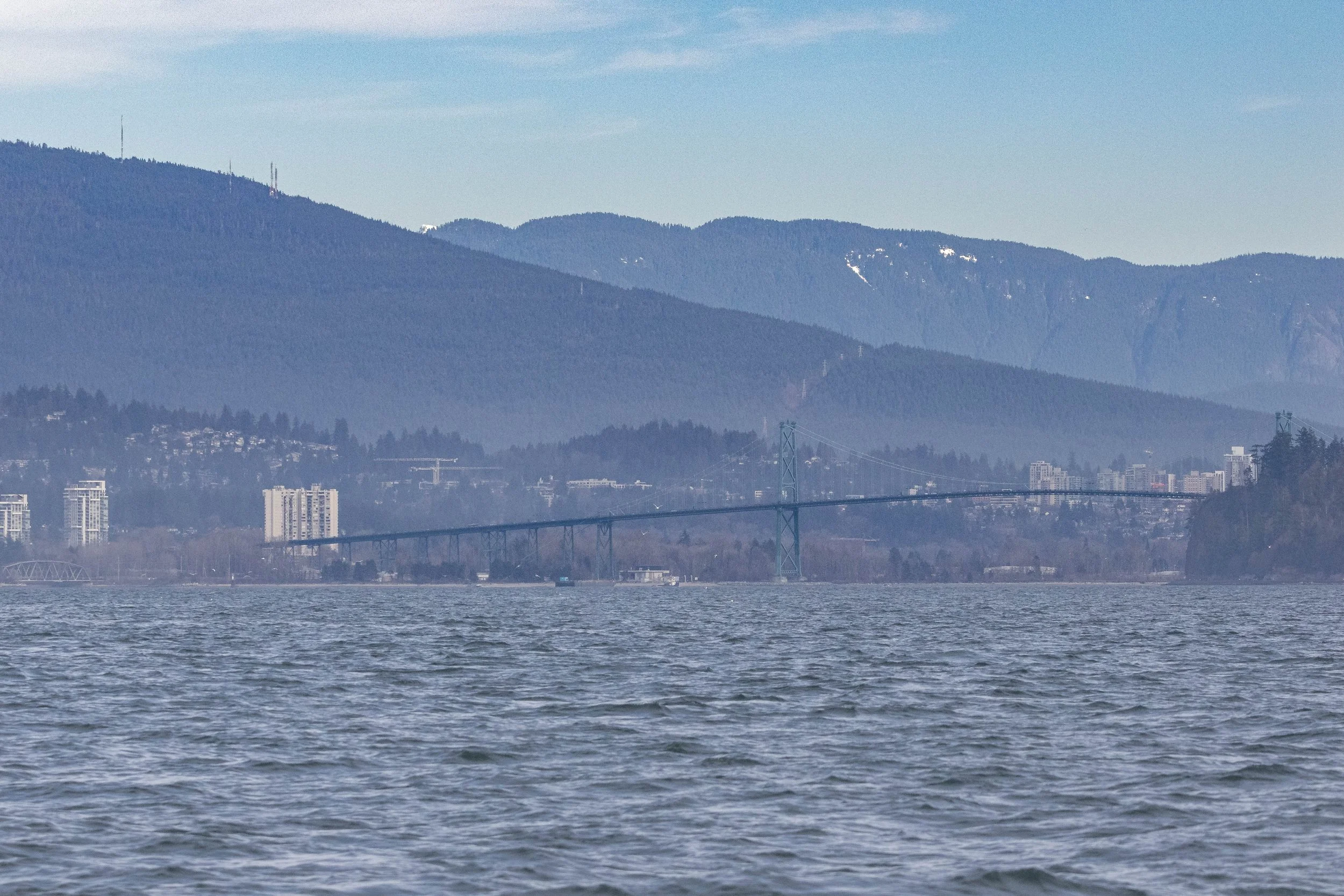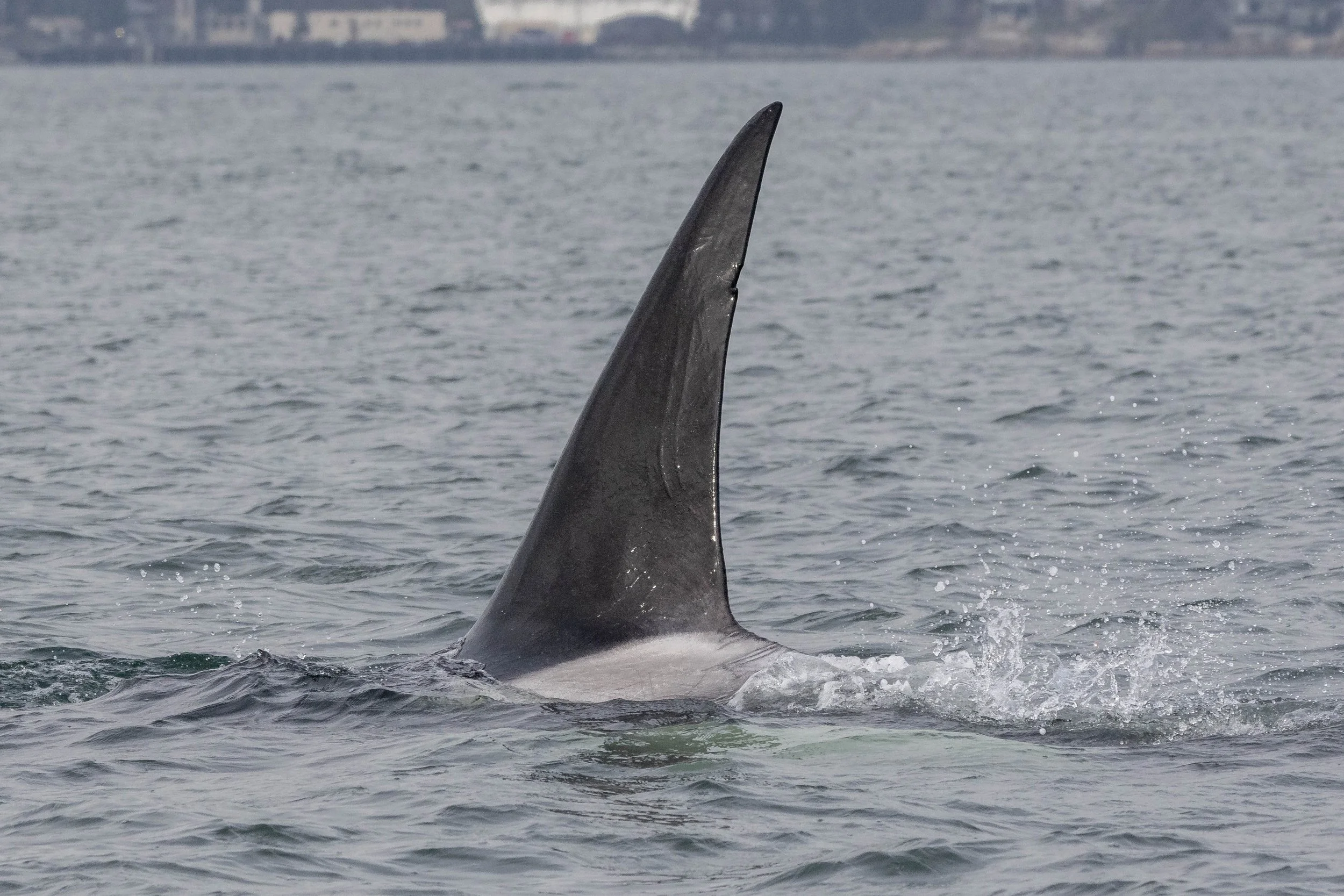 After a bit of searching, we caught word of a sighting of orca in English Bay near Vancouver! We made our way over and scanned until suddenly, two large dorsals popped up! These two big bull orca were identified as Harbeson and Cooper.