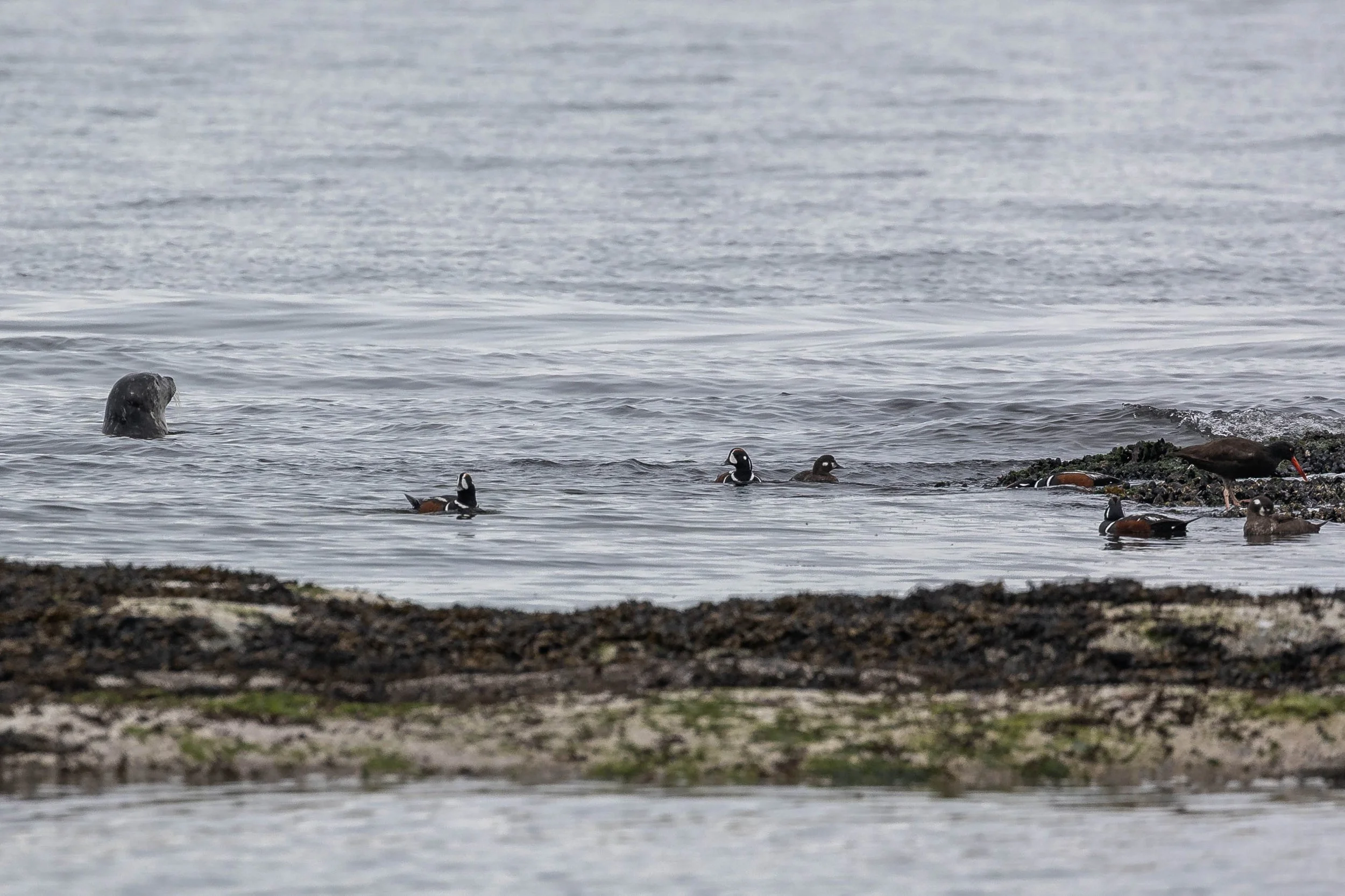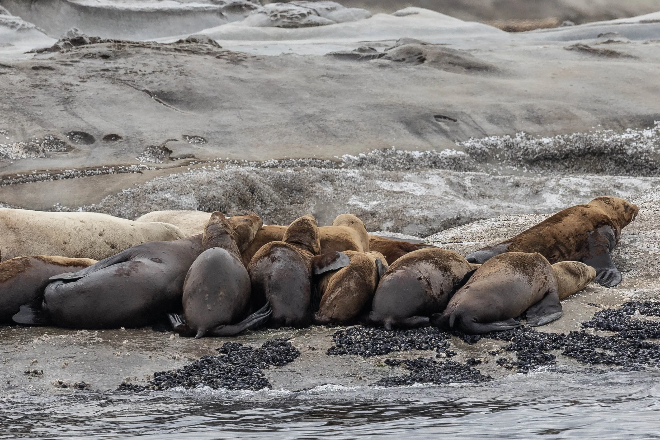 After our time watching Noah and Jude was up, we continued travelling inside the islands, coming across a haul-out site for some Harbour Seals and Steller Sea Lions! These pinnipeds are sometimes found in close quarters, although they have a preference for different environments to spend their time. Part of this is due to their morphology, as the higher mobility of sea lions allows them to move on steeper slopes, and sometimes man-made objects like buoys (as we got to see later). The Harbour seals are restricted to shallow slopes since they aren’t as mobile on land.