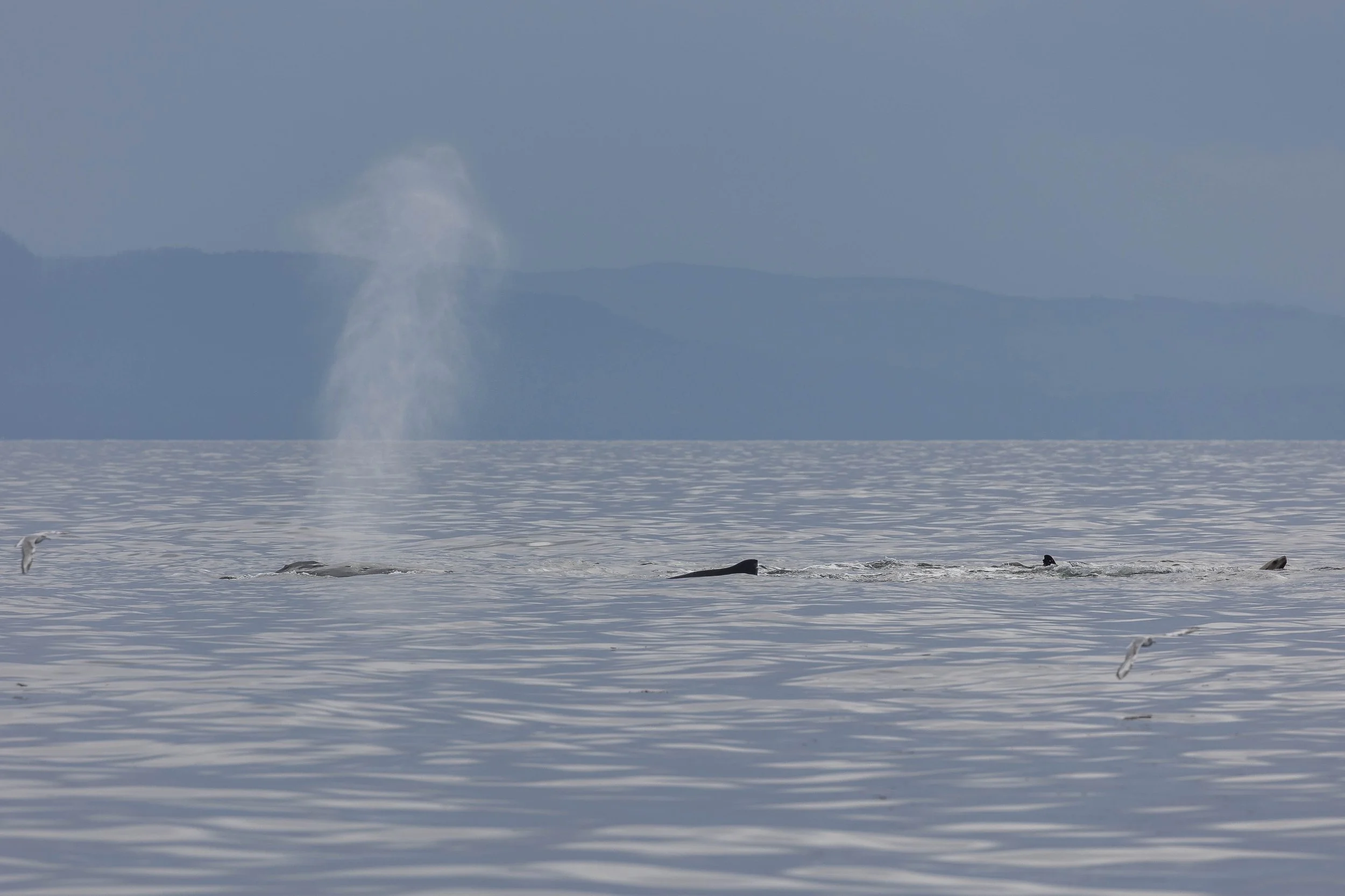 It seemed it wasn’t only this solo mystery whale feeding in the area, but we also managed to spot a pair of younger whales spending time together: Moraine (BCY1465) and Specter (BCX1333calf2023). These two also seemed to be feeding in the area, but they weren’t as gracious with their tails, but we got enough to confirm who it was we were seeing. There was tons of action here, with gulls and sea lions sharing the fishy feast with these humpbacks. It was quite the exciting sight! But all good things must come to an end, and time on the tour was running out, so we started the journey home.