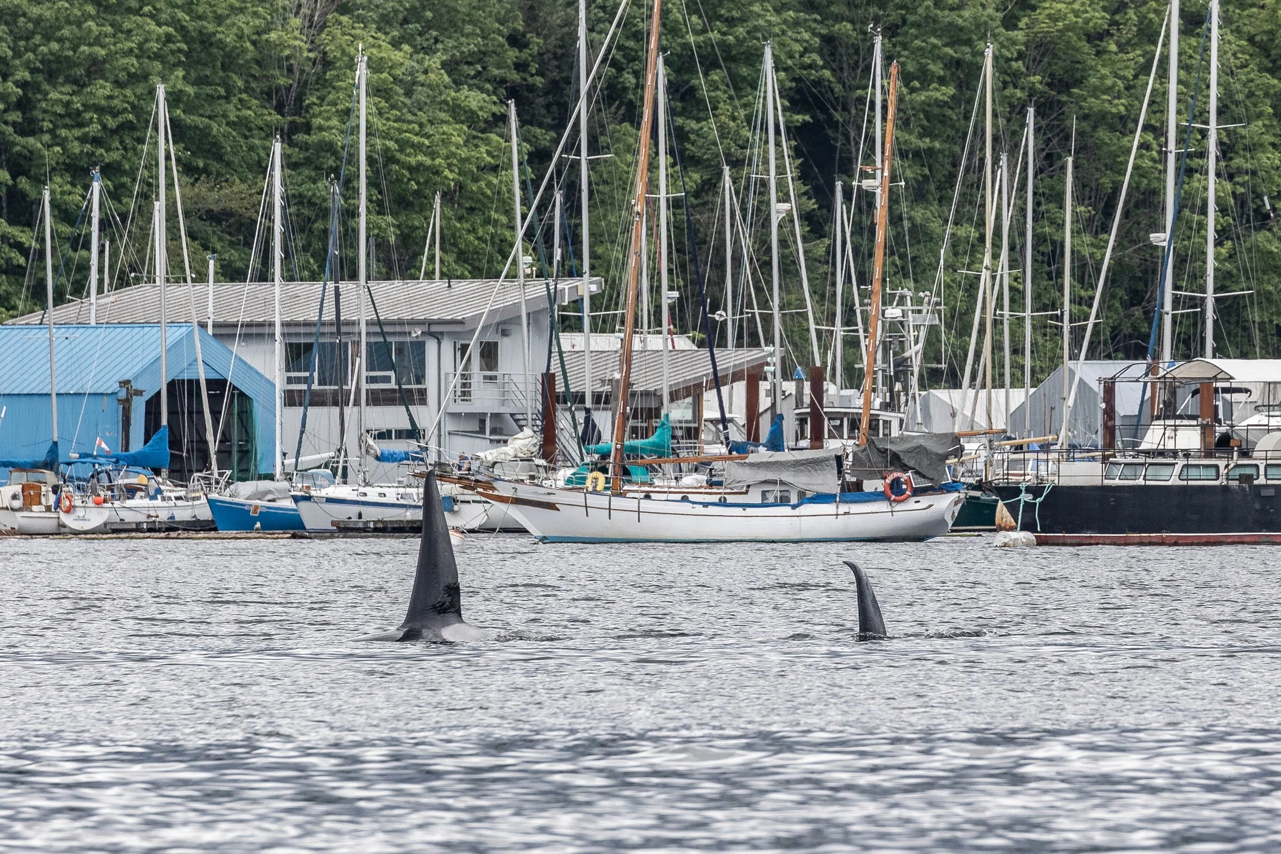It was another beautiful day as we left Nanaimo, heading south into the Southern Gulf Islands in search of whales for today. We had heard a rumour of a pair of orca that were seen from shore earlier in the day, so we decided to try our luck finding them. On the way, we did spot some little dorsal fins in the water, but it wasn’t orca! We had found some Pacific White-sided Dolphins! These small cetaceans are quite uncommon in our waters, more often found further north in the Strait, so we feel quite lucky whenever we can spot them on our tours. We searched all around the harbour for the orca, including searching the channels outside, before eventually giving up, deciding that the whales had evaded our detection. As if on cue, we finally saw the towering black dorsal fins of two orca break the surface of the water. We had found them! Grabbing the camera and snapping some photos, we quickly realized who we had. These two have been in the area a lot lately, and are easy to ID thanks to their unique dorsal fins. It was Noah and Jude!