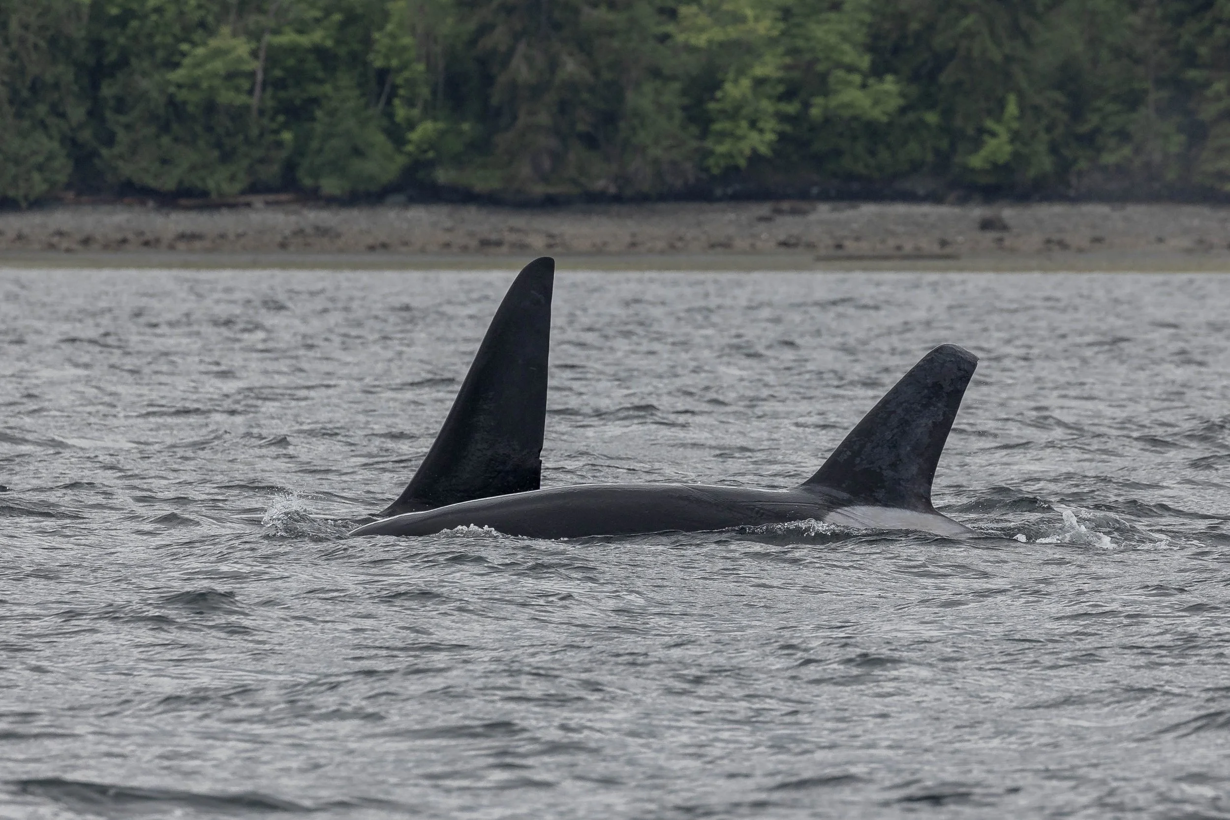 The T049A brothers have been glued at the hip for the past couple of weeks. Being mature males, it’s very common that they would be travelling on their own, and in the past, this is something they have both done frequently! But ever since they met up a few weeks ago, these two brothers have decided to stick together. Maybe they are more efficient hunting together rather than alone, and enjoy working together to hunt the various marine mammals of the Salish Sea. Or maybe they just enjoy terrorizing the neighbourhood together! Whatever the reason, they are sticking together, it’s amazing to watch two large, graceful males make their way through the calm waters of the Gulf Islands. These two are very different in appearance, making IDing them a breeze. When identifying individual orca, we often look at the dorsal fin for clues. Size, shape and scarring are all great indications of who an animal may be. In Noah’s case, he sports a small notch on the lower part of his large dorsal fin. Jude, on the other hand, has a very curved tip to his dorsal. This hooked tip is easy to spot (and ID!) from far away, which is great for expert naturalists and amateur spotters alike!