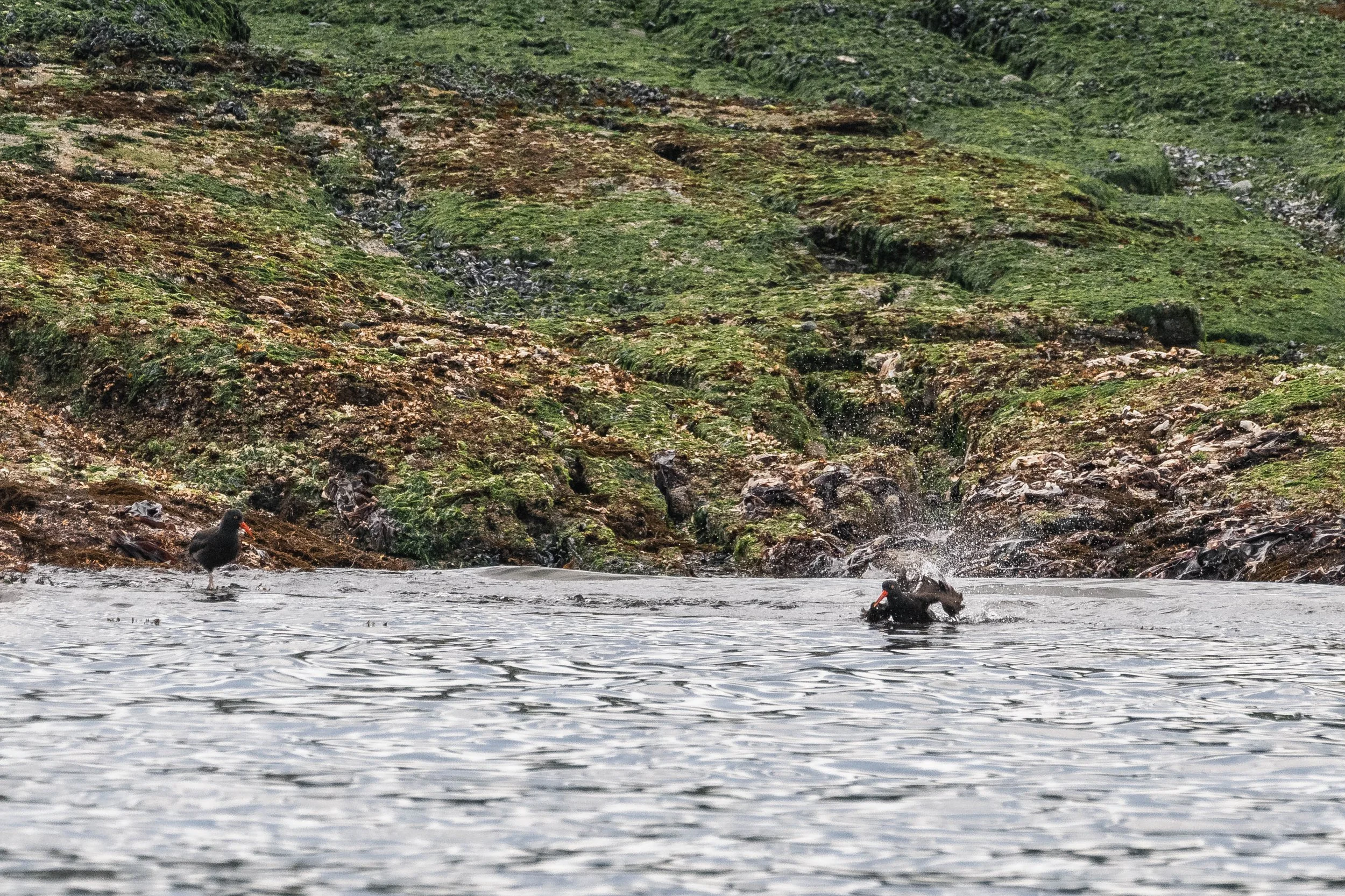 A black oyster catcher taking a bath. Photo by Val Watson.