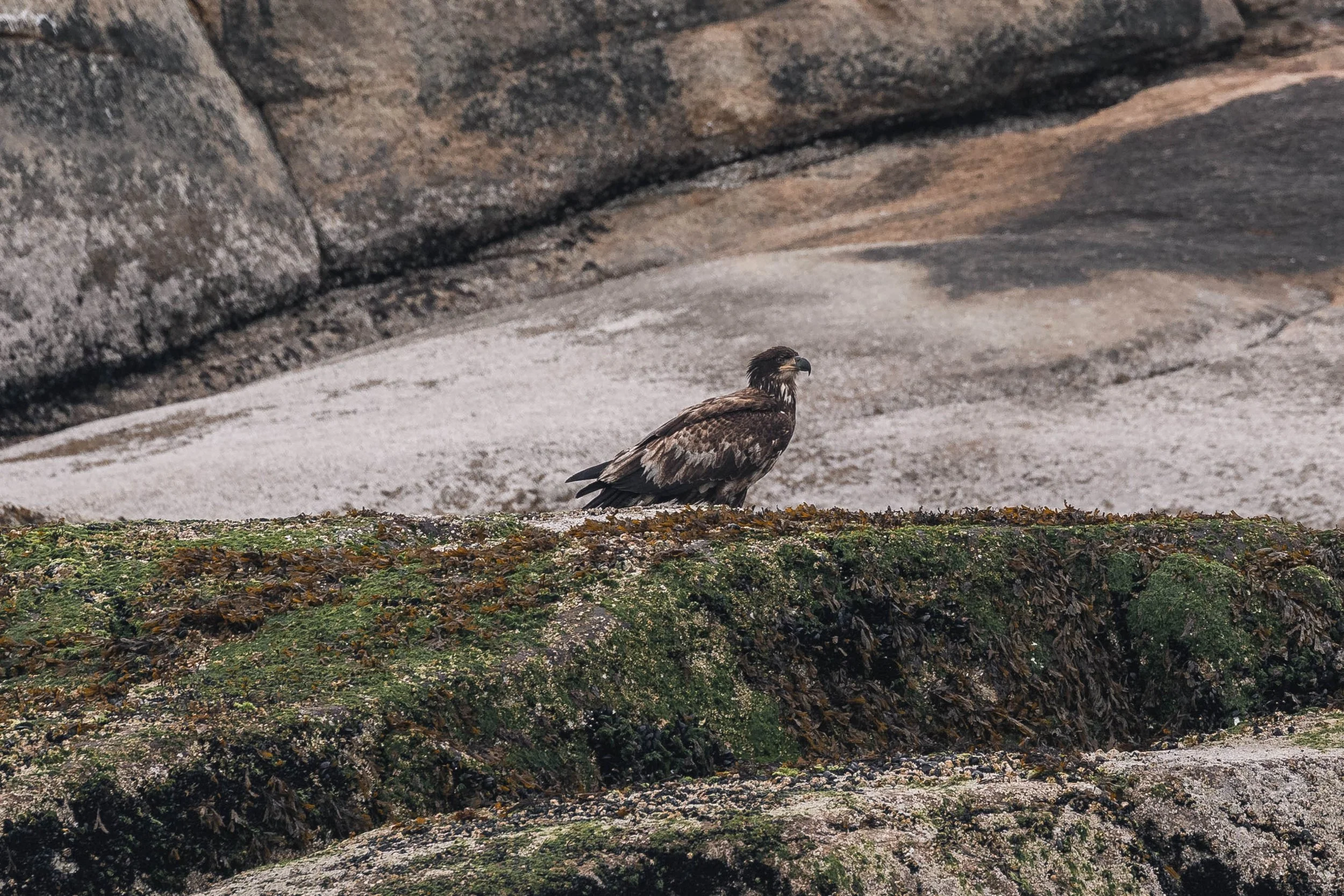 We spotted some of our familiar harbour seals hauled out on the rocks, always adorable and entertaining to watch. We were also lucky enough to encounter both species of sea lions today. The massive Steller sea lions, with mature males weighing up to 2,800 pounds, and the California sea lions, smaller but still impressive, with males reaching up to 1,000 pounds. A river otter was enjoying a meal on the bank before cooling off with a swim. Eagles were everywhere; we saw a mix, mature bald eagles, recognizable by their distinct white heads and tails, and juveniles, who sport a mottled blend of brown and white feathers. They won’t acquire their iconic white plumage until around five years of age. We even got a glimpse of a chick in the nest, offering a glimpse at the eagle’s growth cycle. Last but not least, we spent some time at the Gabriola Bluffs, where sleek black cormorants nest along the rocky cliffs, and vibrant sea stars were visible in the intertidal zone thanks to the low tide.