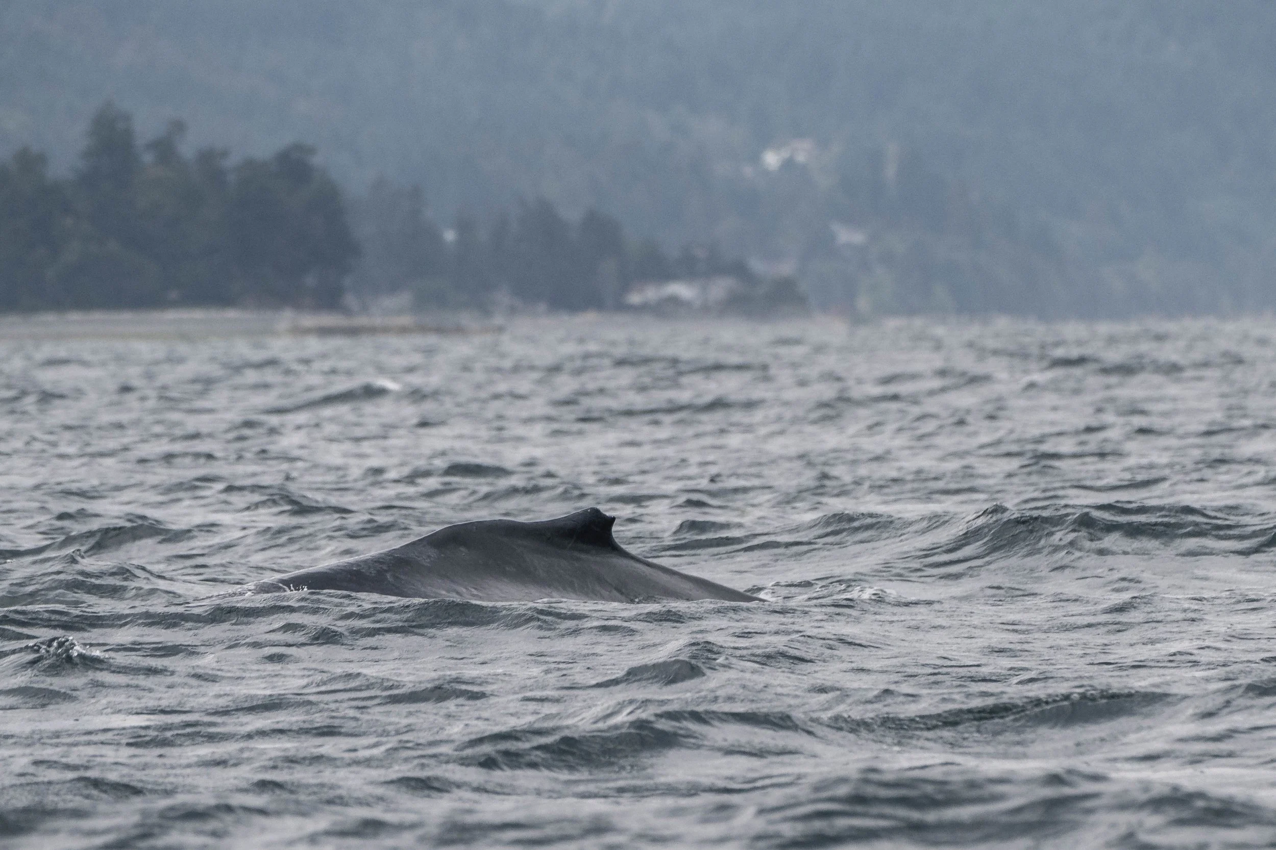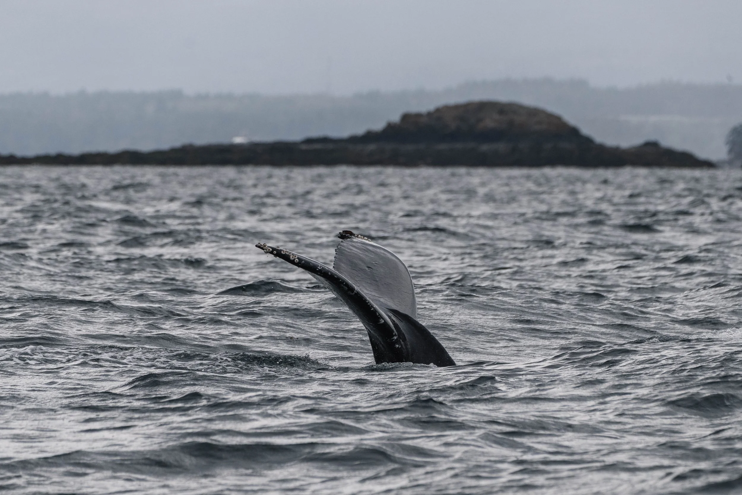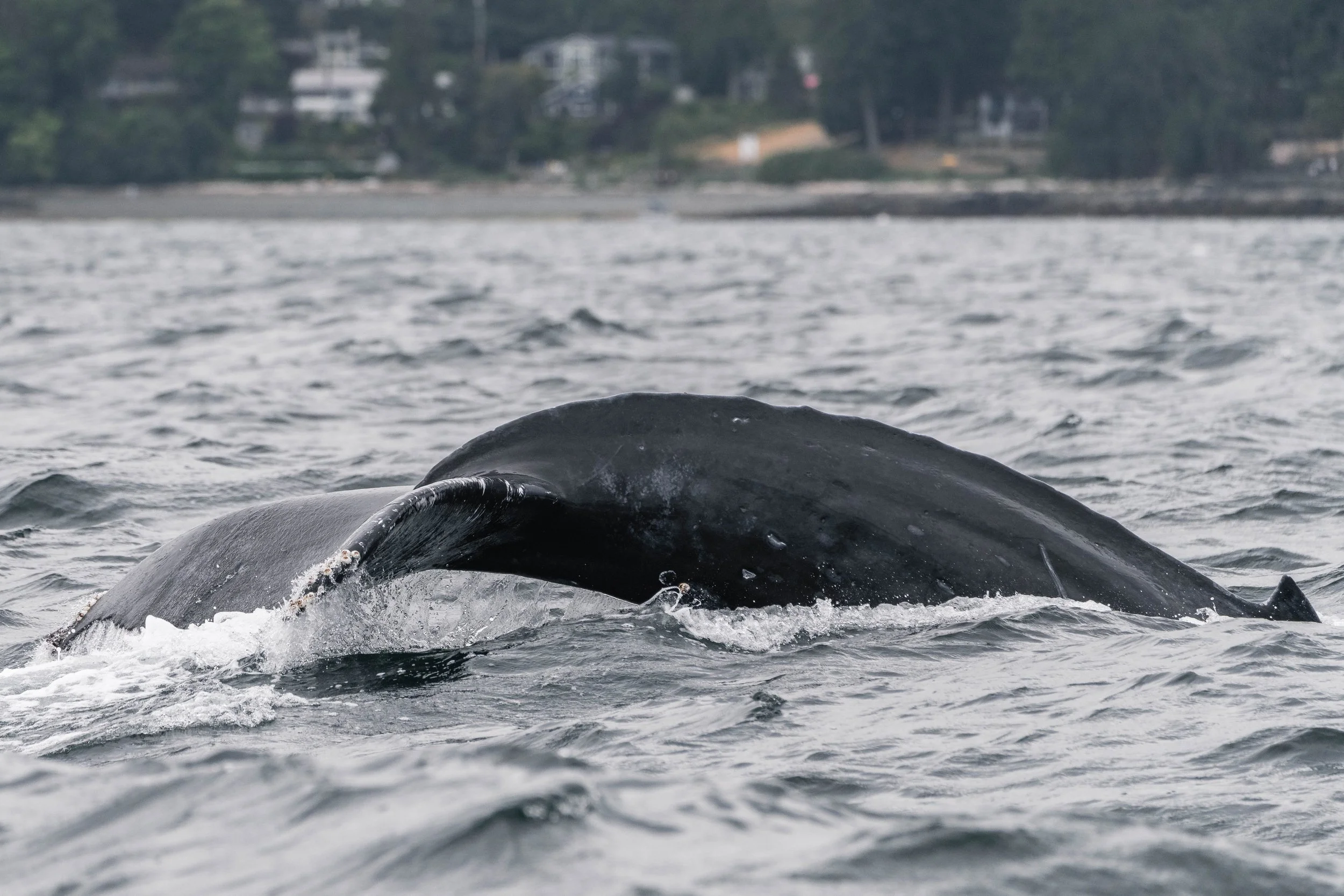 We pushed off the dock on our open boat, Cascadia, with a light breeze to keep us cool, and set off into the Strait to begin our search. Luck must have been on our side! Within just 20 minutes and right around the corner from home, we spotted something dark among the waves. It was a humpback! We quickly snapped some photos for identification, but the tail wasn’t familiar. We had to consult the catalogues to try and match the fluke and dorsal fin. Eventually, we got a match: HW-MN0401531, a brand-new whale for our company! Very little is known about this individual, with only a single recorded sighting in 2024 in Alaska.