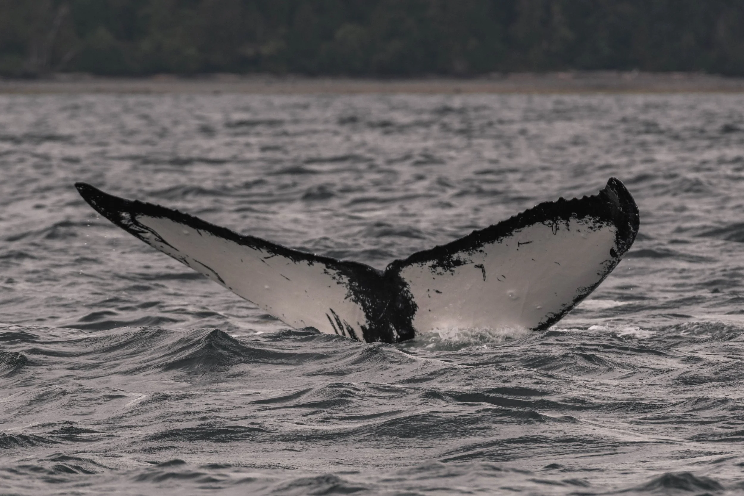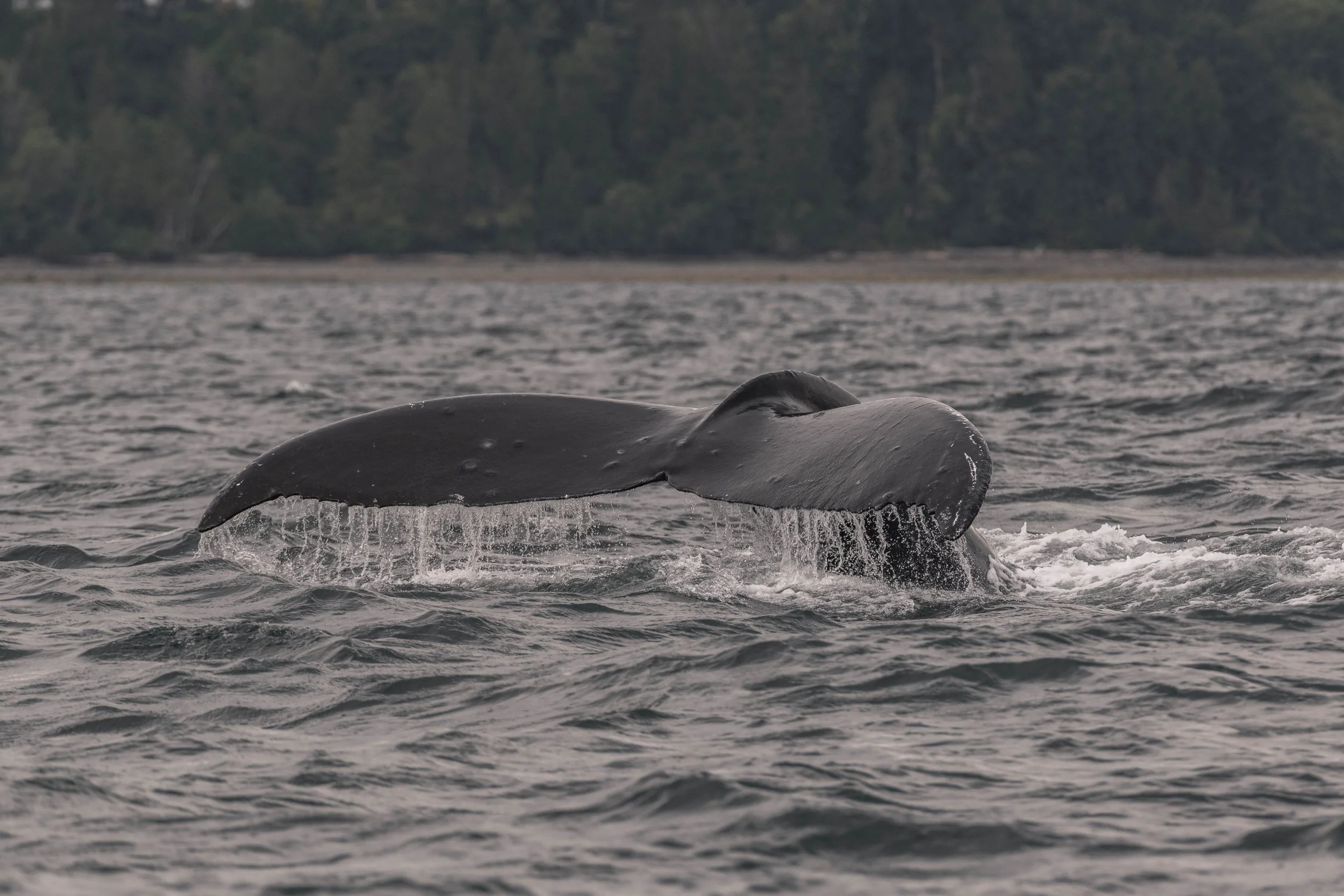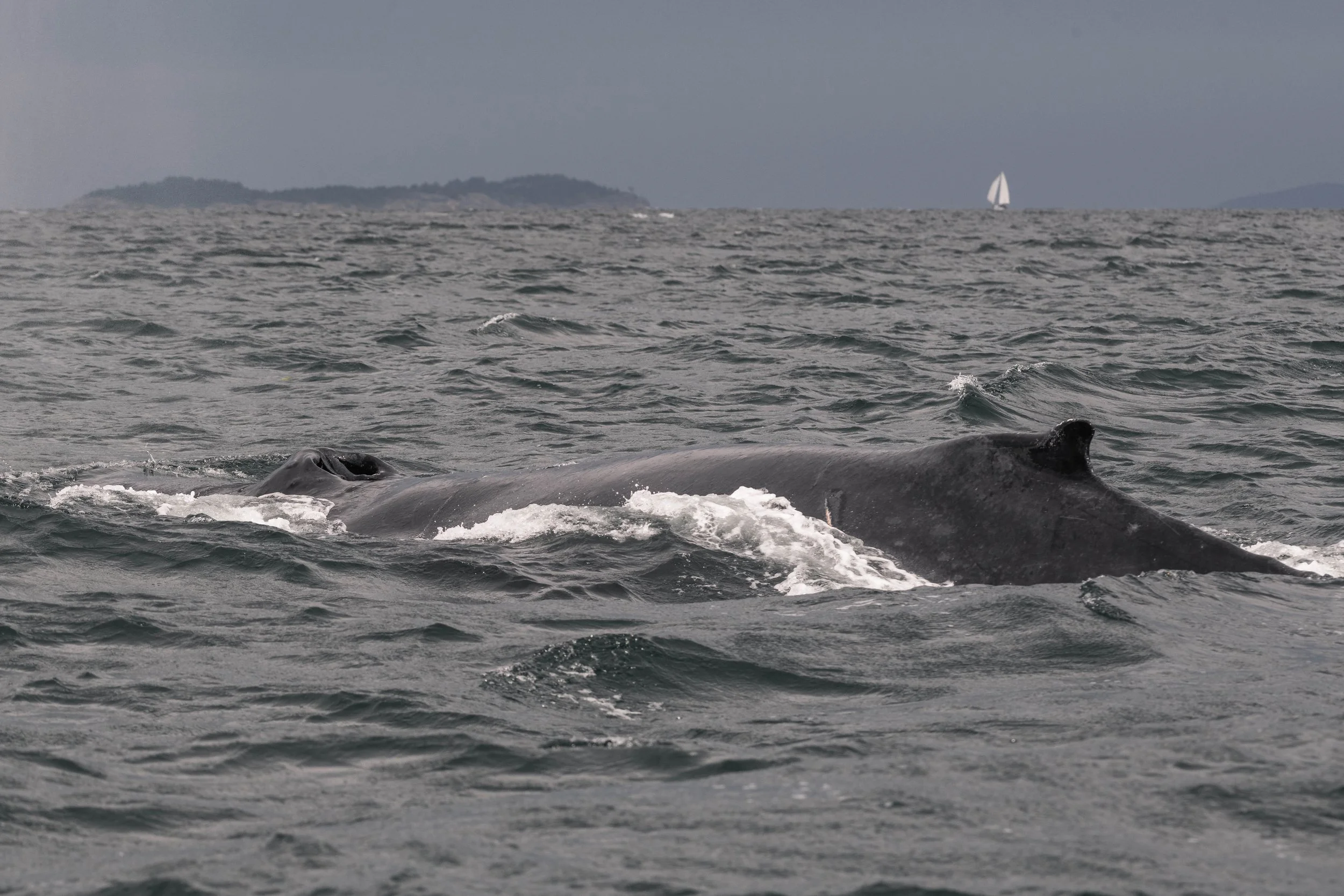 We had a classic moody West Coast day for our charters aboard Keta, our open boat, and Kula, our semi-covered vessel. We pushed off the dock and headed into the Strait of Georgia, where more often than not, we can spot a humpback or two feeding. We’ve developed a theory that our humpbacks tend to linger in the Strait, staying close to or directly within the busy shipping lanes. While shipping lanes are typically associated with commercial marine traffic, they can also act as unexpected hotspots of ocean productivity. As large vessels pass through, their massive propellers stir up sediments from the seafloor and mix deeper, cooler layers of water with the surface. This mechanical mixing increases oxygen levels and redistributes nutrients, especially in areas with shallow banks like Halibut Bank. The result is a localized upwelling that boosts plankton growth, fueling the very foundation of the marine food chain.