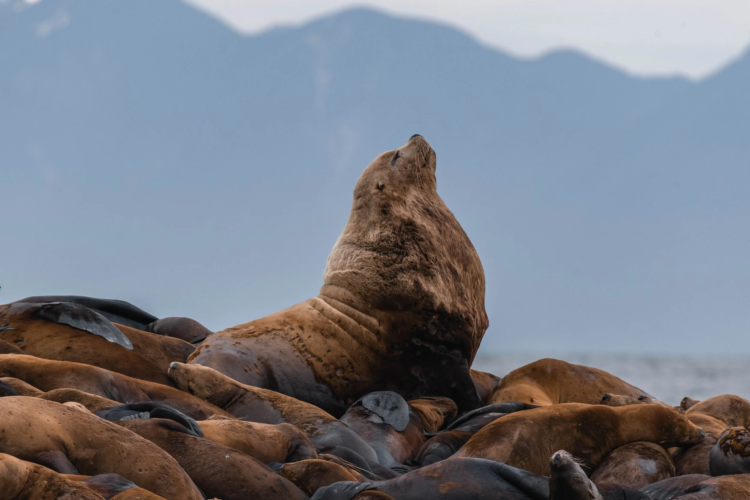 A cuddle puddle of Steller Sea Lions. Photo by Jordan Robinson AM.
