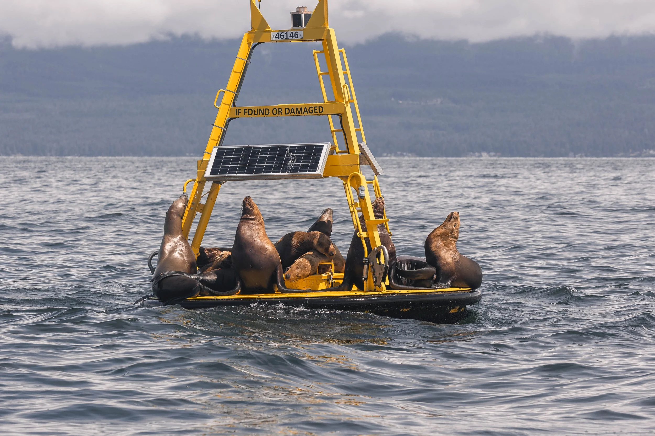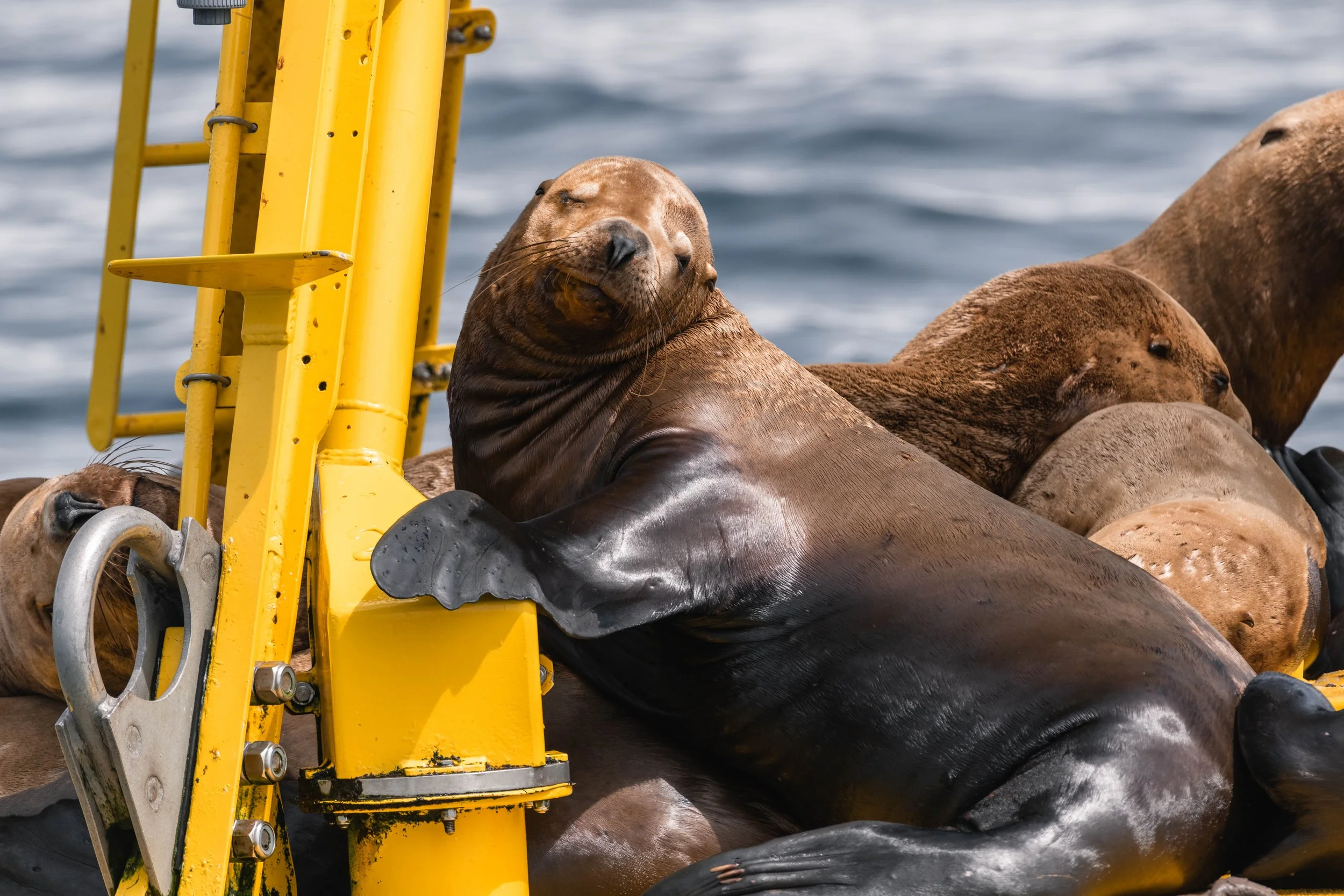 Following our encounter with Apollo, we made our way to the Halibut Bank ODAS buoy. Here, a group of young Steller Sea Lions could be seen hauled out, basking in the sun. Most mature sea lions migrate to breeding grounds during this time of year, but these younger animals typically remain behind. The buoy provides them a perfect haul-out site directly above a rich feeding area, just like the humpbacks; they are drawn here by the abundance of prey. While sea lions target fish like salmon, hake, and other small schooling species, their presence is a good indicator of overall ecosystem health. To regulate their body temperature, sea lions must spend up to half their day out of the water, and this buoy makes for a perfect resting spot between meals.