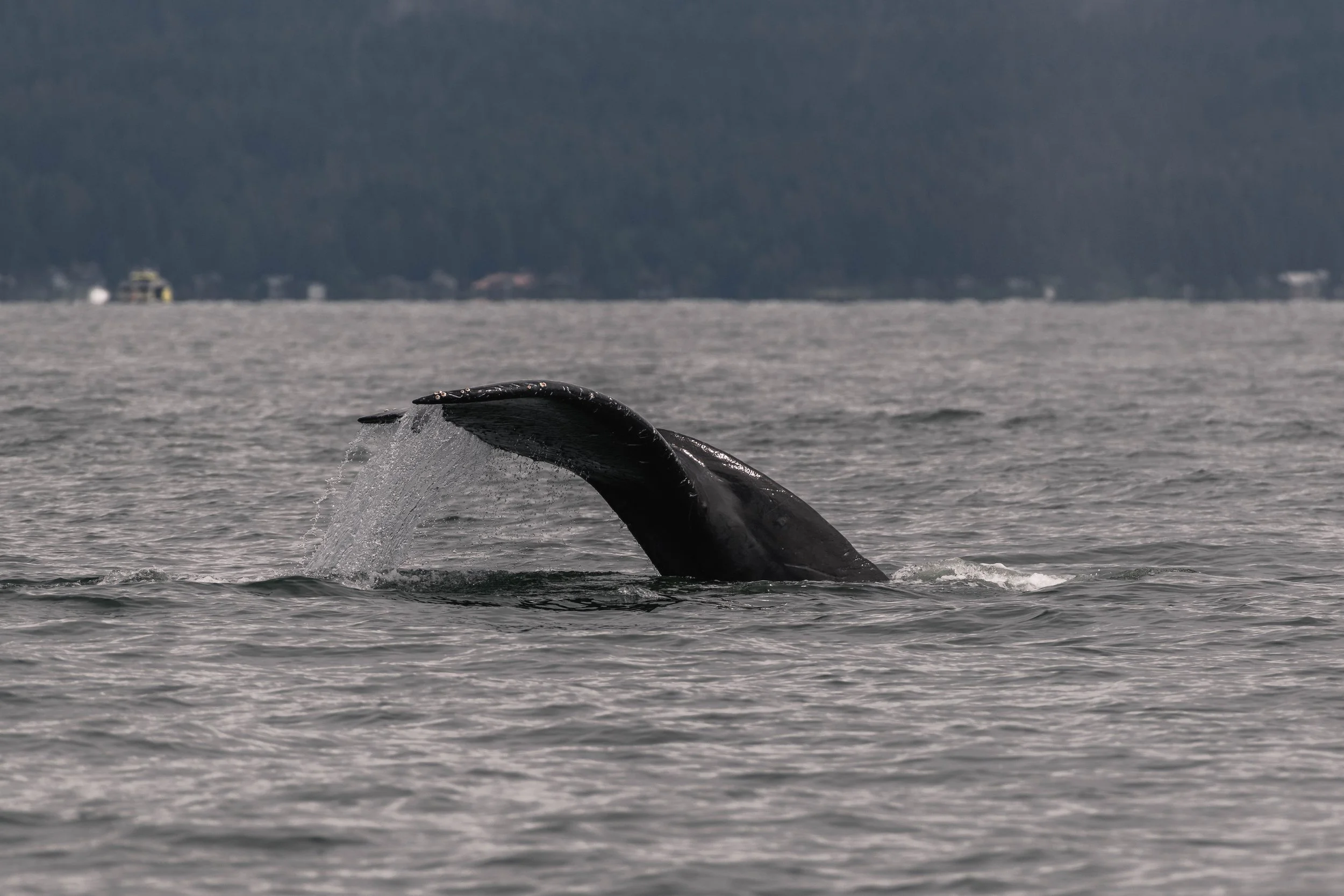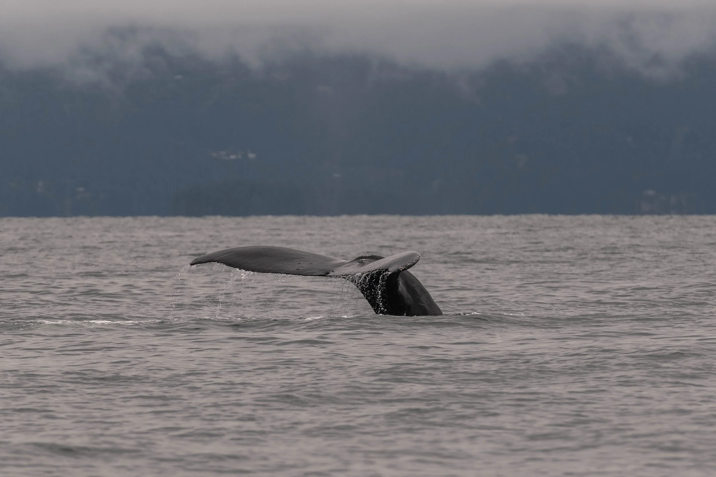 Sure enough, we soon spotted the distinctive, bushy blows of a humpback whale in the distance. Our first encounter was with Graphite (BCX2077), who appeared to be feeding in the area, no surprise given the productivity here. Humpbacks migrate to the Salish Sea during summer months to feed, after spending winters in the warmer breeding grounds of Hawaii or Mexico. While Graphite hasn't yet been definitively linked to either location, that could change as more data is shared between researchers. Graphite was easy to identify today, lifting his flukes high and revealing familiar white patches and notches. While his tail isn't heavily marked, his subtle features have become familiar to us over the years.