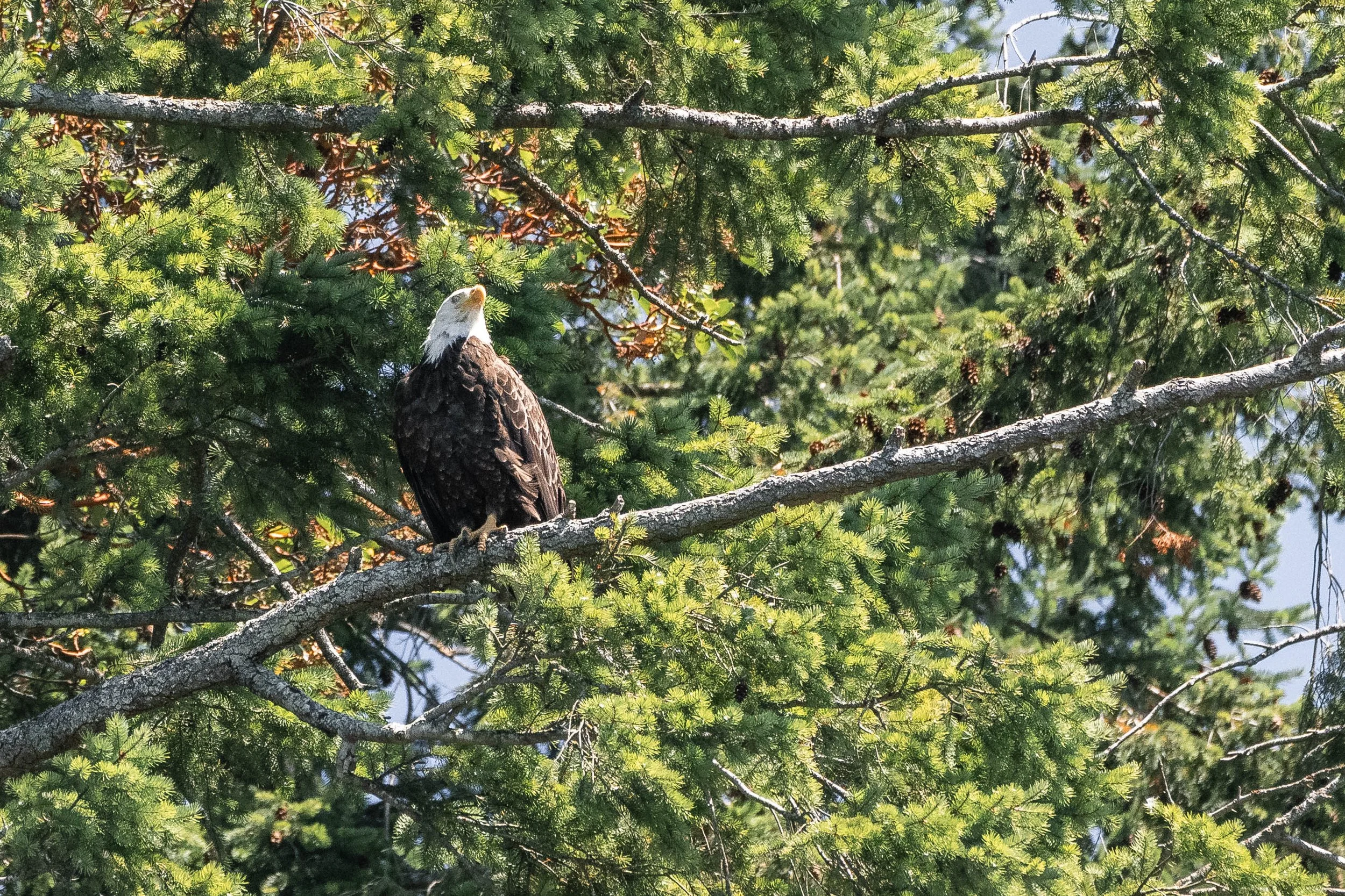 A mature Bald Eagle rests high in the trees. Photo by Val Watson, 10:30 AM.