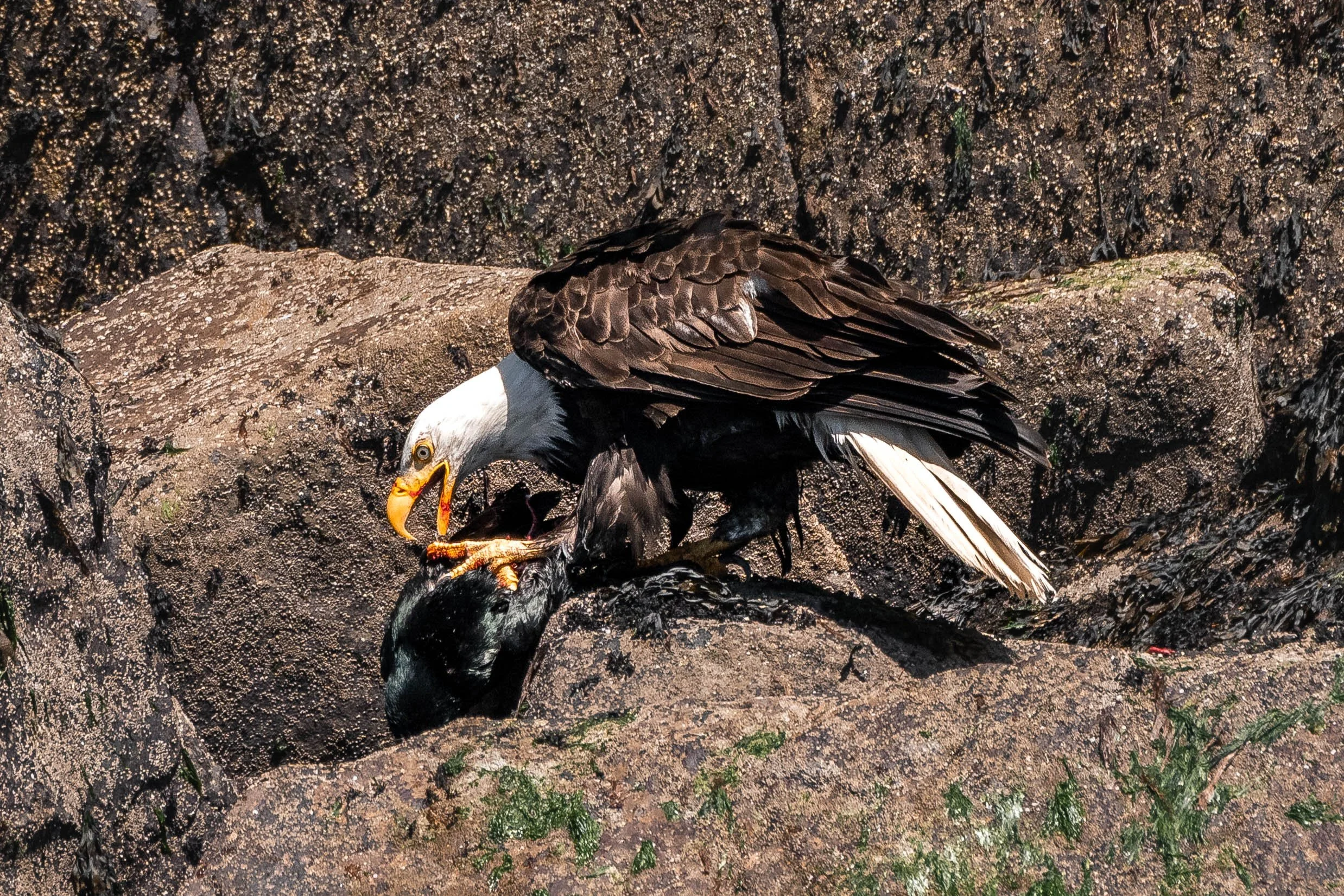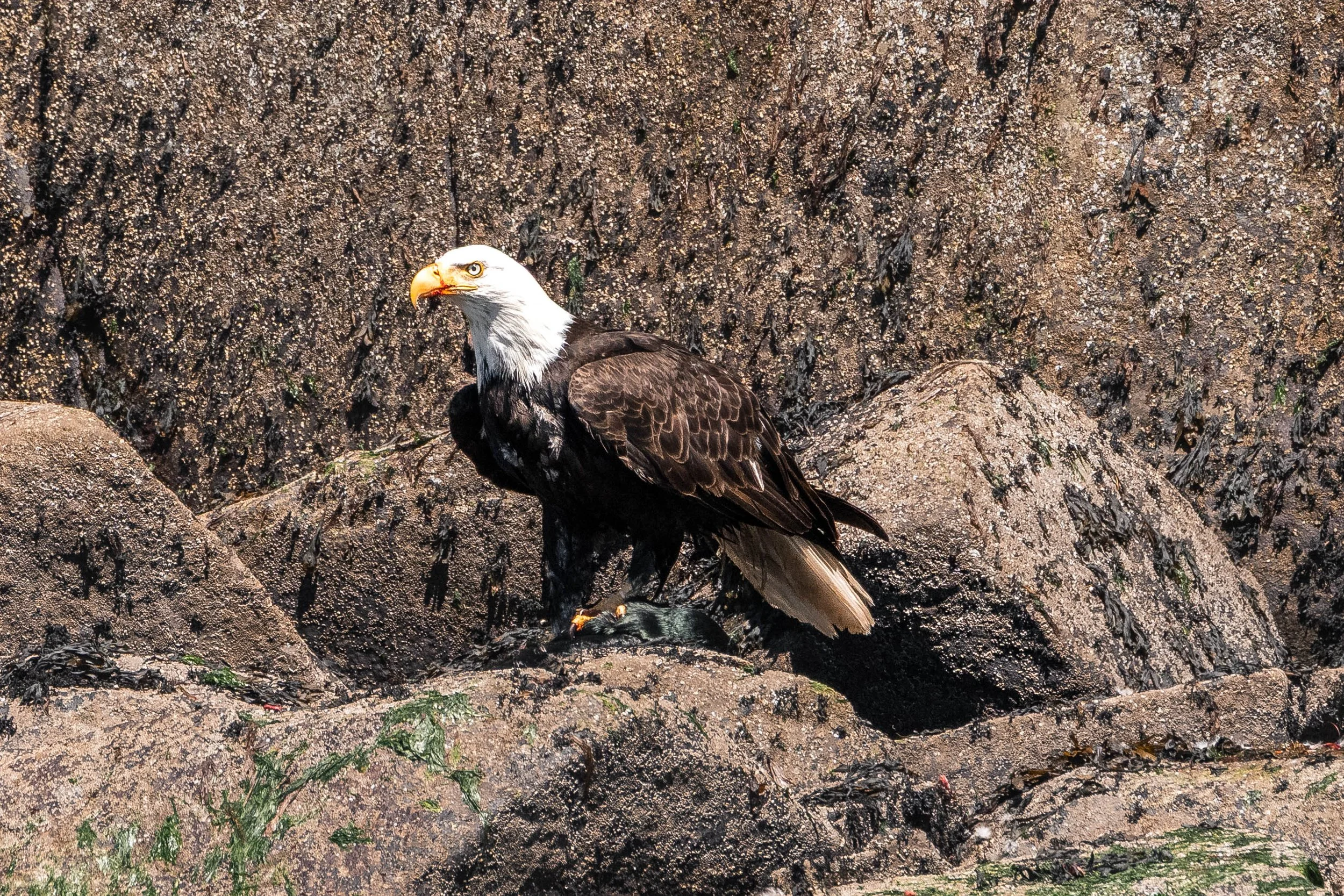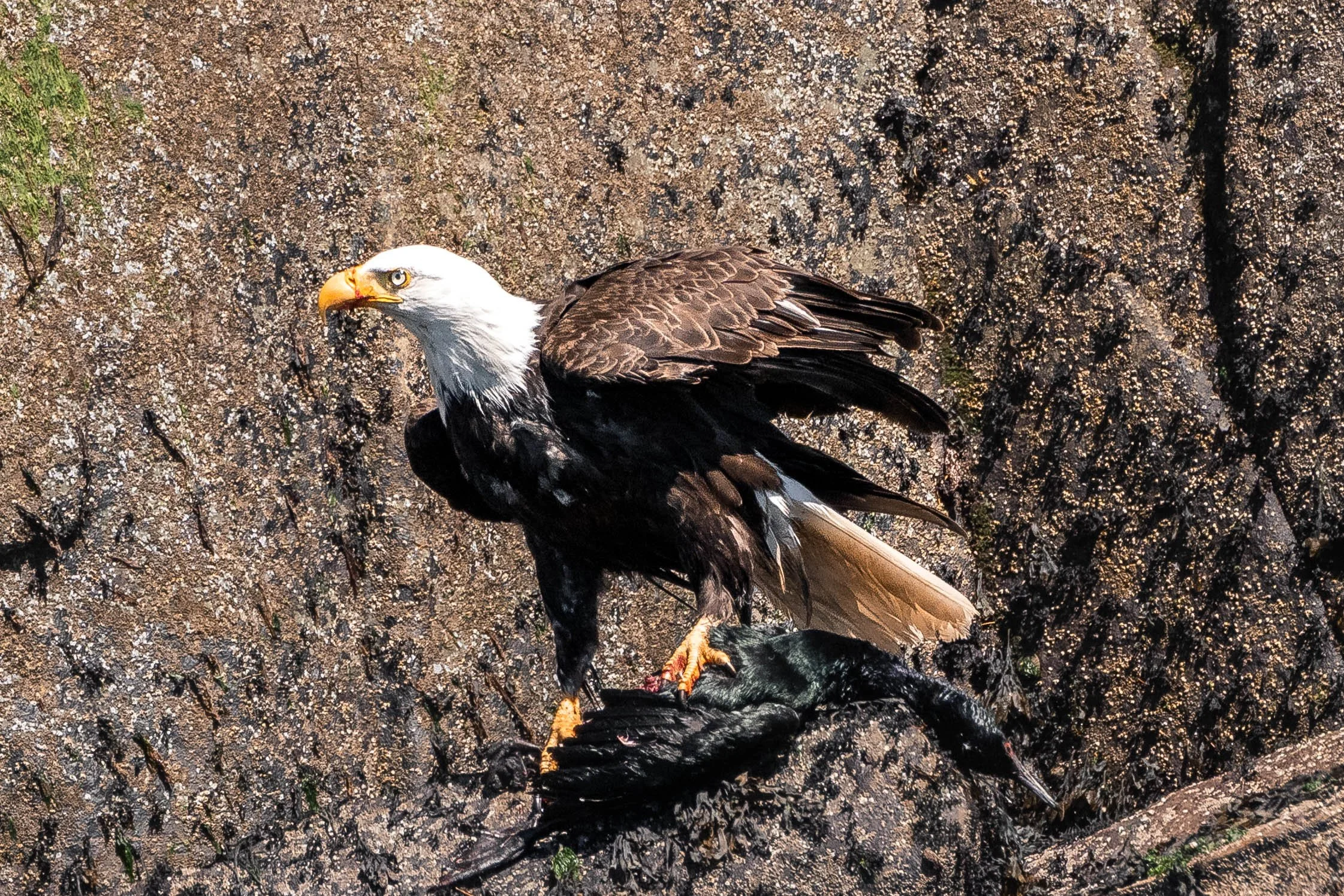 Once we departed Stinky Rocks, our vessels headed towards a Bald Eagle nest on the southwest side of Gabriola Island. After 5 years, bald eagles transition from their juvenile brown head towards their iconic white head. Additionally, juveniles will lose their white splotches on their body and tail, developing dark-brown bodies and white tail feathers. As bald eagles age, their feathers are not the only thing changing colour! The eyes of immature bald eagles will initially appear brown or grey and change to a stunning yellow as they age. The diet of bald eagles can vary, but consists of fish, small mammals and other birds (as seen below…Gore Warning tag is listed below in case you do not want to see the Bald Eagle with its catch)!