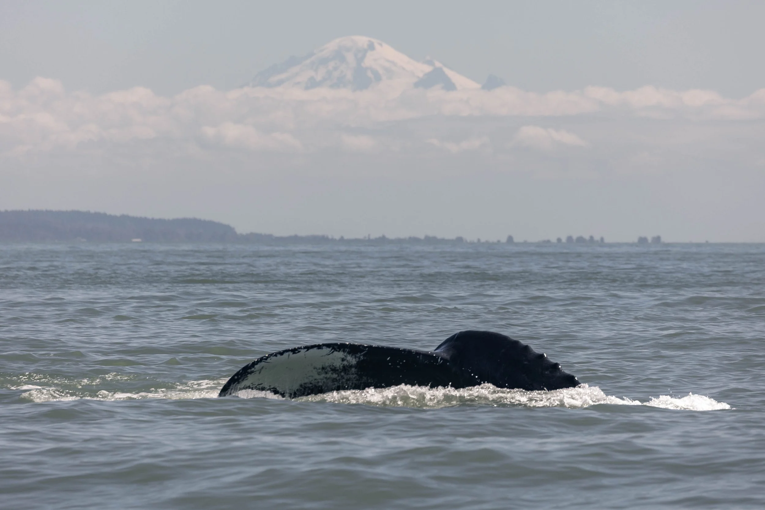 Hammer fluking, with Mt.Baker behind them. Photo by Jordan Robinson, 10:30 AM.