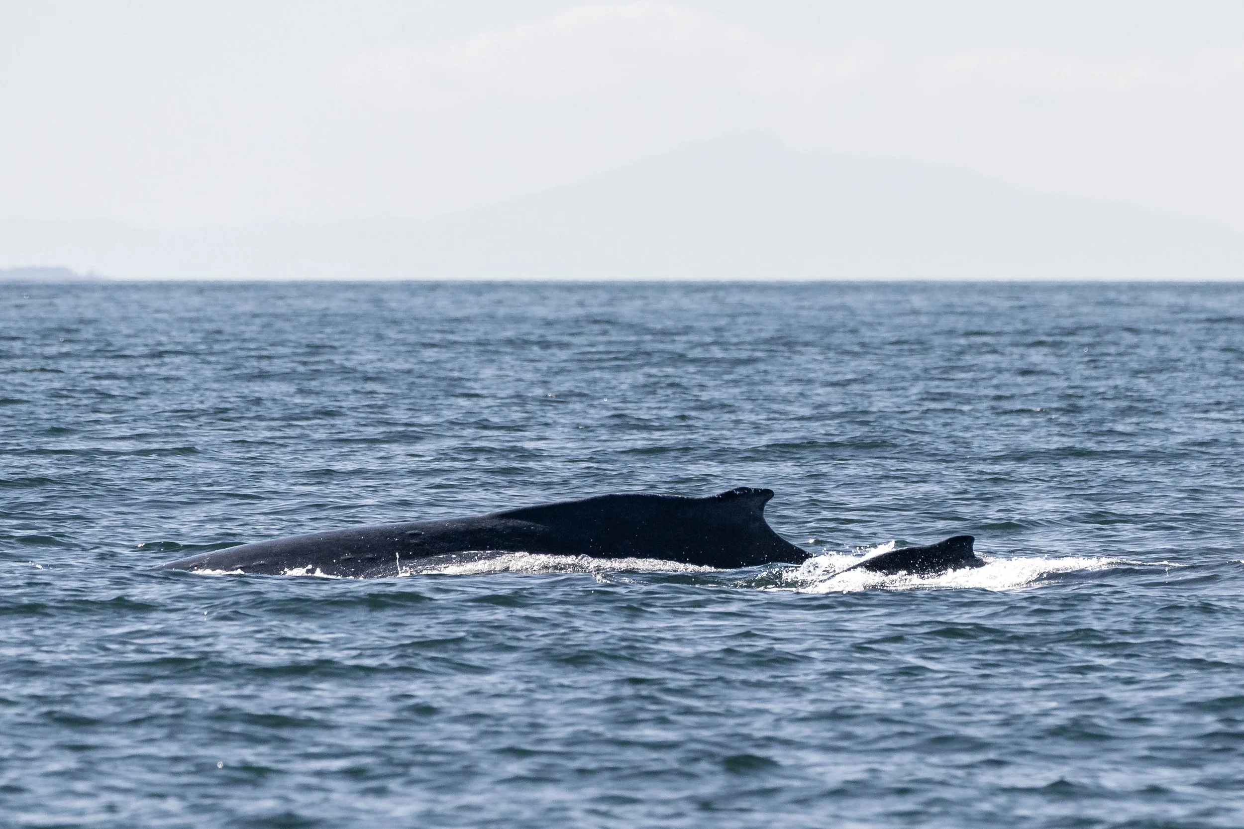 The evening tour was in for a real treat, as we rounded the north end of Gabriola, we also found some humpbacks! Two in particular were exciting because it was Graze (BCY0523) and her new calf (2025 Calf of BCY0523)! It’s always exciting getting to see a mother humpback with her calf! In addition to Graze and her baby, we were also joined by Slits (BCY0946)! Slits brought back her very first calf last season (Ulli, 2024 Calf of BCY0946), meaning we could confidently identify her as a female humpback whale.