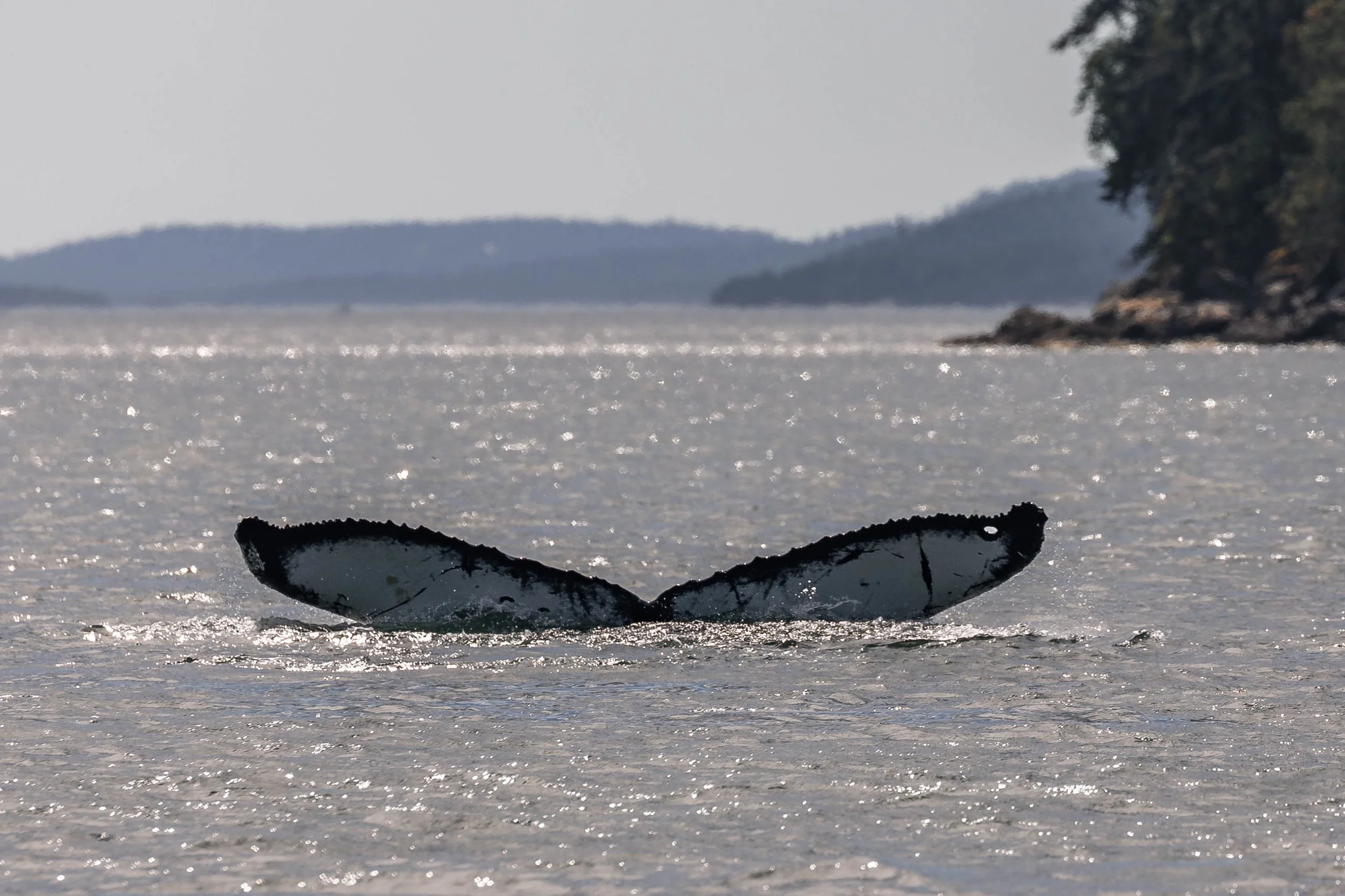 This little one was very quickly diving, inching very close to shore as we watched them. They have a very unique dorsal fin, and shortly after we began observing them, they dove, lifting their beautiful fluke high up into the air. This was the perfect chance for our Naturalists to snap a photo of this young humpback’s tail underside, which is the pattern we typically use to identify individuals. This pattern, with its dots, scratches, and white patches, is as unique to them as a fingerprint is to a human. Once we have a shot of their tail, we begin comparing it to our humpback catalogues, such as the Keta Coastal Conservation Catalogue (free download). After some comparing, the little humpback by Dodd Narrows was identified as Zephyr’s 2024 calf (BCZ0414 calf 2024).