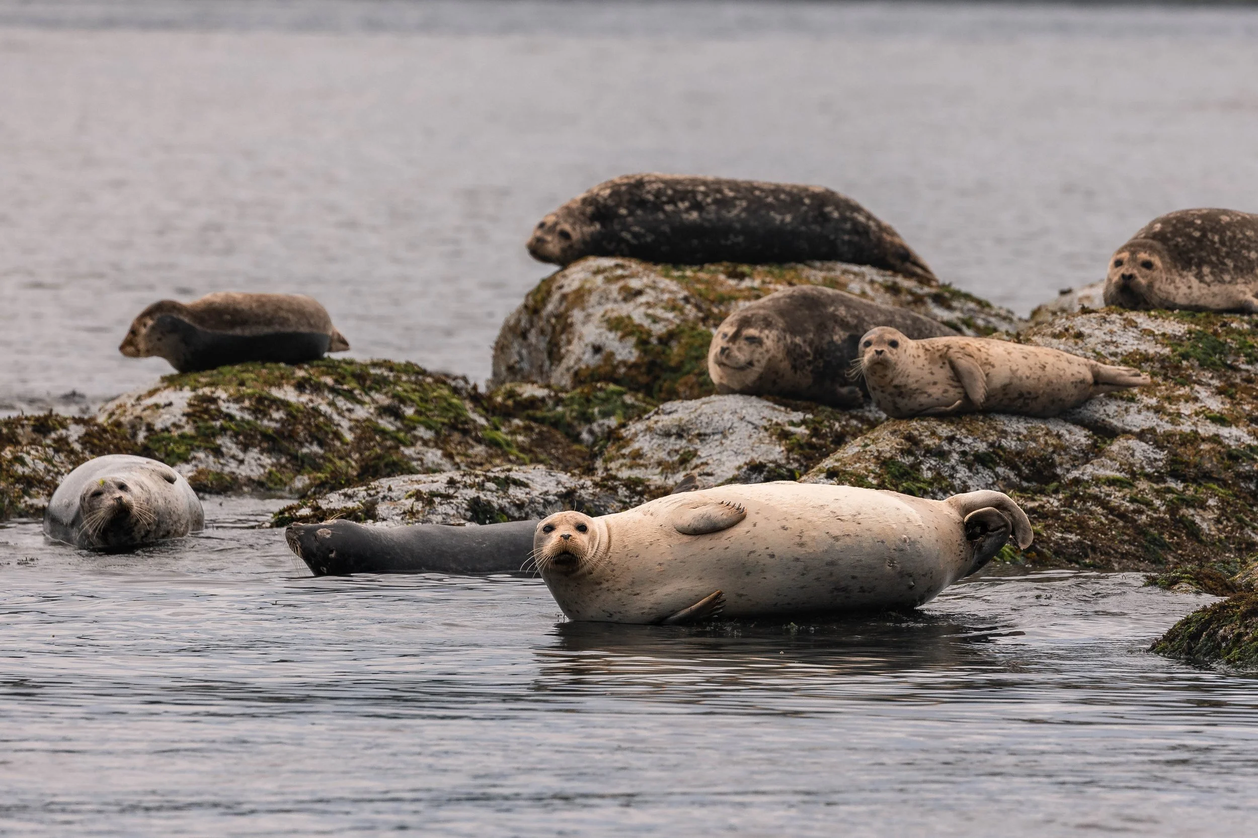 Once our time with the orca had concluded, we started heading back north. The trip wasn’t over, though - we were back into search mode, peeking around, looking for other wildlife to visit. Popping into some of the smaller waterways, we searched the coastlines for any pinnipeds that may be hauled out. We spotted a few Harbour Seals nestled up on the rocks, snoozing the day away. These little guys spend a huge portion of their days just resting, conserving their energy, and building their fat reserves. Up to 50% of a seal’s body mass is made of blubber, making these cute little pinnipeds very chunky!
