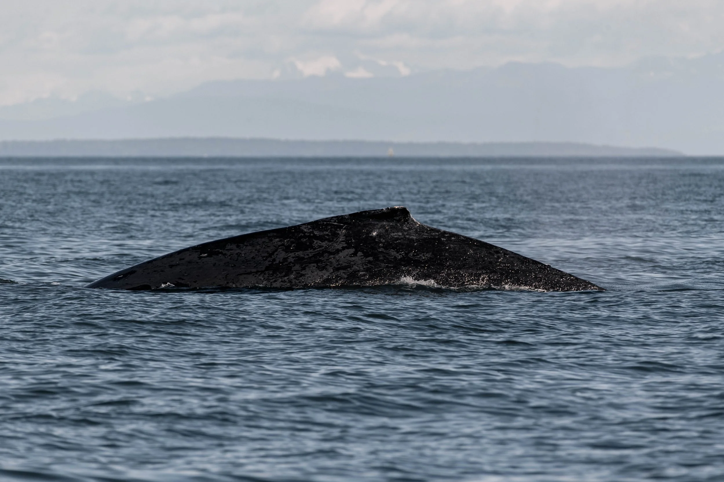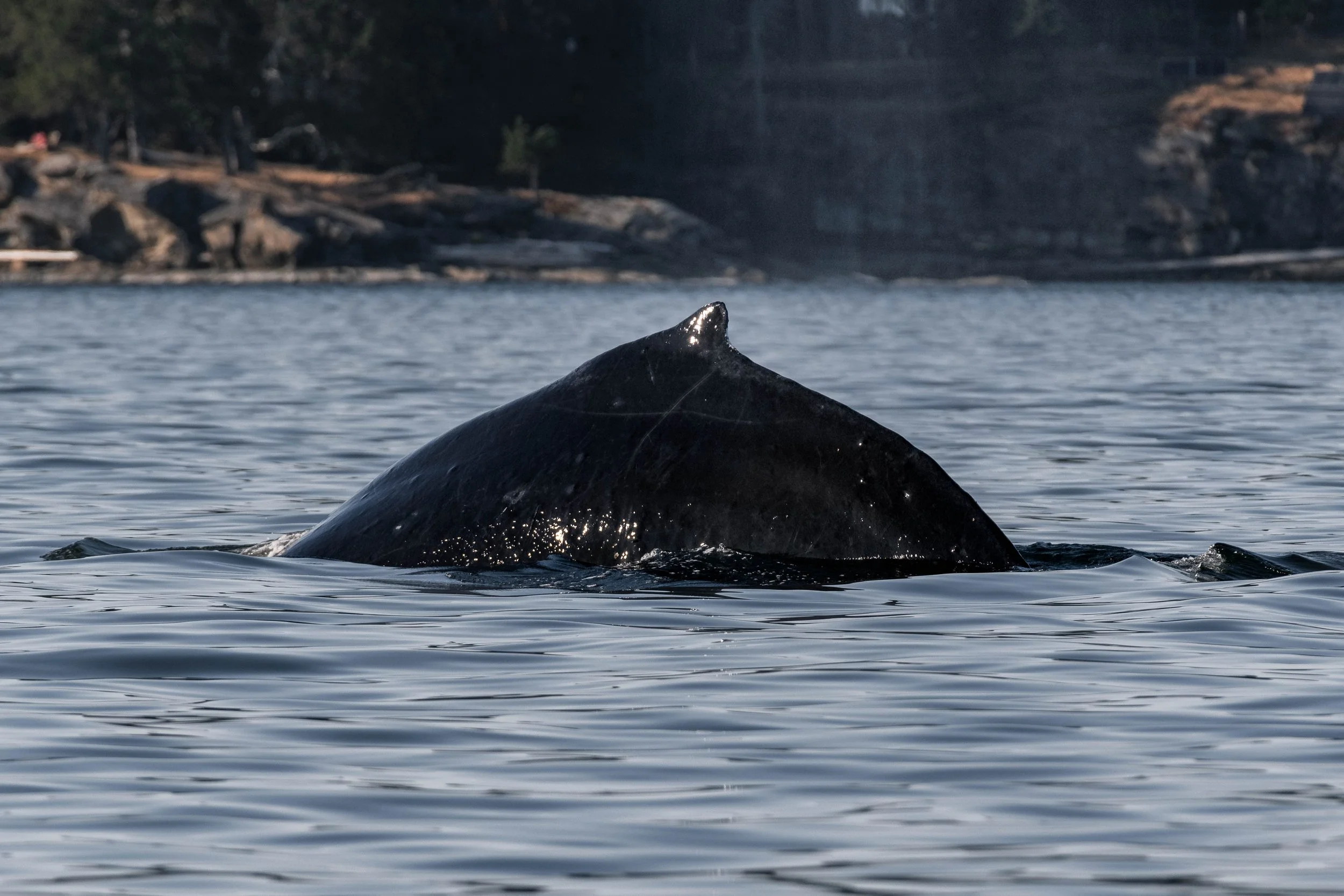 We enjoyed our time travelling with the T069s before we had to leave them behind, and we decided to head out into the Strait of Georgia in search of humpback whales. Once again, this proved to be the right choice as we spotted the big blows of a humpback whale soon after leaving Porlier Pass. Wait, was that two blows? This whale turned out to be Zig Zag (BCX1193), travelling with her 2025 calf, explaining the smaller blow next to the more obvious one from the full-grown mom. Although these two weren’t up to much, just resting at the surface without doing much in the way of dives. While this meant we got to spend lots of time at the surface with them, it also meant that we didn’t get any photos of their tails, the main way that humpback whales are identified. Not a worry, though, as Zig Zag has a unique enough dorsal fin for us to confirm it was her from that! It seems the time for baby humpbacks is now for us here around Nanaimo, as this is the 5th humpback whale baby that we have spotted on our tours so far this year!