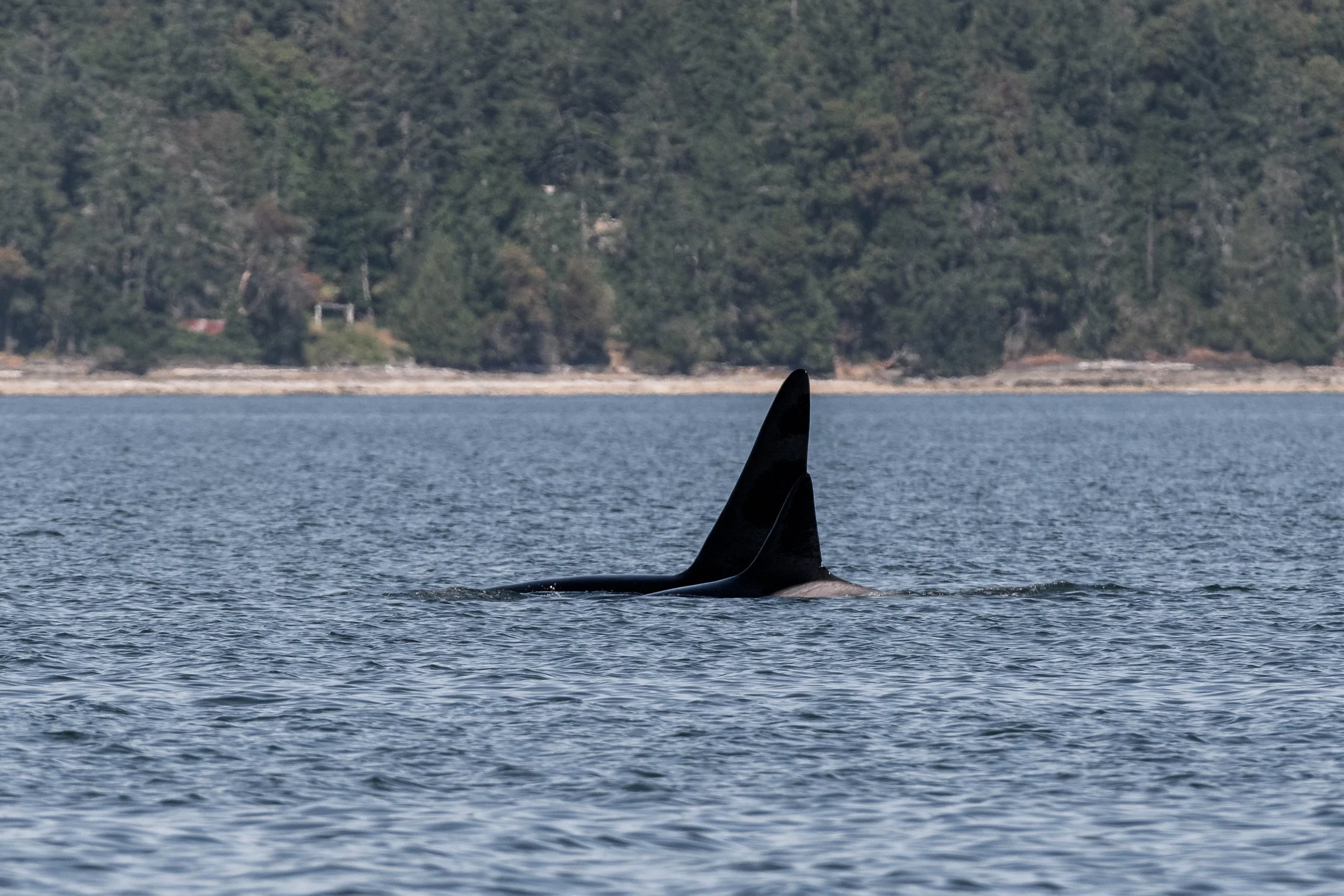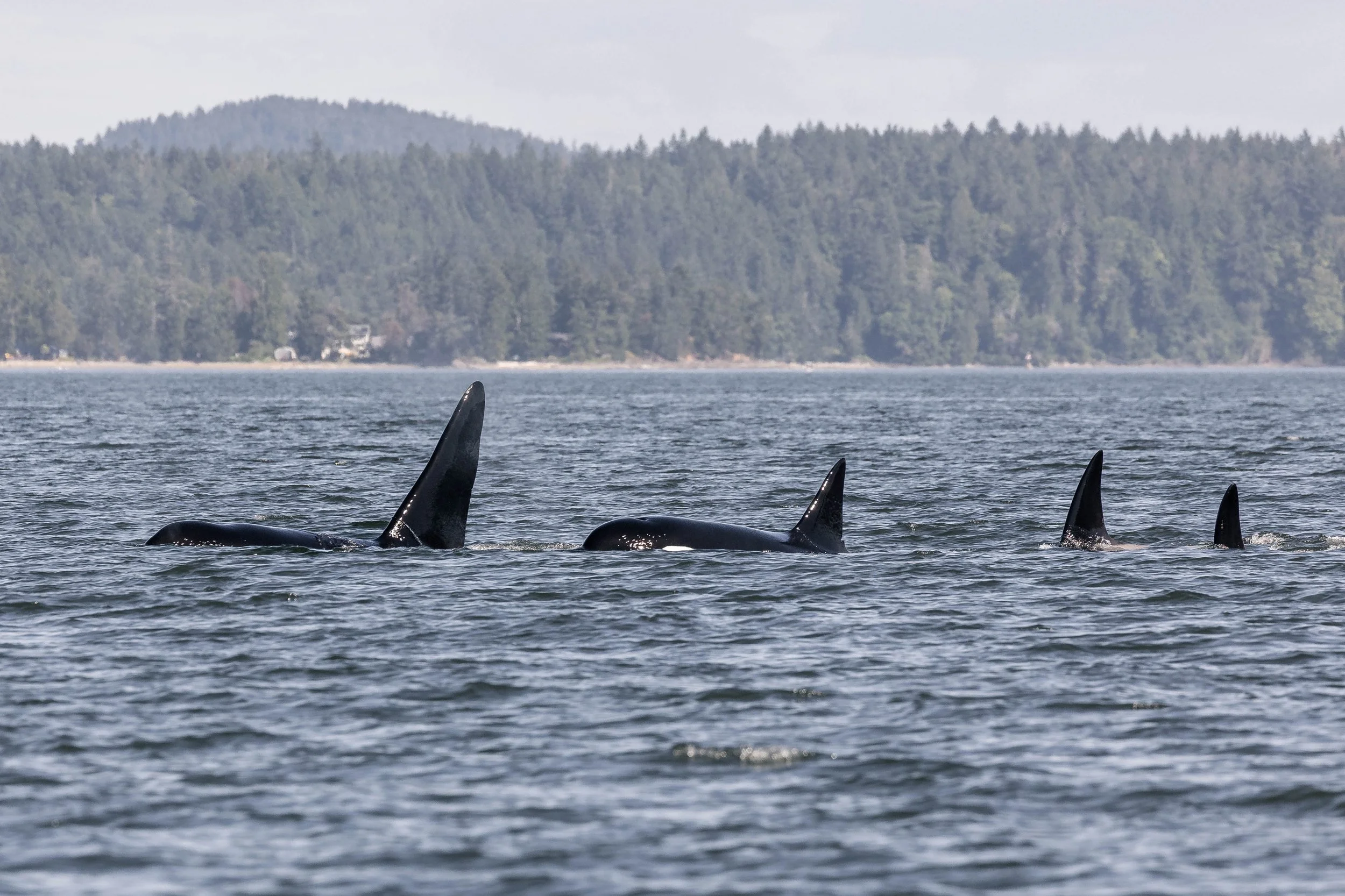 The T069s seemed content with travelling during our time with them, having the group surfacing very close together each time. If they were looking for food, they would likely spread out a lot more, so that they covered more ground, increasing their chances of finding something. Transient Orca are mammal eaters, focusing mainly on pinnipeds like the Harbour Seals and Sea Lions, but also going for more difficult prey like porpoise, dolphins, and sometimes even larger Baleen Whales. Each of these animals needs to consume an impressive amount of food each day, with adult males averaging close to 500 pounds of food, and females closer to 300. This difference in food requirements is due to their size difference, with males growing much larger than the females.
