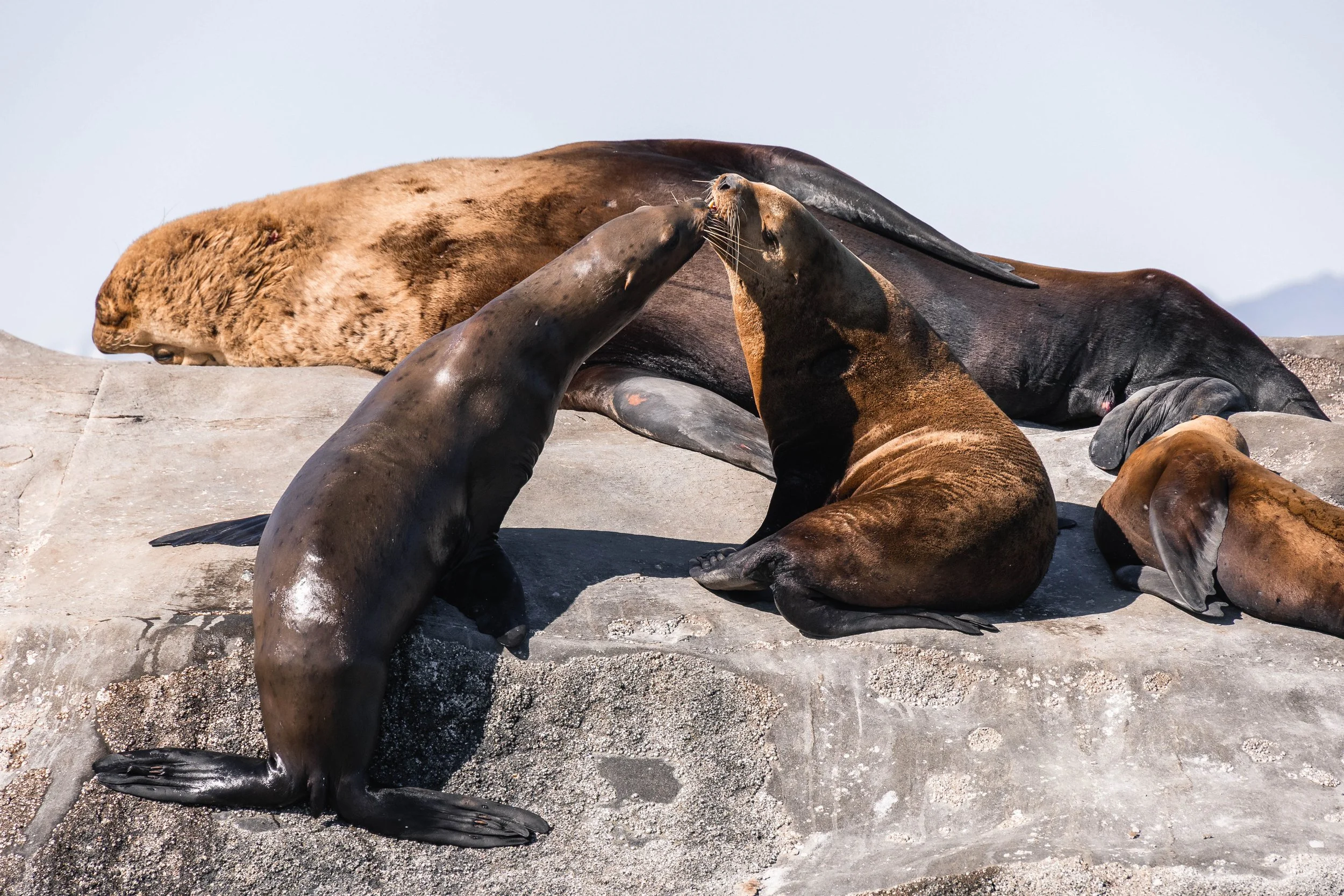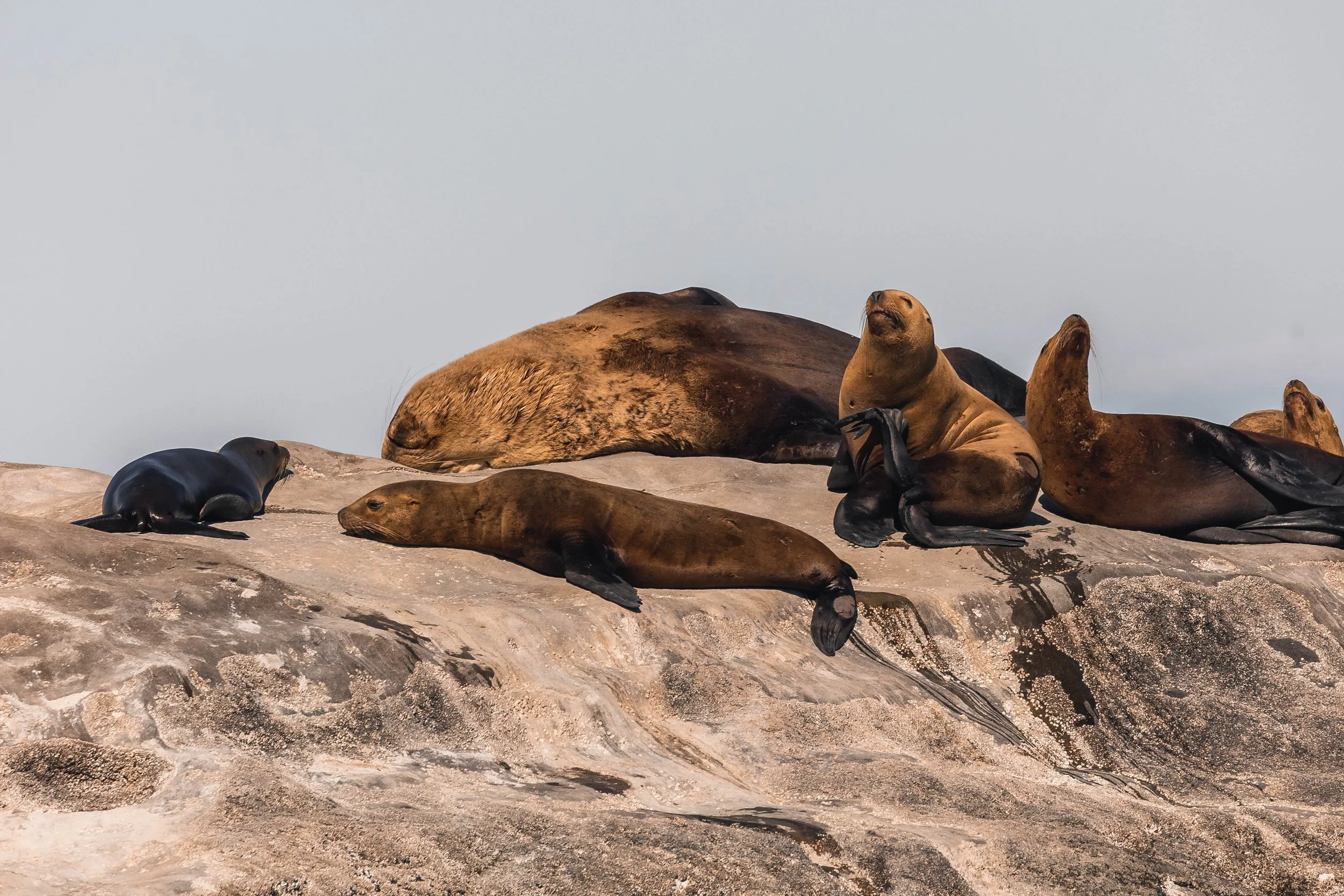 All different sizes of Steller Sea Lions sleeping in the sunshine. Photo by Desarae Poier.