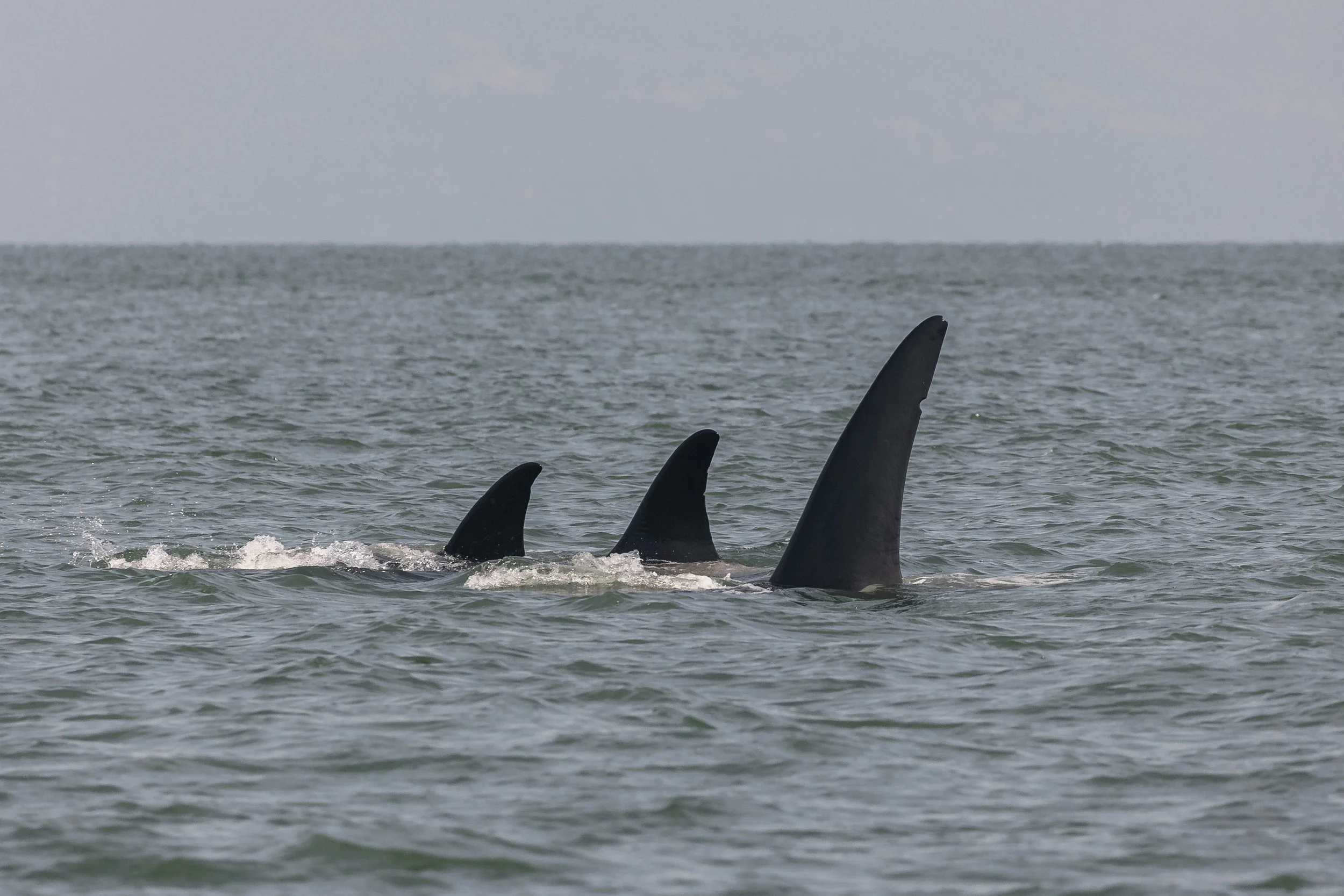 After soaking up quality time with the humpbacks, we returned to search mode. Before long, another spout broke the horizon, but this one looked different. Sleek dorsal fins cut the surface: orca! Today’s encounter was with the T065As, a well-known family of transient orca.