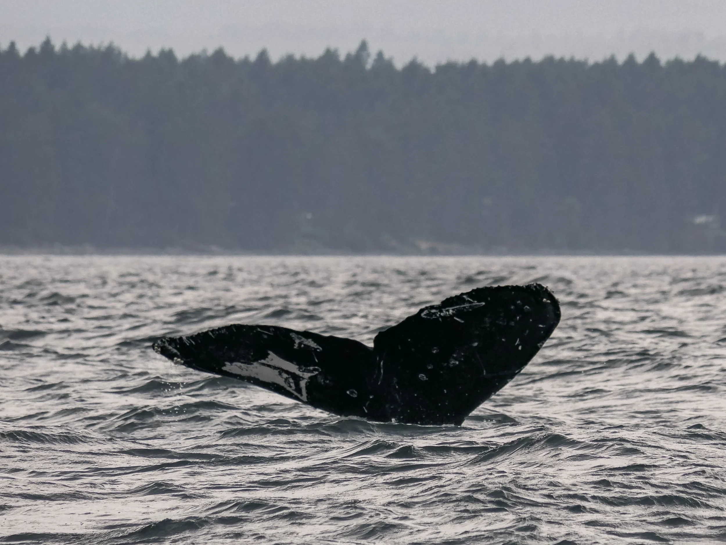 It was a lively morning on the water as the full fleet left the dock, eager to see what the Strait of Georgia had in store. The wind carried a bit of chop across the surface, but that didn’t stop us from scanning for blows on the horizon. Before long, Kula was the first to spot the familiar misty exhalation of a humpback whale. It was none other than Sage (BCX2073), a well-travelled visitor who made the remarkable journey between our coast and Hawaii. Not far from Sage, two more unidentified humpbacks surfaced, proof that the Strait is teeming with life this time of year.