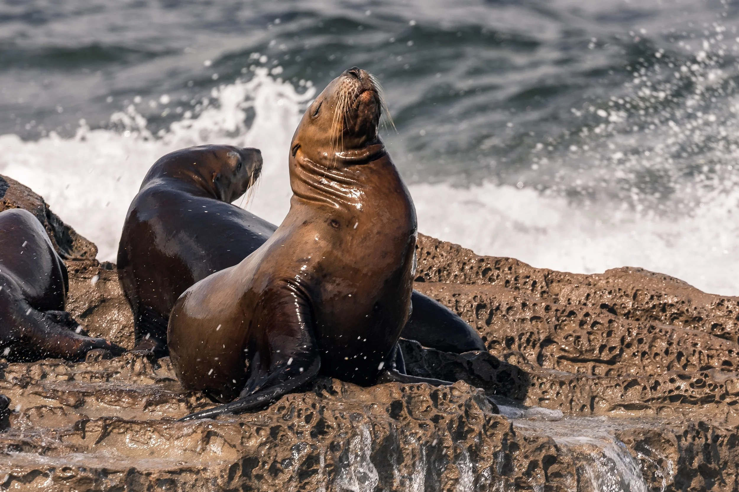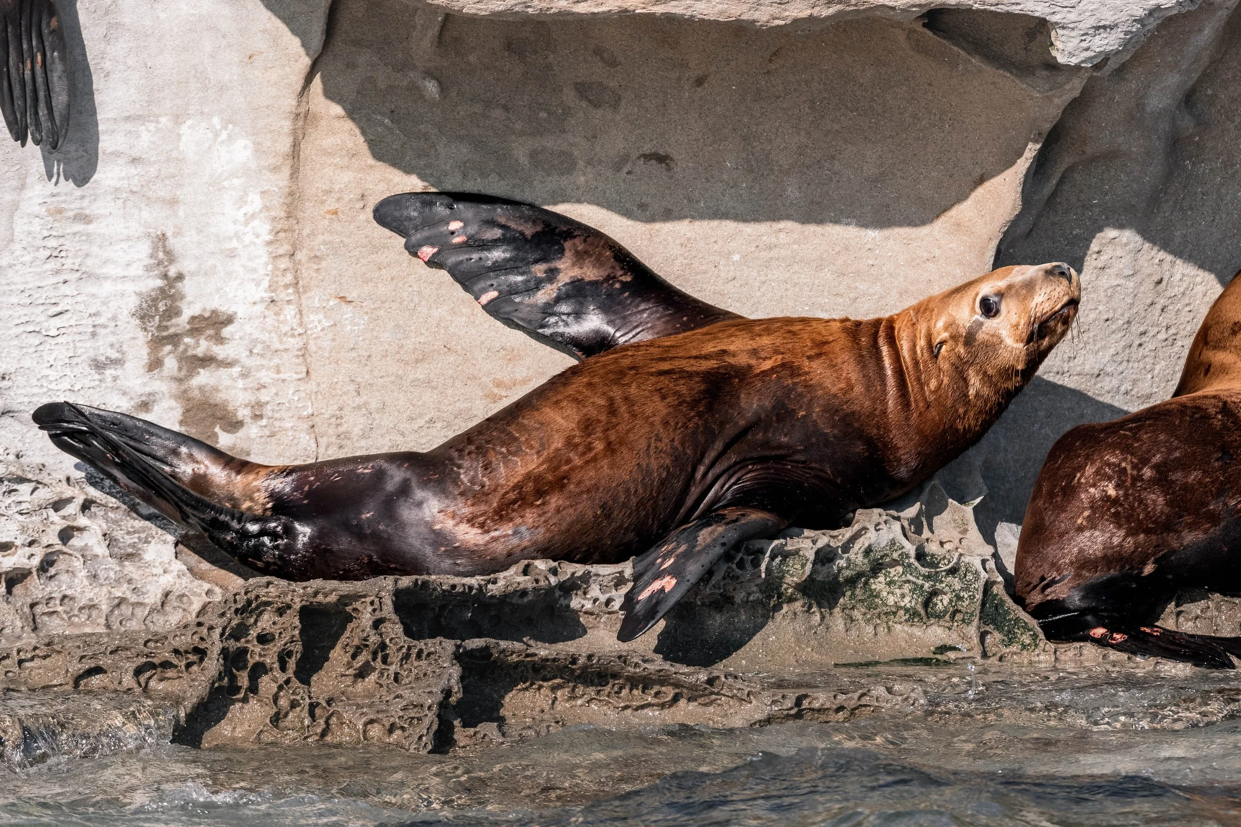 Our first stop was at a spot we affectionately call Stinky Rocks. The name speaks for itself, and the culprits behind the smell are none other than our local pinnipeds, Steller Sea Lions and Harbour Seals. Their strong scent comes from a mix of their fish-heavy diets and the fact that they often defecate and even regurgitate in the same places where they haul out. To top it off, they crawl over one another and through their mess, giving these rocky haulouts their unforgettable odour. Despite the smell, these charismatic pinnipeds are always a favourite with guests, thanks to their expressive faces and clumsy yet charming movements.