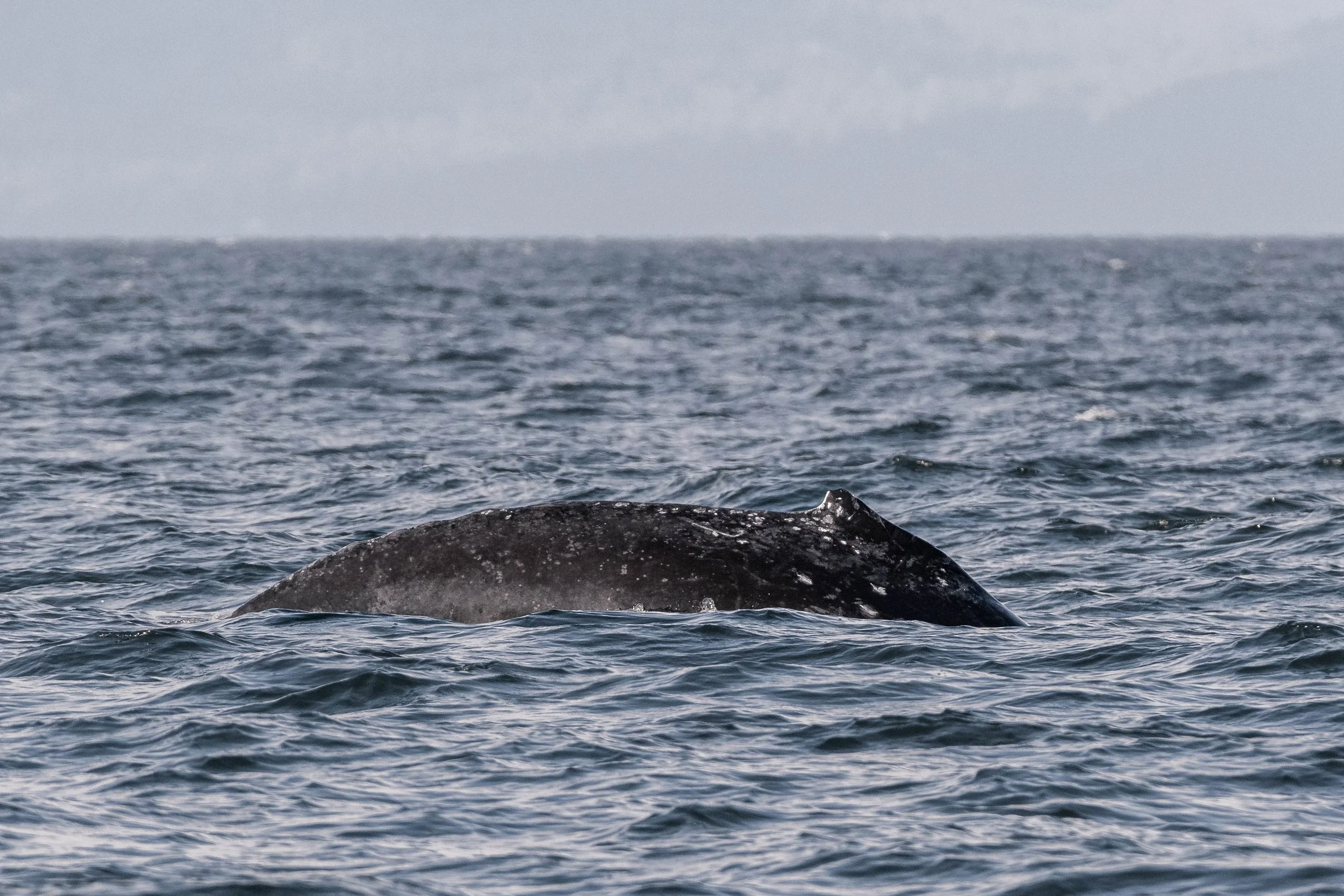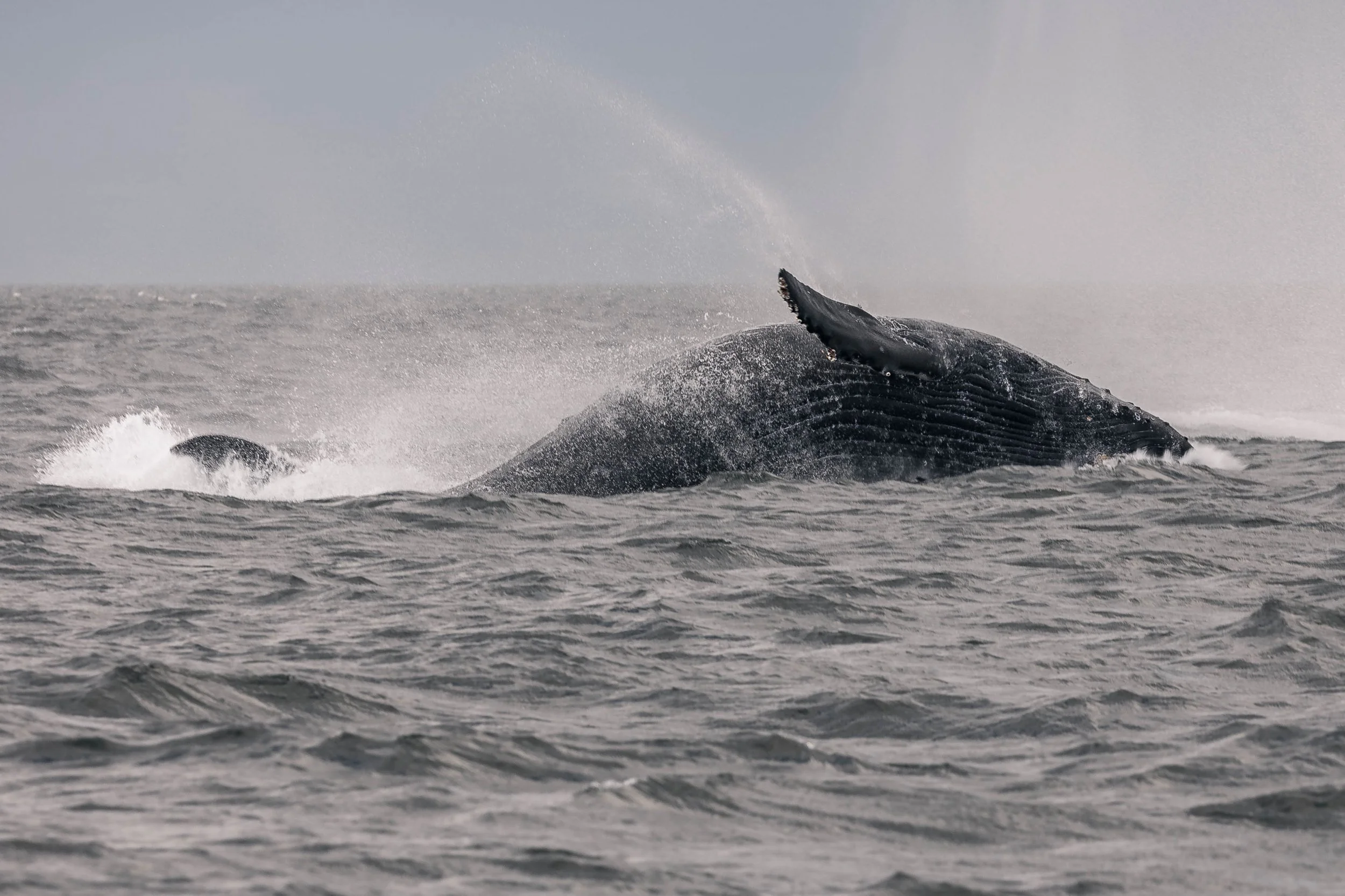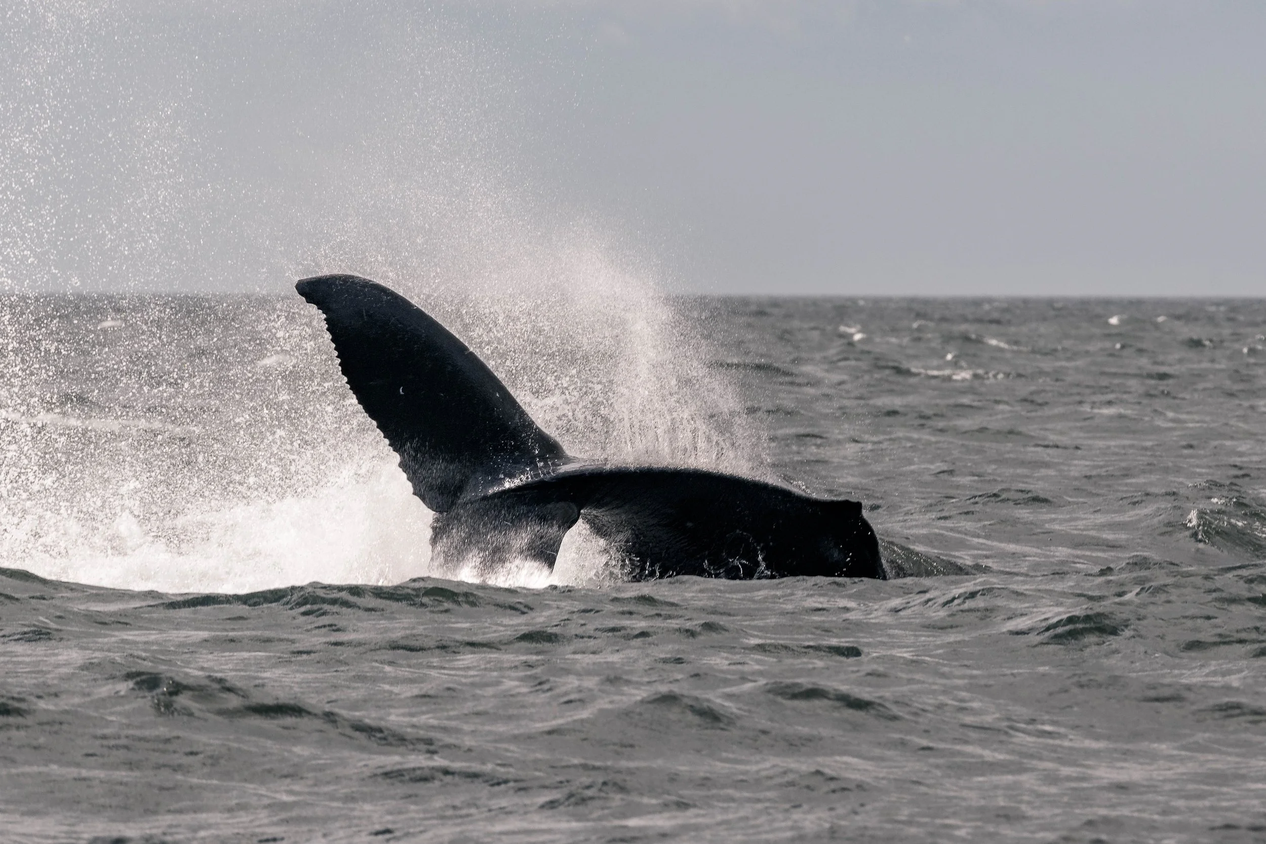 From there, we continued. Conditions were a little bumpy, and waves can make whale spotting tricky. When scanning the horizon, our eyes are trained to look for the signature signs of a whale: a tall blow, the curve of a dorsal fin, or the flash of a tail. With waves breaking, these clues can easily be hidden, so patience and persistence are key.