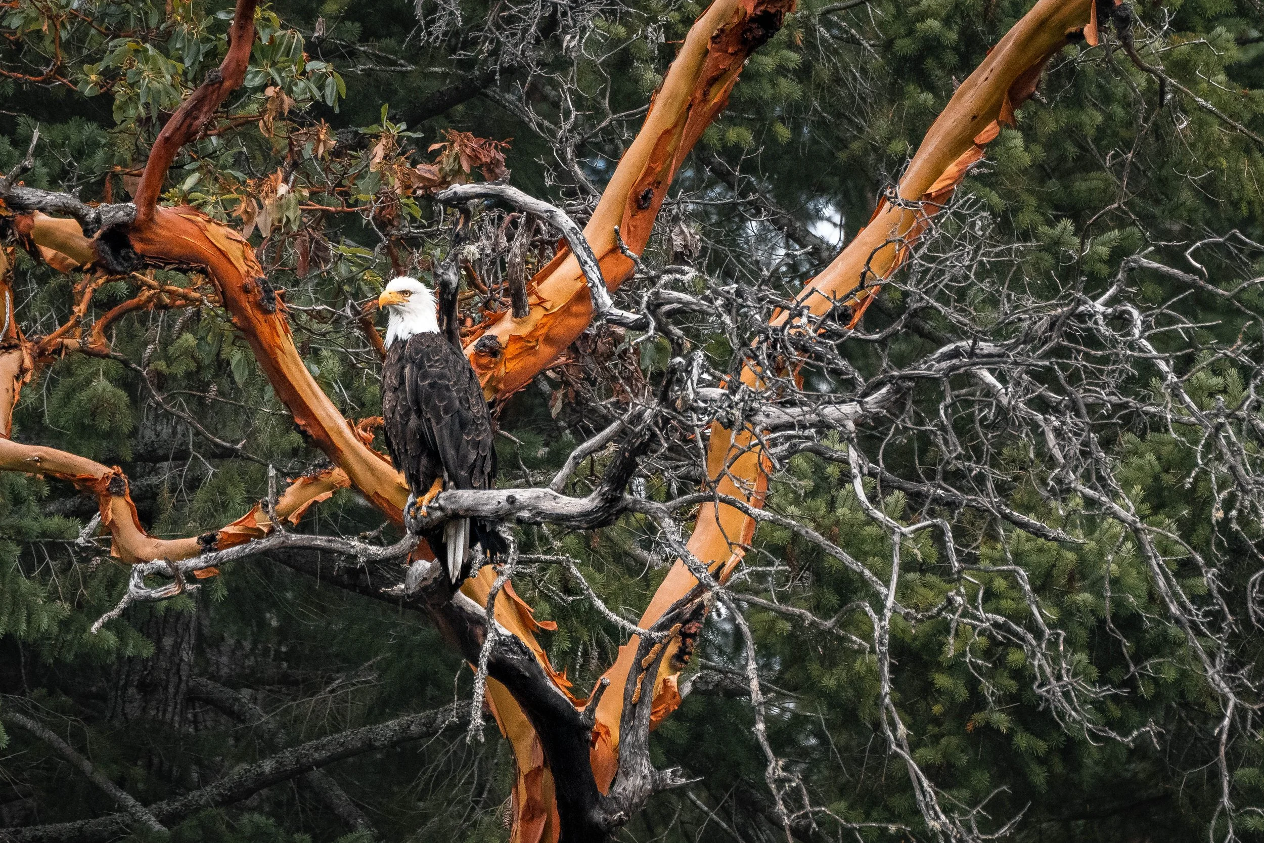 A Bald Eagle perched high up in the trees. Photo by Val Watson.