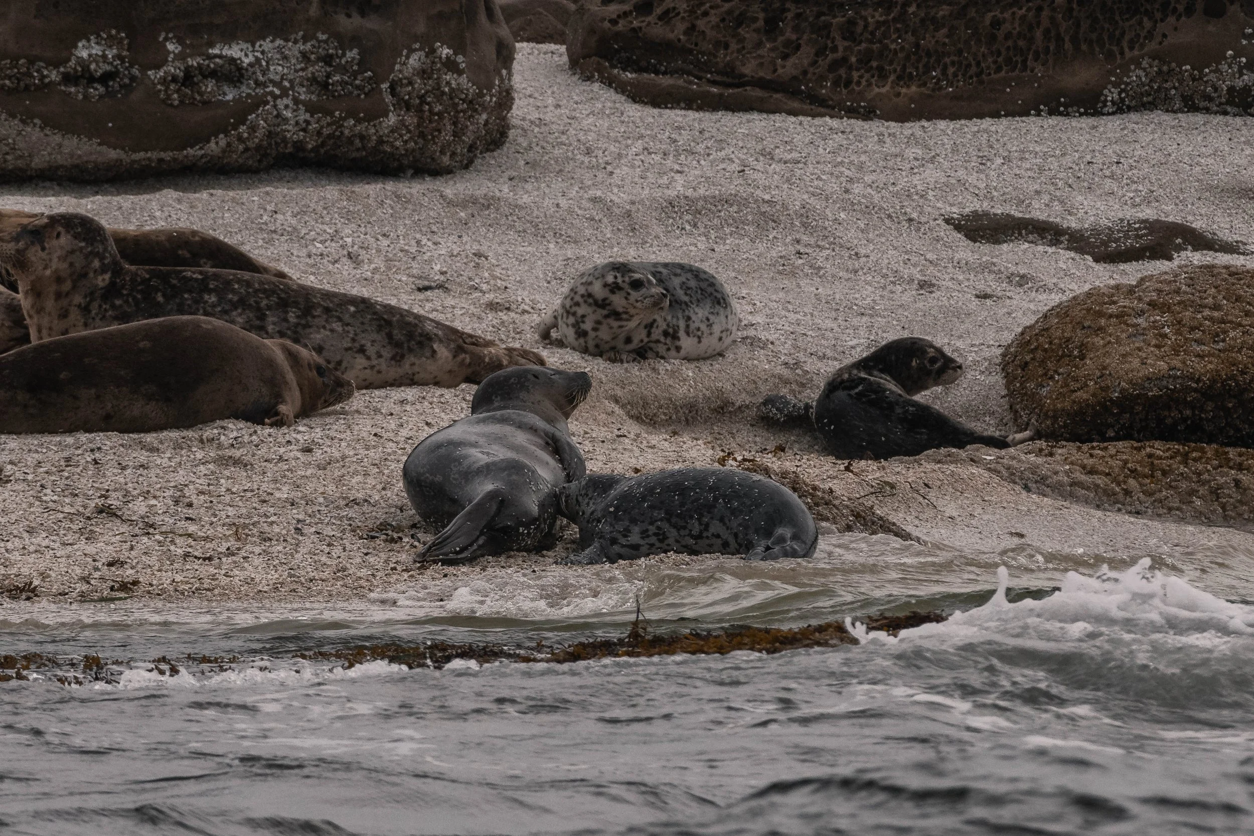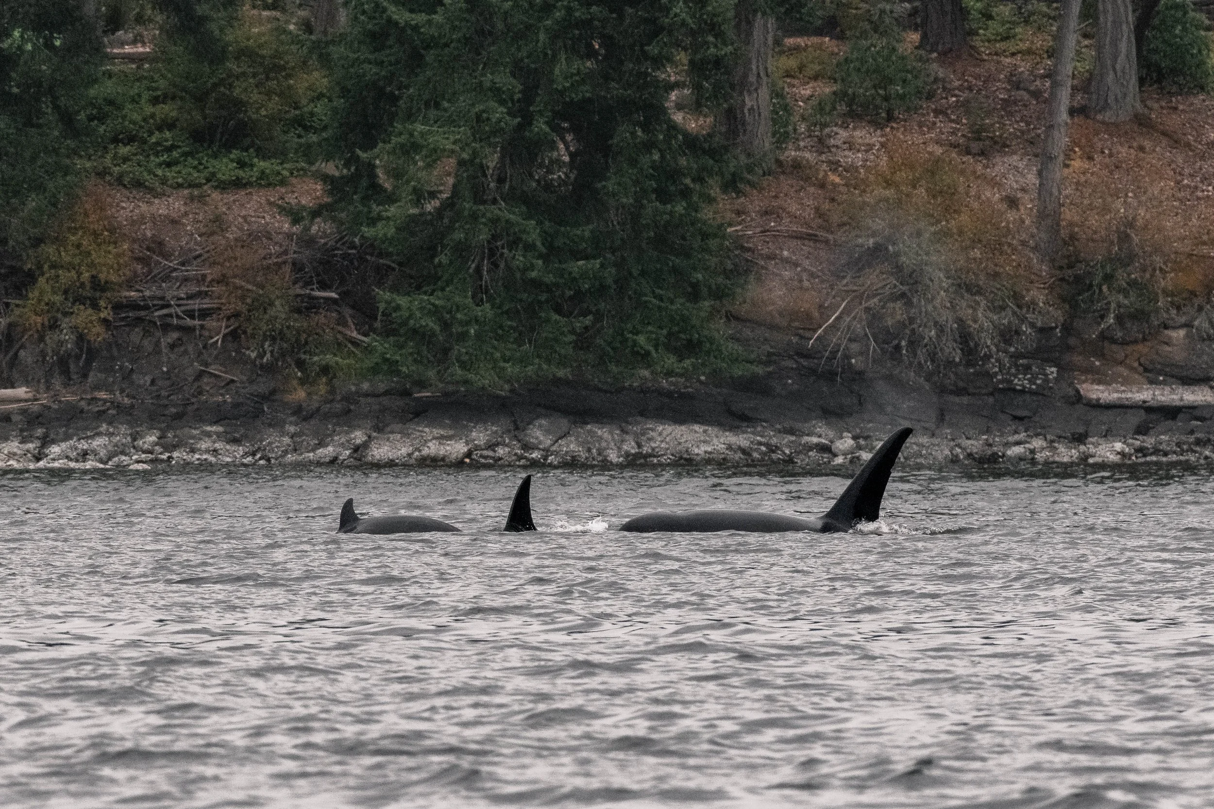 After spending our time with the T109As, it was time to depart. We turned back north and started our adventure. The rain began to fall, leading to a dark and beautiful atmosphere. The Island has been dealing with high temperatures lately, and with a couple of forest fires popping up, the rain was welcomed with open arms! We continued onwards through the wet weather until our next wildlife stop, a tiny island known as Miami Islet. Here, several Harbour Seals were hauled out up on the rocks, with many more of them popping their heads up from the waters. These rotund pinnipeds are year-round residents of our area, with many of them calling the smaller inner islands home. While once heavily culled, these small seals are now up to their historical numbers. This is great news, as they are also one of the main food sources for our Transient orca. While this can be sad to think about, it’s also important to remember that everything needs to eat! Because our Harbour Seals are doing so well, that has also helped the Transient orca population to increase, meaning this is a win-win for us!