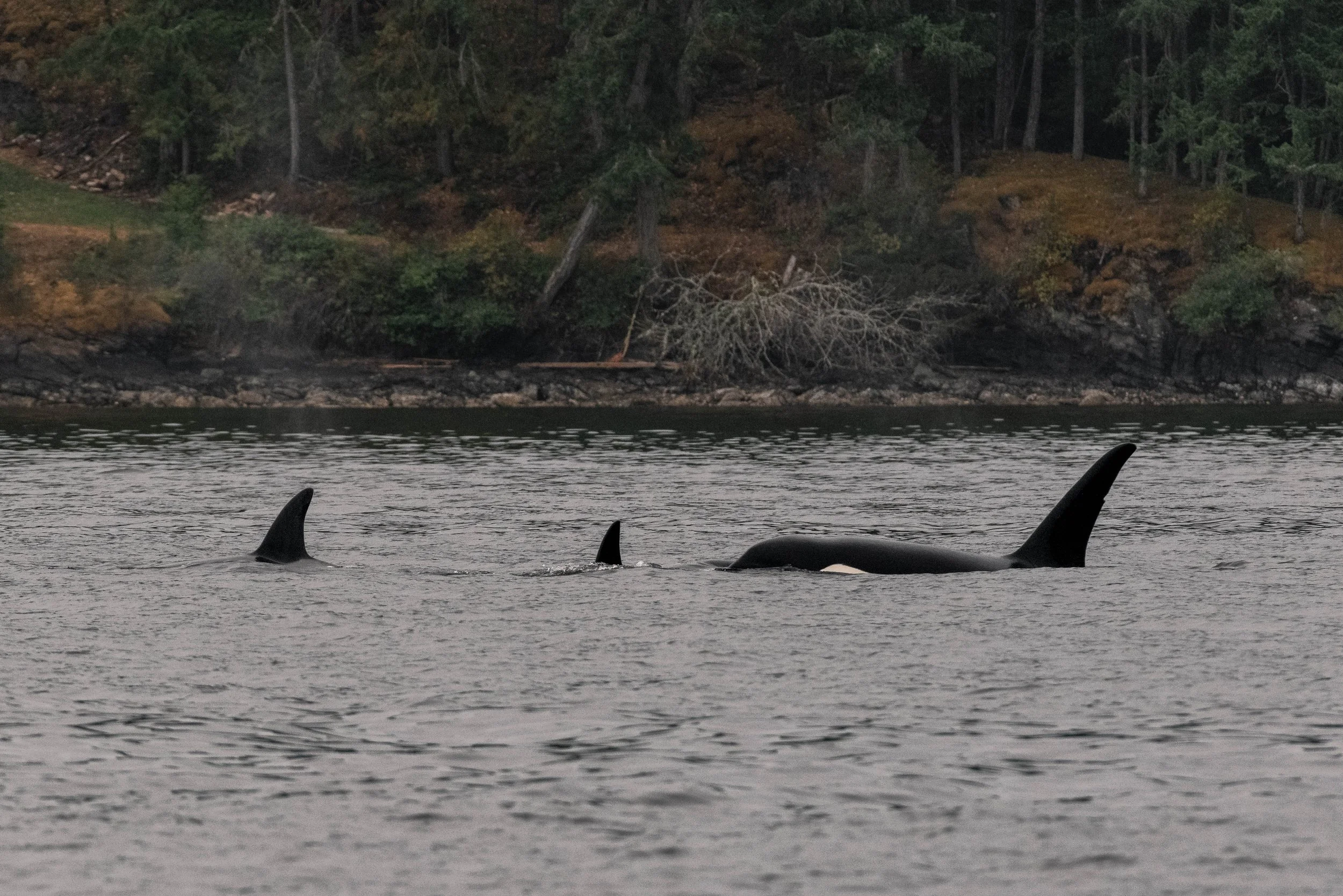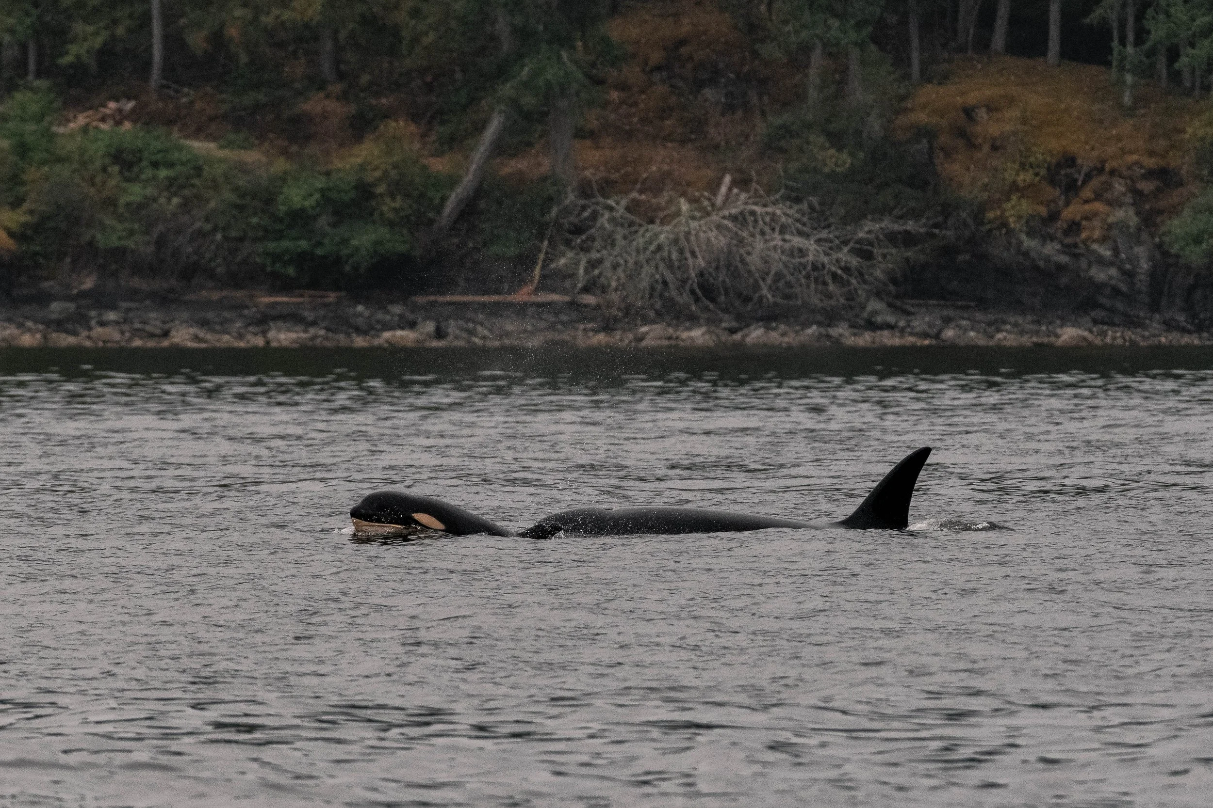 While we observed them, the pod was seen travelling up and down the coastline, crossing close to Paddy Mile Point, before continuing southbound through Sansum Narrows. During their travels, the youngest pod member, T109A8 Weiss, was spotted excitedly breaching (jumping out of the water) amongst their siblings and mother. Just like human kids, orca children are usually extra energetic and curious, exploring their environment and learning how everything works.