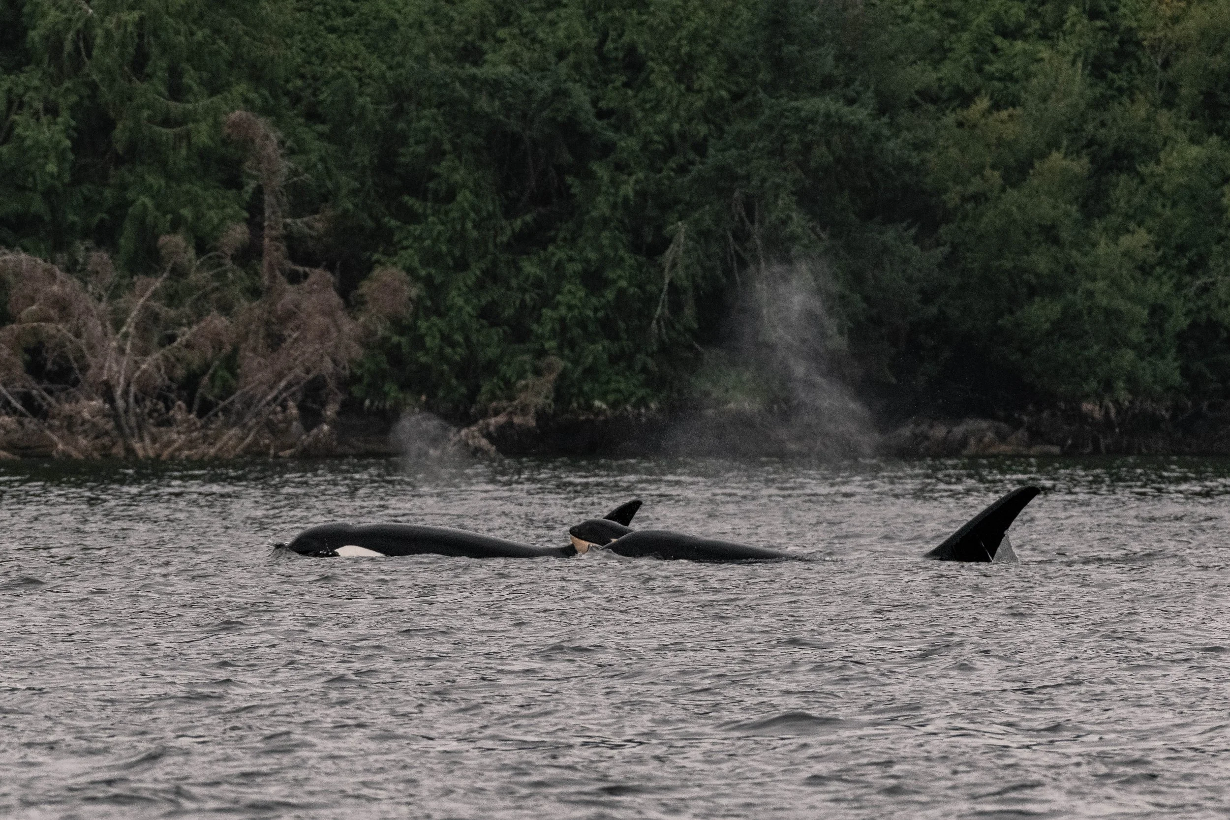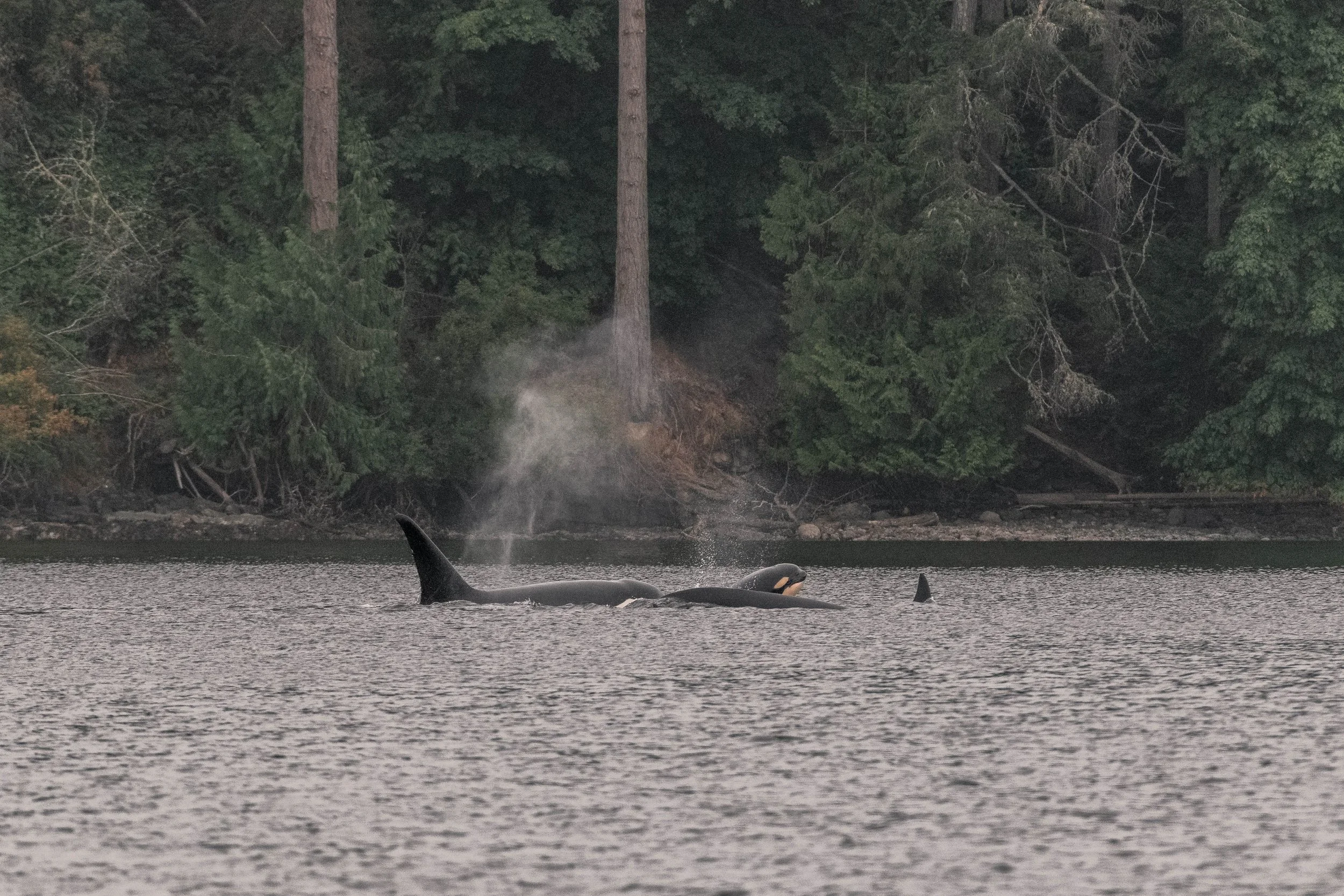 Our journey took us through Sansum Narrows, a beautiful waterway flanked by high, rolling mountains on either side. Nestled between Saltspring Island and Vancouver Island, it is a favourite destination for us, and we are very lucky every time we get to explore it! Today’s destination was a bit further south, in a lovely little area known as Maple Bay. Once in Maple Bay, we began scanning, and that’s when the first blows were spotted, backlit by the shadows of the island behind them! Cameras were pulled out, and the exciting job of identifying the whales began. After comparing dorsal fins, we identified this matriline as the T109As: