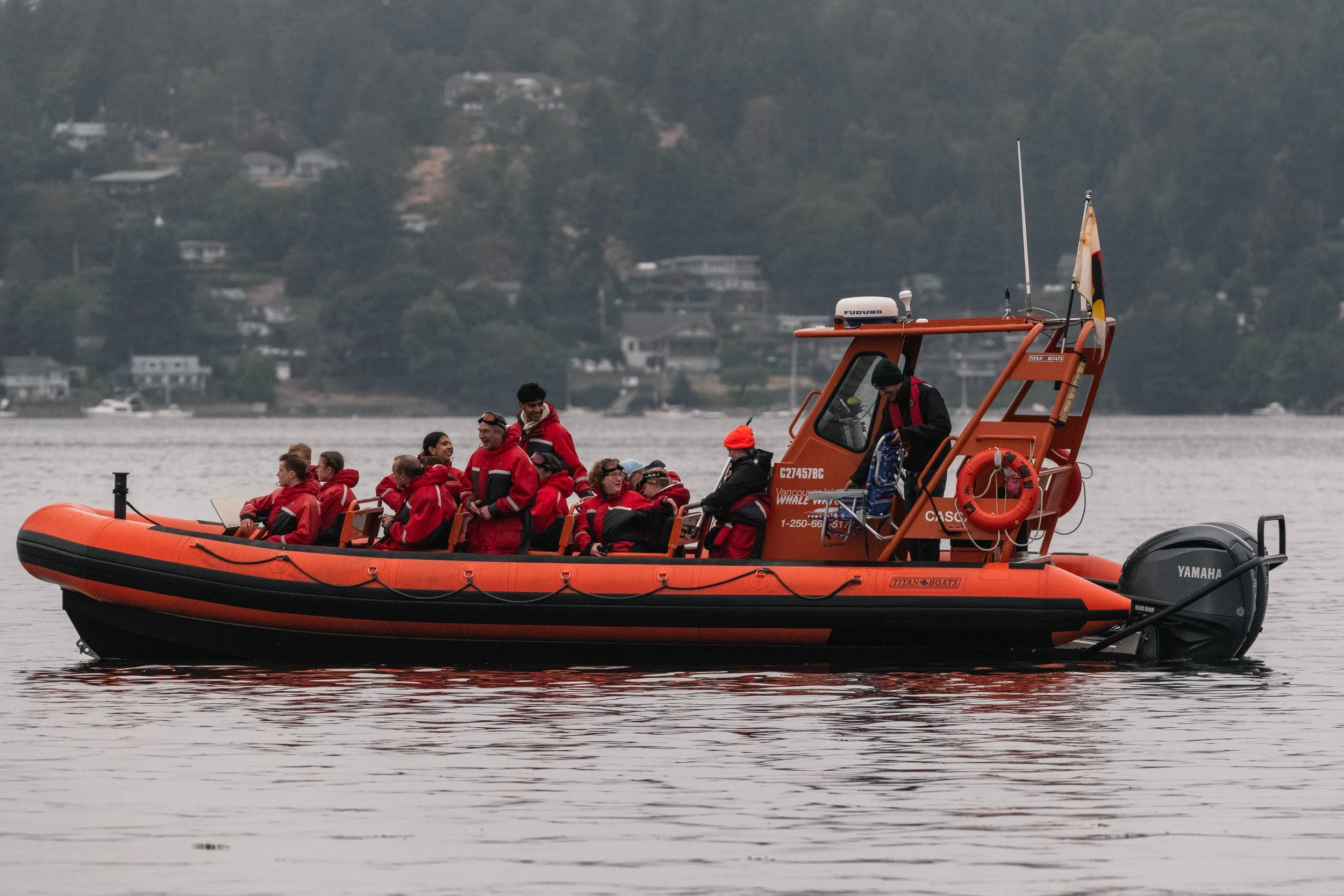 The skies were dark, hinting at the rains to come, but that didn’t dampen our spirits as our fleet headed out to begin searching for whales! Our journey took us southbound, crossing through Dodd Narrows and into the Southern Gulf Islands. We had found a Humpback right on the southern side of Dodd Narrows at the tail end of our morning trip, and we began the search eyeing up the area. We scanned and scanned, but unfortunately, we were unable to relocate it. From there, we continued our way southbound, exploring the beautiful Southern Gulf Islands. Due to the cooler weather, fog had begun to roll in over the islands, leading to a perfect Pacific Northwest atmosphere.