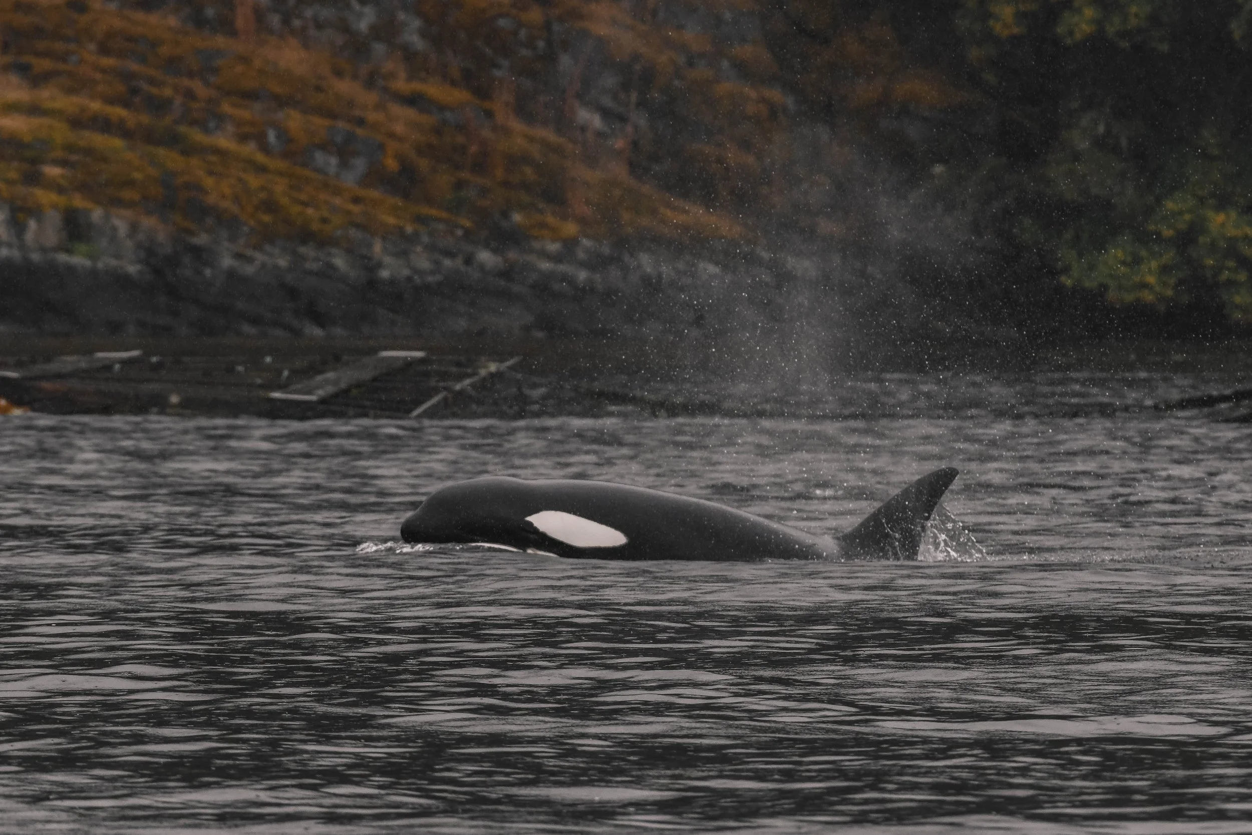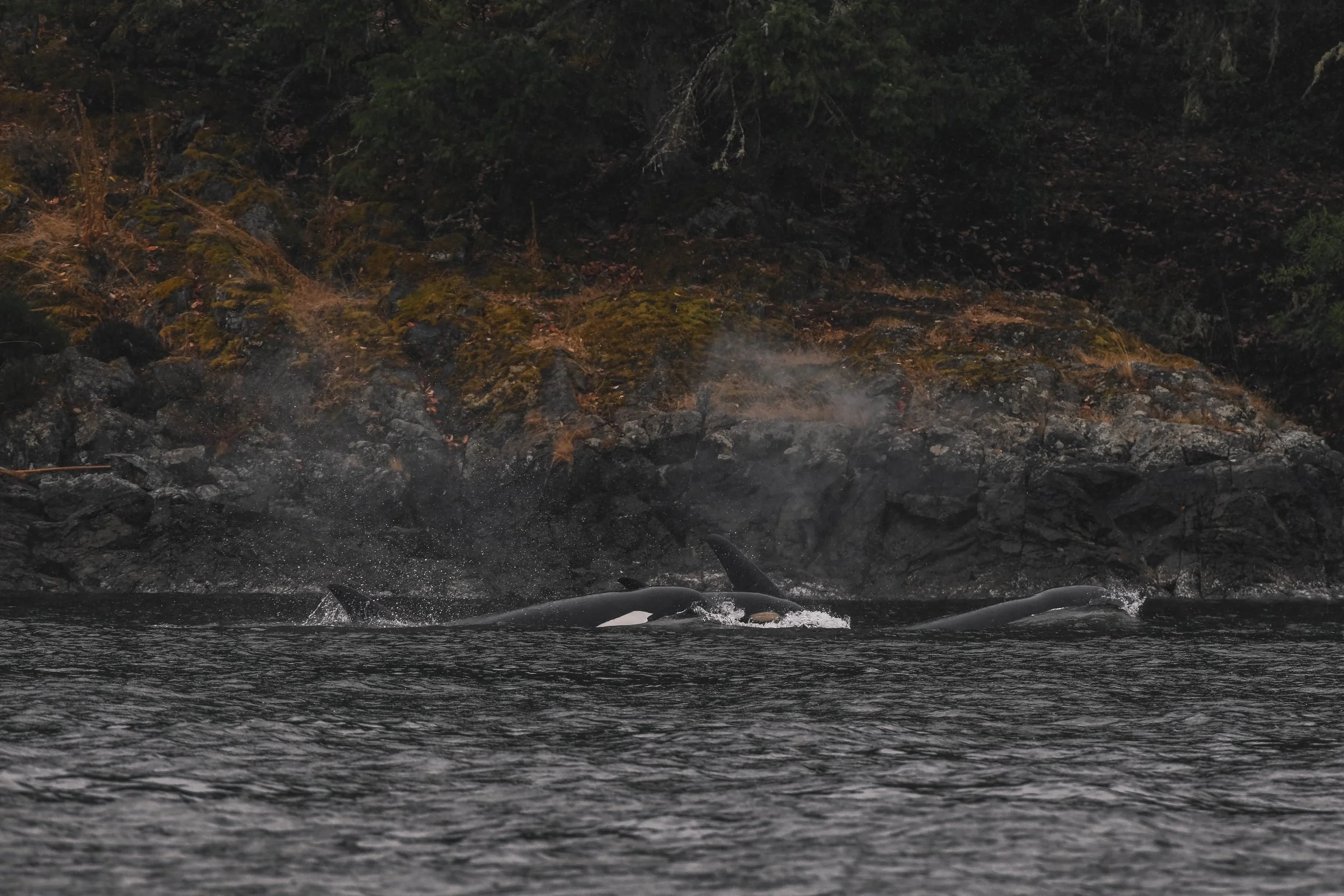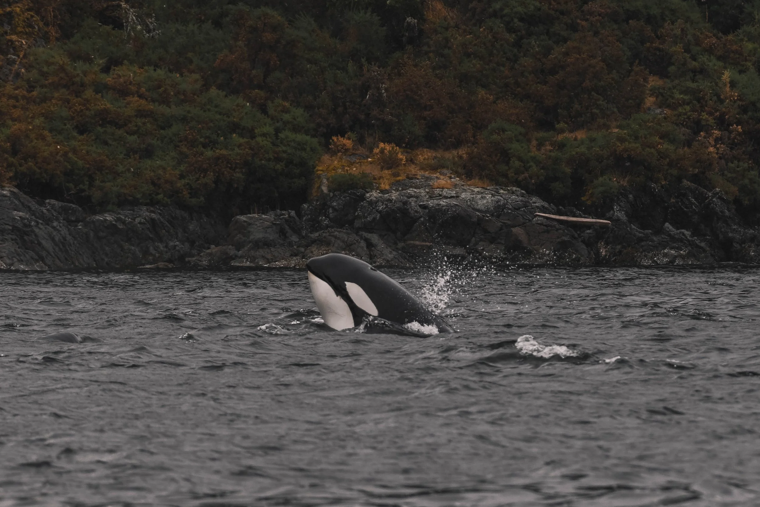 Even though the sky opened up and the rain started pouring down on us, the orca were enough to keep our spirits high. After a hunt, there is usually a celebration, especially when many younger members are present in a pod. They tend to have a bit of extra energy, just like younger humans! These whales kept celebrating for a fair amount of the time we spent with them, breaching out of the water on multiple occasions and even slapping their tails against the surface. These bits of playfulness after a hunt can be important times of socialization for the members of this pod, working to strengthen the crucial bonds that orca families share. Life as an apex predator can be tricky, as there isn’t much room for error in their lives. When hunting, there is a huge amount of energy spent to capture their prey, and if they aren’t successful and don't get to replenish that energy with a meal, it can mean bad things for you. Especially for the populations studied around BC, the persistence of fat-soluble chemicals can cause issues when they have to start burning those fat reserves for energy. When the fat gets burned, it releases those chemicals from their safely stored states into the animal's bloodstream, where they can cause sickness. Luckily, these animals do have a high success rate, allowing them to not have to face these issues very often.