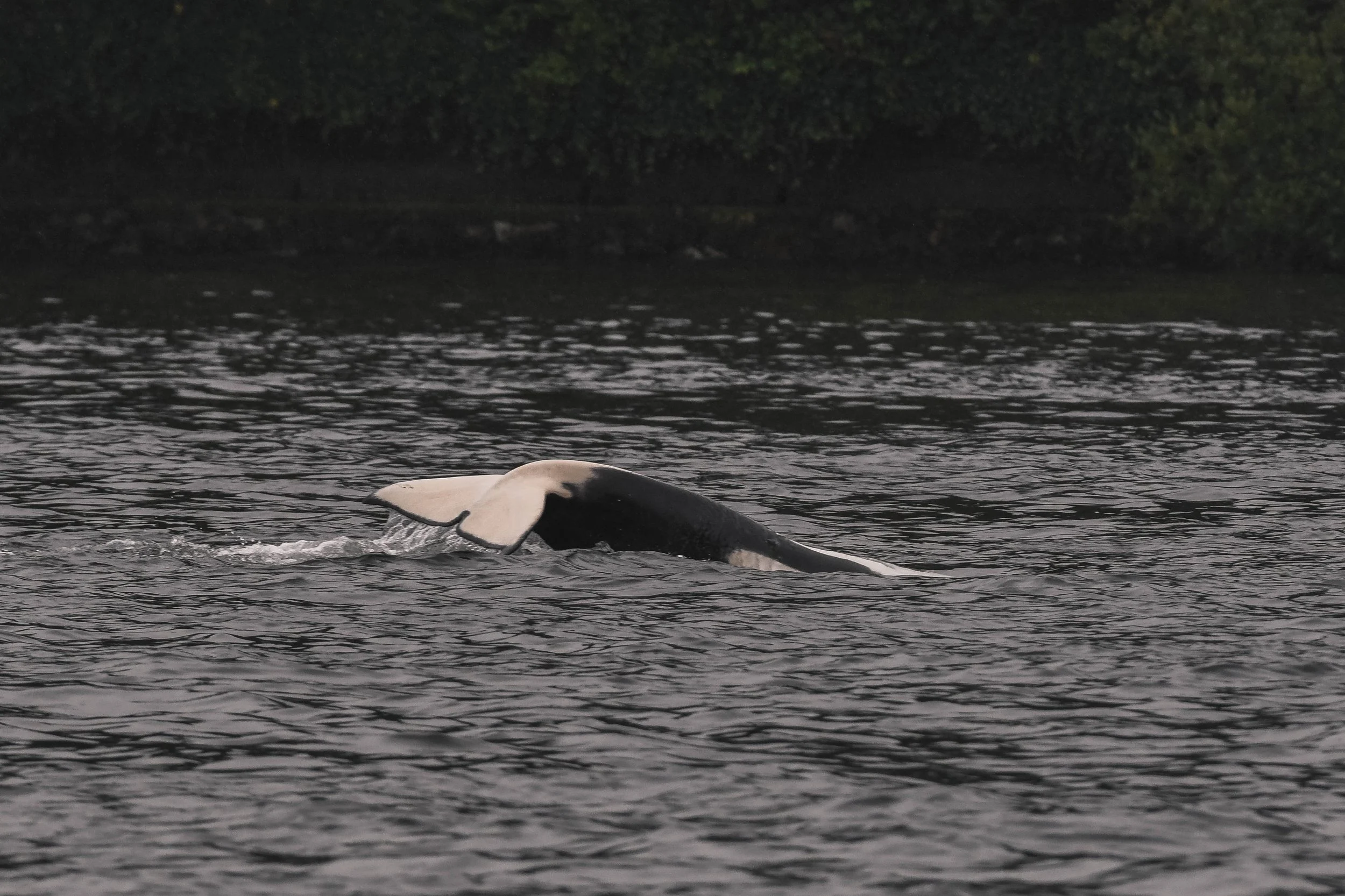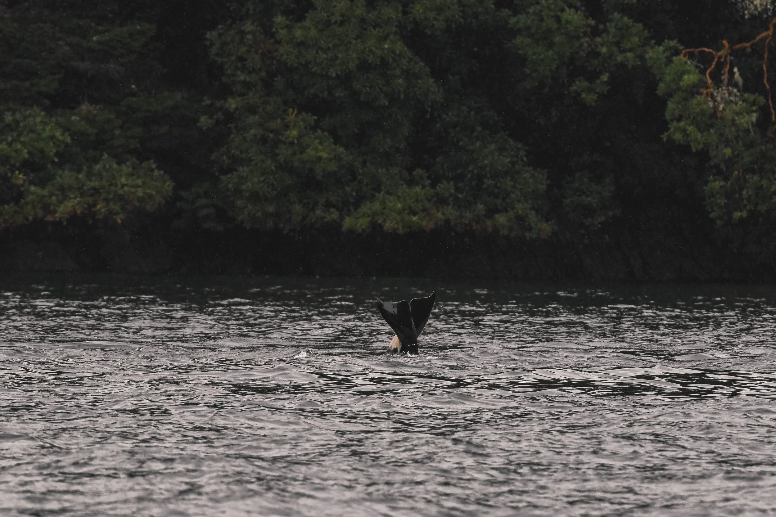 One of the whales tails in the air in the rain. Photo by Aly Kohlman.
