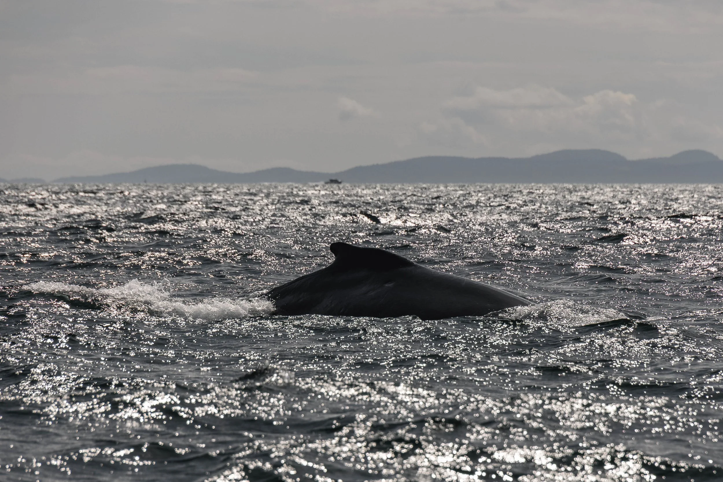 After spending time with them, we continued south and soon came across another pair. This time, it was Bandit (BCX2081) and Hammer (BCY1222), both circling the area in tight turns that suggested more feeding. The calm of the moment didn’t last long, though. Bandit started slapping their massive pectoral fins against the surface of the water! This activity seemed to draw in another humpback whale that was feeding nearby: Barge Boy (KEX0078)! Scientists believe that surface behaviours such as tail slaps, pec slaps, and breaches may be used as a form of long-distance communication. In this case, it certainly seemed to work! What followed was an incredible display of social energy, with one of the whales launching completely out of the water in a full breach, sending spray flying in every direction. For an animal weighing upwards of 35 tonnes, this is no small feat, and it never fails to leave everyone on board in awe.