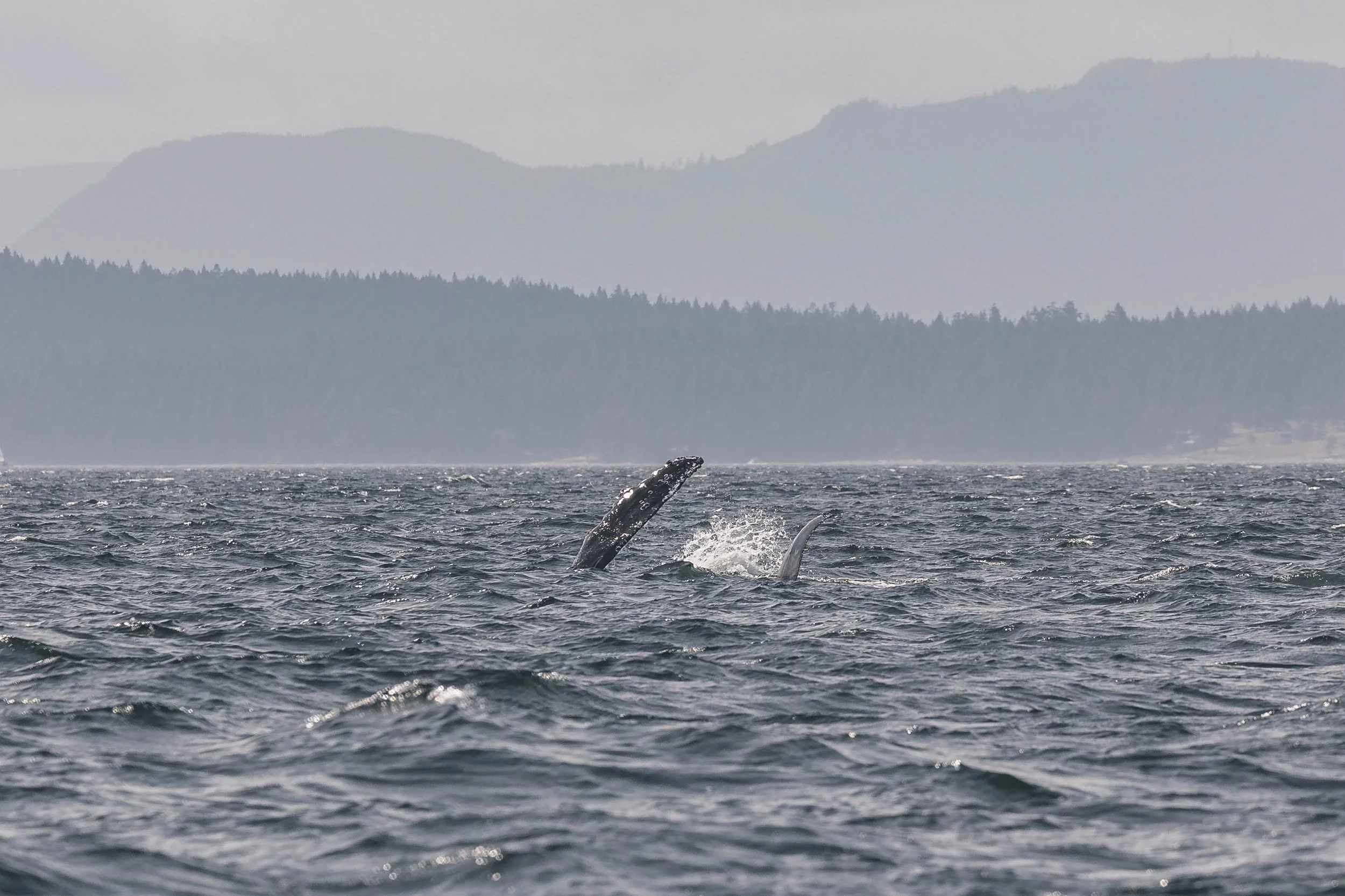 As the afternoon rolled on, we thought our whale encounters might be wrapping up, but the Strait had more in store for us. Near the end of our trip, another pair surfaced, this time it was Kappa (BCX0158) and her calf, Kappiroto (BCX0158calf2025). Calves often bring a burst of playfulness to the day, and today was no exception. We watched as the young whale cartwheeled at the surface, flipping its tail and body high into the air before splashing down with boundless energy. While calves practice these behaviours as play, they are also building strength and coordination that will serve them in adulthood. After their acrobatics, mother and calf settled into more typical feeding behaviour, diving together in synchrony.