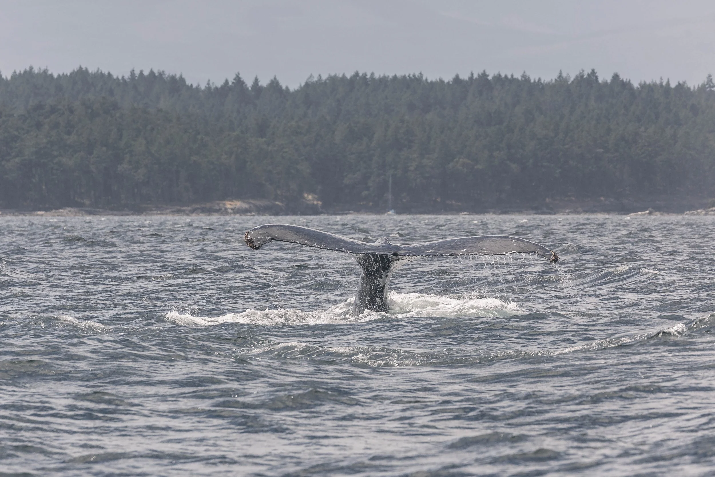 Just north of Gabriola Island, tall bushy blows broke through the chop of the water, and our naturalists quickly recognized two familiar fins. It was Honu (BCX1856) and Moresby (KEY0055), a pair of humpback whales, that have been spending time in the area this season. Both were busy feeding, rising to the surface with strong, steady exhalations before diving again to search for schools of small fish and krill below. Humpbacks use a variety of strategies to feed, from lunging upward through bait balls to trapping prey in bubble nets. While most of this feeding activity happens beneath the surface, the tall plumes of mist and occasional tail fluke give us a glimpse of the effort.
