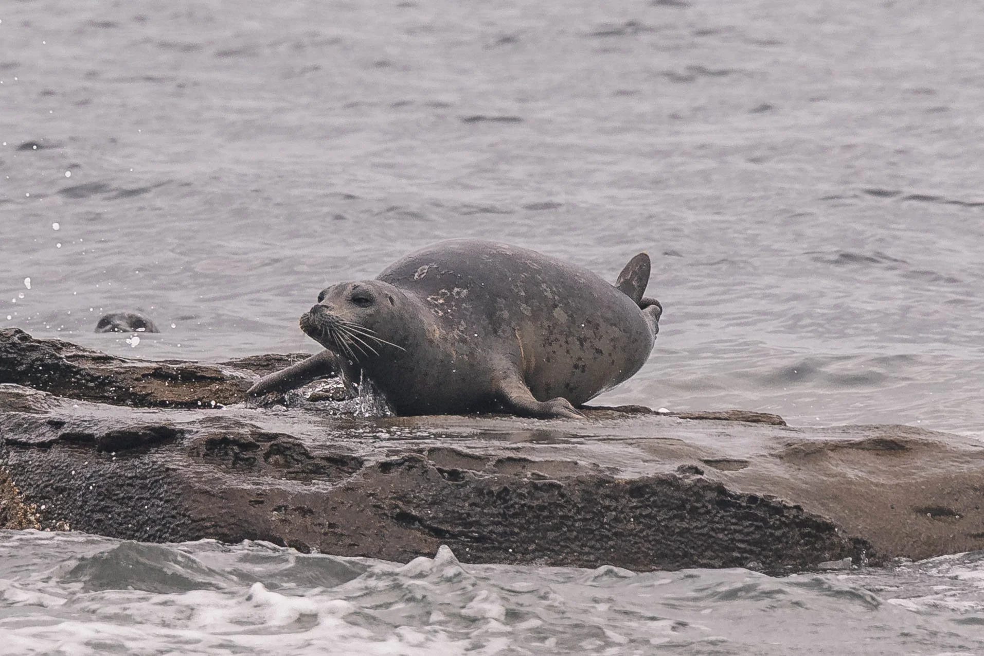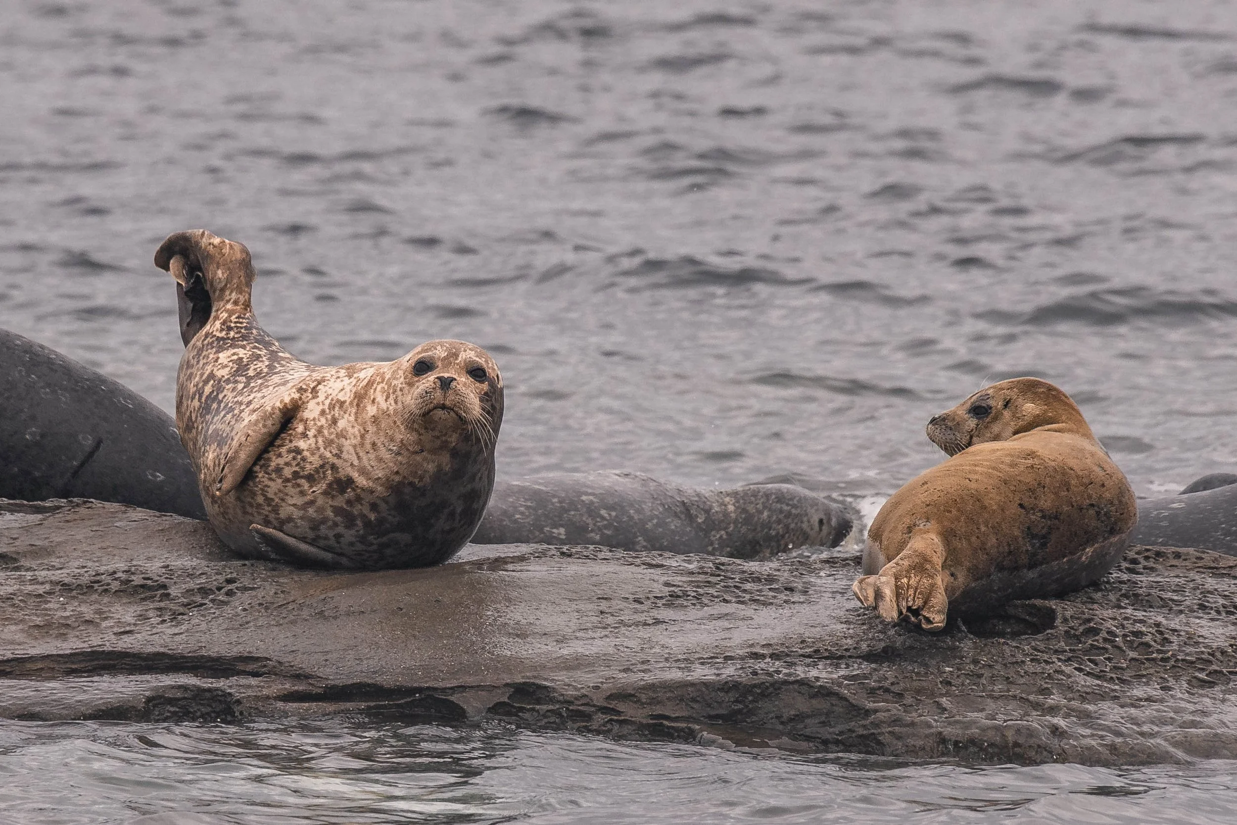 While the whales are, of course, the primary focus of the trips, we are always eager to explore around and see what other wildlife can be found as well. Our exploration took our vessels to two different places where they got to see Harbour Seals! Kula stopped over at the Halibut Bank ODAS buoy, and Cascadia popped over to Seal Rock. The ODAS buoy is not a usual spot for our Harbour Seals to haul out, but today there was one little seal perched high up on the marker, curiously eyeing us up. At Seal Rock, the pinnipeds were busy snoozing and stretching away. Kula also had one last quick stop at the White Islets to take a peek at some Steller Sea Lions meandering along the shores before heading back to home port.