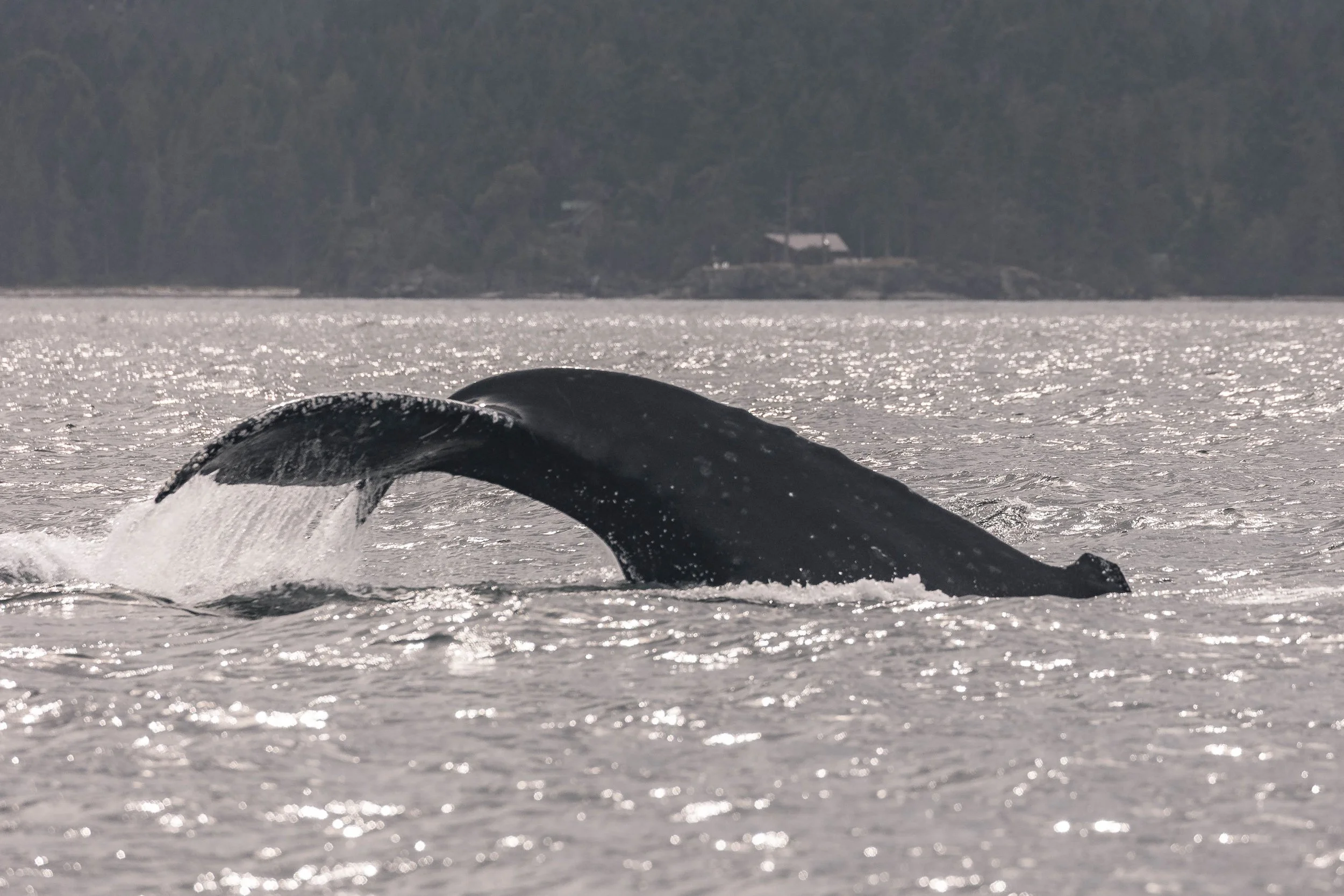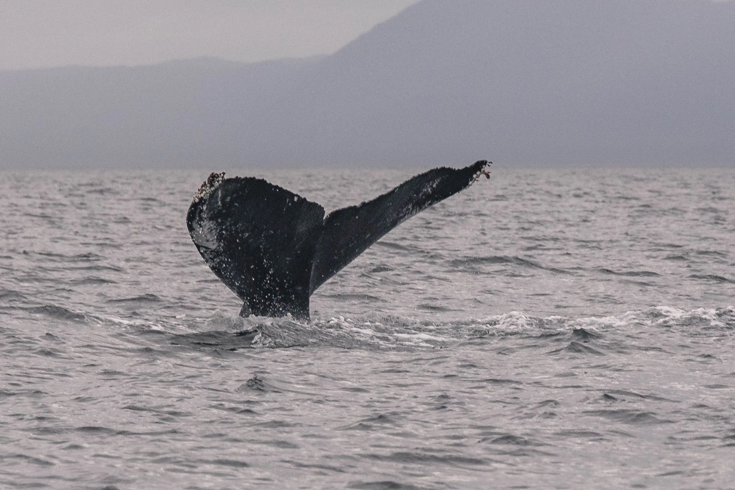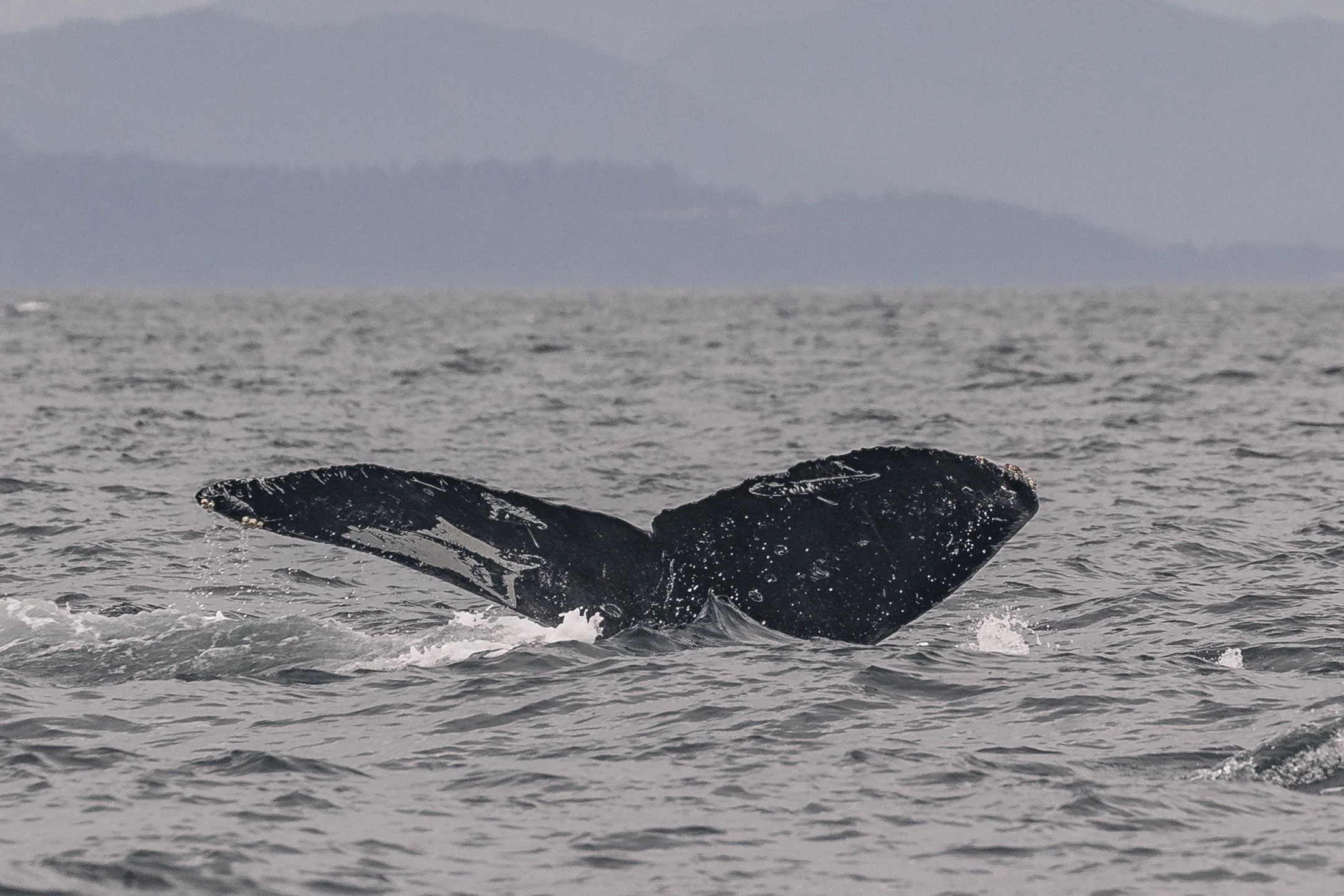 While Kula spent time with Smoke and Forge, Cascadia found a humpback of their own. This young whale was identified as Moresby (KEY0055), the 2022 calf of legendary Big Momma (BCY0324). Moresby was busy doing deep dives, likely foraging for krill or small schooling fish down in the depths. After grabbing a few confirmation photos, Cascadia continued on their way, leaving Moresby to their meal!