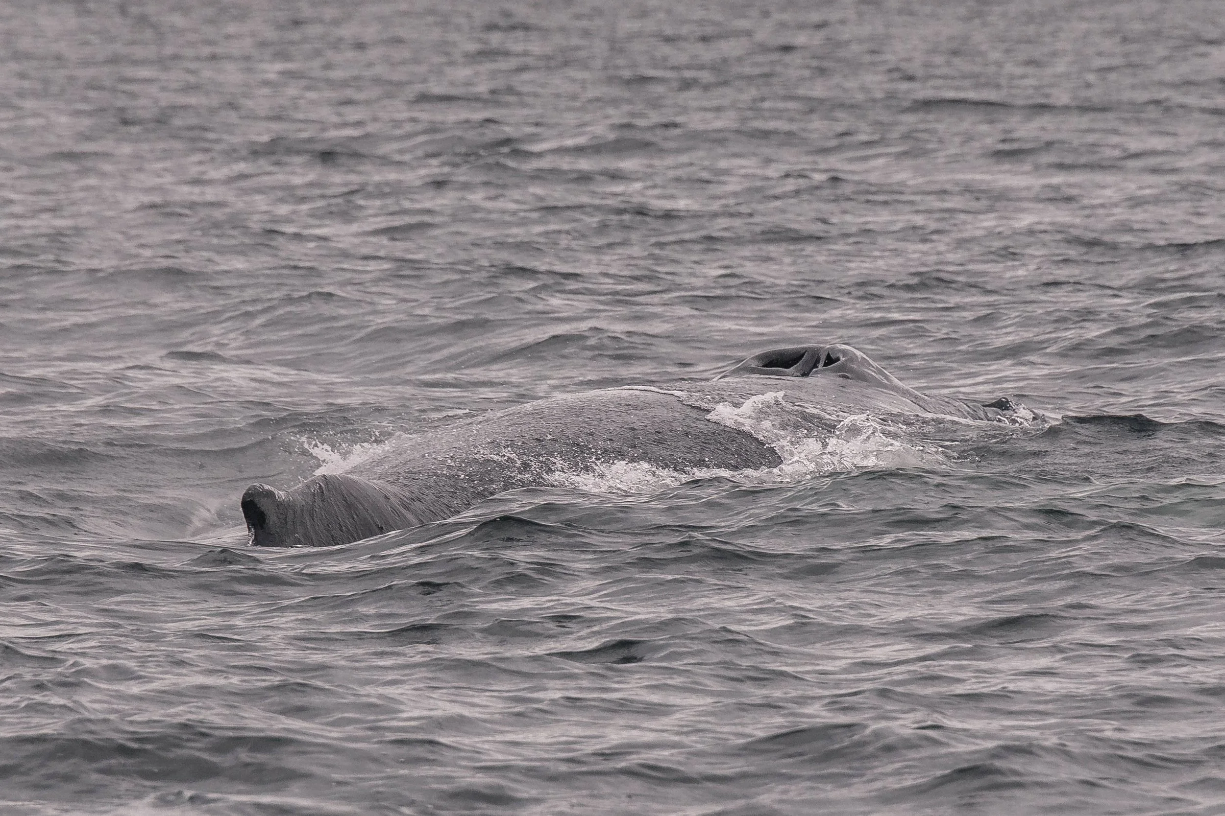 Our semi-covered vessel, Kula, was the first vessel to find whales today. This pair had both distinct flukes and dorsal fins, making them great whales to identify. After taking some photos, we confirmed that these two were Smoke/Squirrel (BCX2183) and Forge (BCZ0410 calf of 2022), two younger whales who have returned to our area regularly over the past few years. These two were busy napping away as we watched. Napping in humpbacks is generally referred to as Logging, as the whales will stay relatively still, only rising to the surface occasionally to breathe. Logging can be dangerous for them, though, which may sound a bit odd. If they are sleeping (a pretty normal behaviour if you ask us), why would they be in any danger? The problem with logging is that the whales live up to the name while doing it - they look very similar to logs in the water. Depending on the individual, they may even sink a couple of feet into the water while they doze, rendering themselves nearly invisible. The danger in this is that they can be very hard to detect if you are travelling along on a boat, and sadly, many humpbacks have become injured or have passed away due to accidental impacts. Because of this, we always encourage anyone travelling in our area to follow the motto: “If you see a blow, go slow.” Give any wildlife extra space, as you never know when they may change their direction or behaviour, and it is much easier to stop if you are going slow than fast!