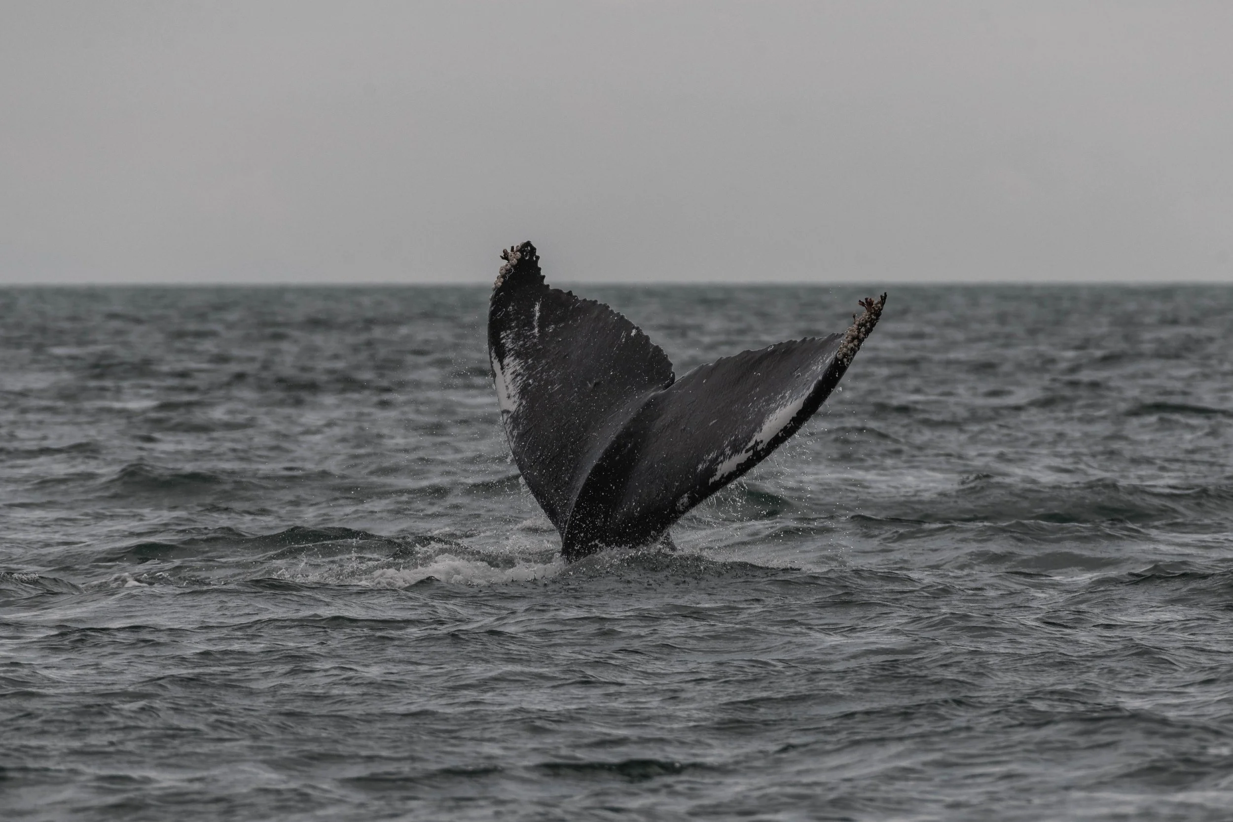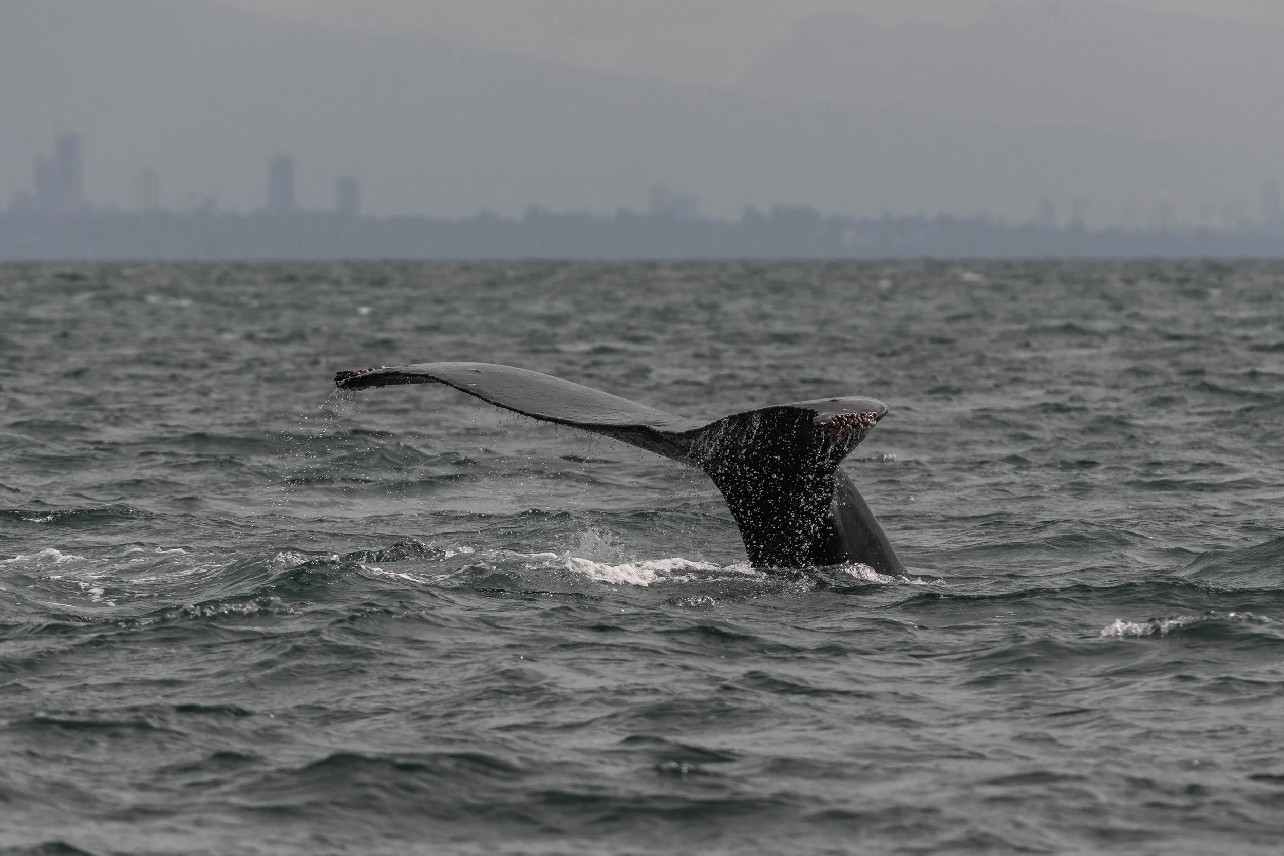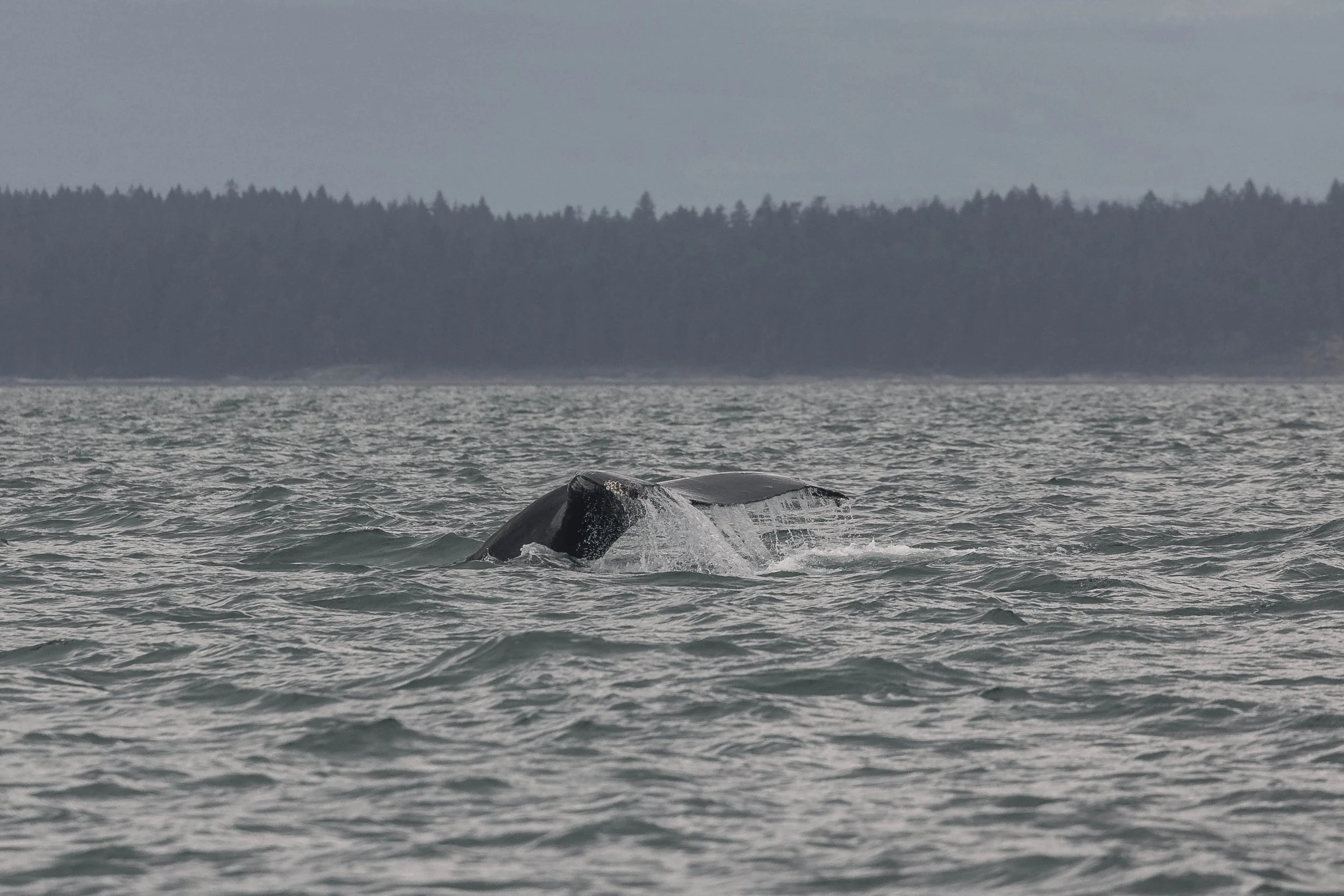 It was another humpback whale that we found next, and their behaviour couldn’t have been more different from Barge Boy’s sleepiness. It was Honu (BCX1856), and they seemed to be very full of energy. We saw Honu flicking their tail as they dived, slapping their pectoral fin against the water's surface, and rolling around at the surface. This playful behaviour is essential not only as a way to have fun, but it also helps them build their strength and practice maneuvering through the water. Watching these sorts of displays is always entertaining and awe-inspiring, as it requires an incredible amount of energy to perform such activities.